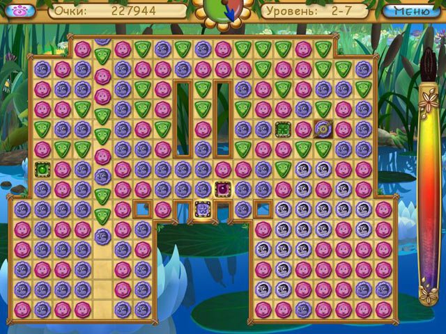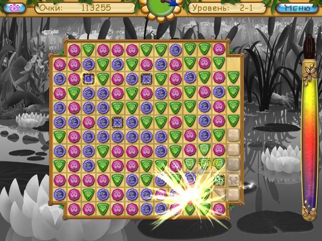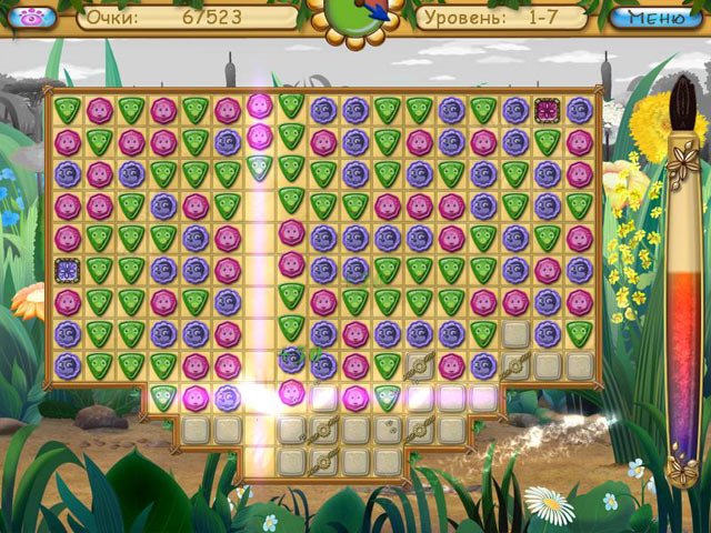 Лунтик. Пропавшие краски — это очаровательная головоломка в жанре "три в ряд" (match-3), которая идеально подойдет как для маленьких фанатов мультфильма, так и для взрослых, жаждущих ностальгии и легкого геймплея без стресса. Ваша задача — кликать по группам из трех и более одинаковых самоцветов, чтобы освободить заточенные внутри них краски. Звучит просто? А вот и нет! На вашем пути будут встречаться хитрые препятствия вроде блоков, которые нужно разрушить, или баночек с медом, которые надо аккуратно спустить вниз уровня. Каждый уровень — это новая мини-головоломка, требующая смекалки и стратегического мышления. Забудьте про "Кэнди Краш", здесь всё серьезнее — тут спасают целый мир от хроматической депрессии!