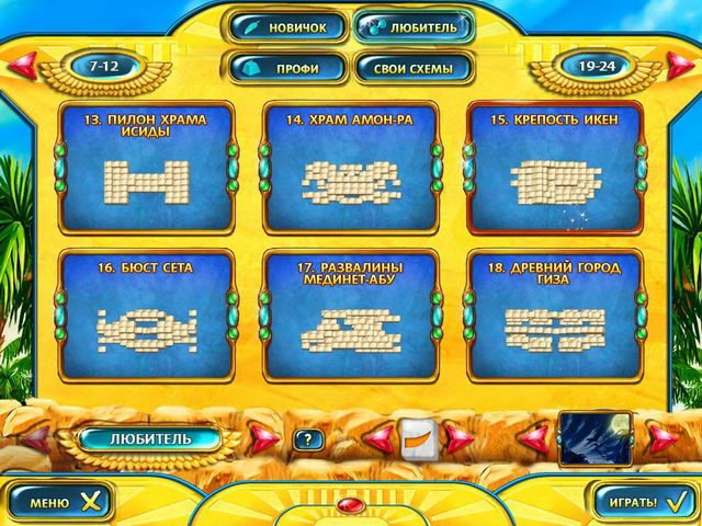 Забудьте про Индиану Джонса и его шляпу — настоящий искатель приключений вооружен не кнутом, а острым взглядом и нервами из крокодиловой кожи! Встречайте Маджонг. Древний Египет — это не просто игра-головоломка, это ваш личный билет в мир загадочных пирамид, пыльных катакомб и хитроумных головоломок, оставленных древними жрецами специально для таких умников, как вы. Ваша миссия? Найти затерянный храм бога Осириса, но вместо того чтобы бегать по пустыне с компасом, вы будете разгадывать сотни раскладов маджонга, где каждая пара одинаковых фишек — это шаг к великой тайне. И поверьте, эти фишки хитрее любого сфинкса!