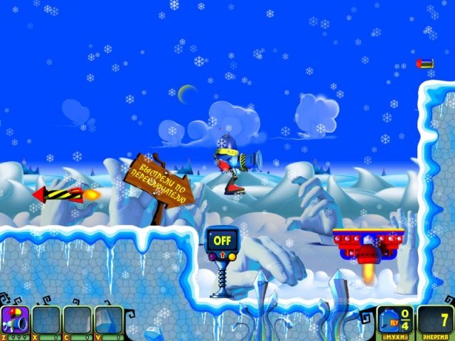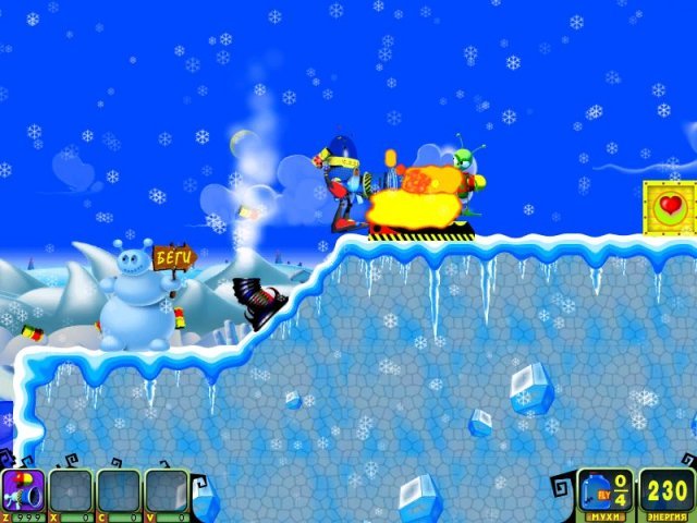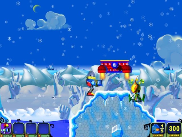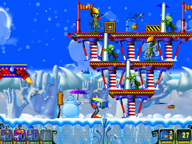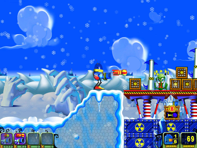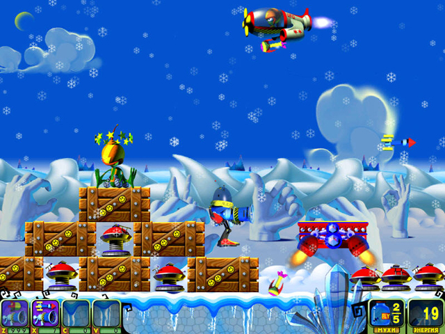 Геймплей Мухоноида — это чистая, незамутненная аркадная радость. Вы управляете вашим механическим героем, который стреляет ракетами (или чем-то очень на них похожим) по полчищам кровожадных пришельцев. Цель проста: уничтожить всех врагов на уровне и найти спрятанных в укрытиях ваших подопечных — беззащитных мушек. Каждый из множества уровней предлагает новые ловушки, новых типов противников и всё более изощренные головоломки по спасению. Это идеальный микс экшена, стратегии и ловкости, который отлично подходит как для коротких перерывов, так и для долгих игровых сессий. Игра прекрасно сбалансирована: достаточно сложна, чтобы быть интересной, но не настолько, чтобы вызывать желание швырнуть мышку в монитор.
