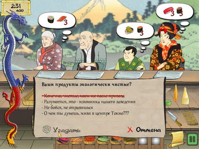 Ваша задача — превратить скромную закусочную в самое популярное место на весь район, где гурманы со всего света будут выстраиваться в очередь за вашими шедеврами японской кухни. Геймплей Последнего испытания самурая прост, но от этого не менее захватывающе: вы будете нарезать свежайшую рыбу для сашими, сворачивать рис и нори в безупречные роллы и комбинировать до пяти ингредиентов в одном блюде, чтобы удовлетворить самых привередливых посетителей. Каждый новый уровень — это новое испытание на скорость, точность и память. Сможете ли вы одновременно приготовить маки для старушки, спешащий заказ темпуры для бизнесмена и экзотический сет для загадочного путешественника? Это ваш шанс доказать, что истинный самурайский дух можно проявить даже в кулинарии!