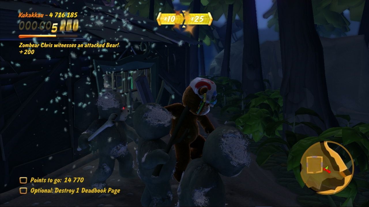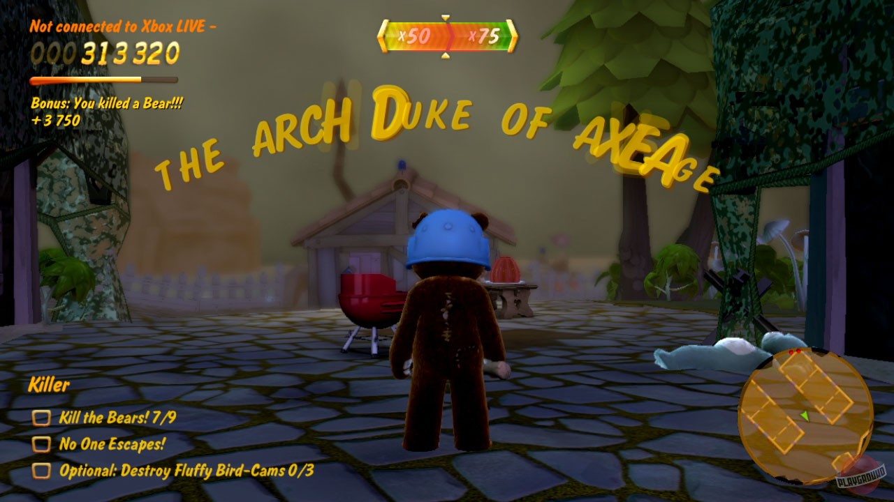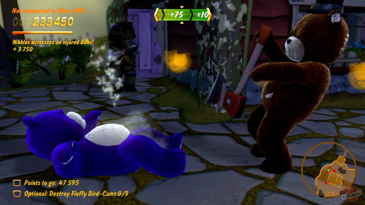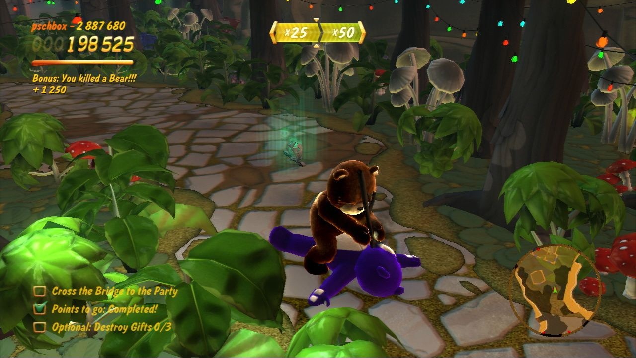 Ваша основная задача в Naughty Bear — зарабатывать «Очки непослушания», и делаете вы это самым изощрённым образом: устраивая ловушки, используя подручные предметы (от кухонных ножей до газонокосилок и даже пчёл!) и применяя тактику запугивания. Геймплей построен на выполнении миссий на 30 уровнях, разбросанных по четырём зонам острова. Вы не просто убиваете других медведей — вы должны делать это стильно, креативно и максимально болезненно, чтобы набрать больше очков и открыть новые, ещё более извращённые способы расправы. Игра напоминает смесь чёрного юмора «Конкера» и жестокости фильмов ужасов, но в абсолютно плюшевом антураже. Каждое ваше действие комментирует саркастичный голос за кадром, который только подогревает атмосферу абсурда и веселья.
