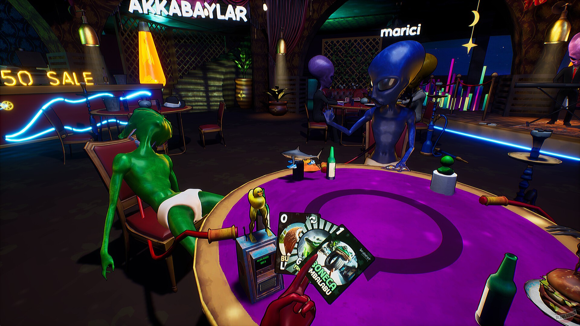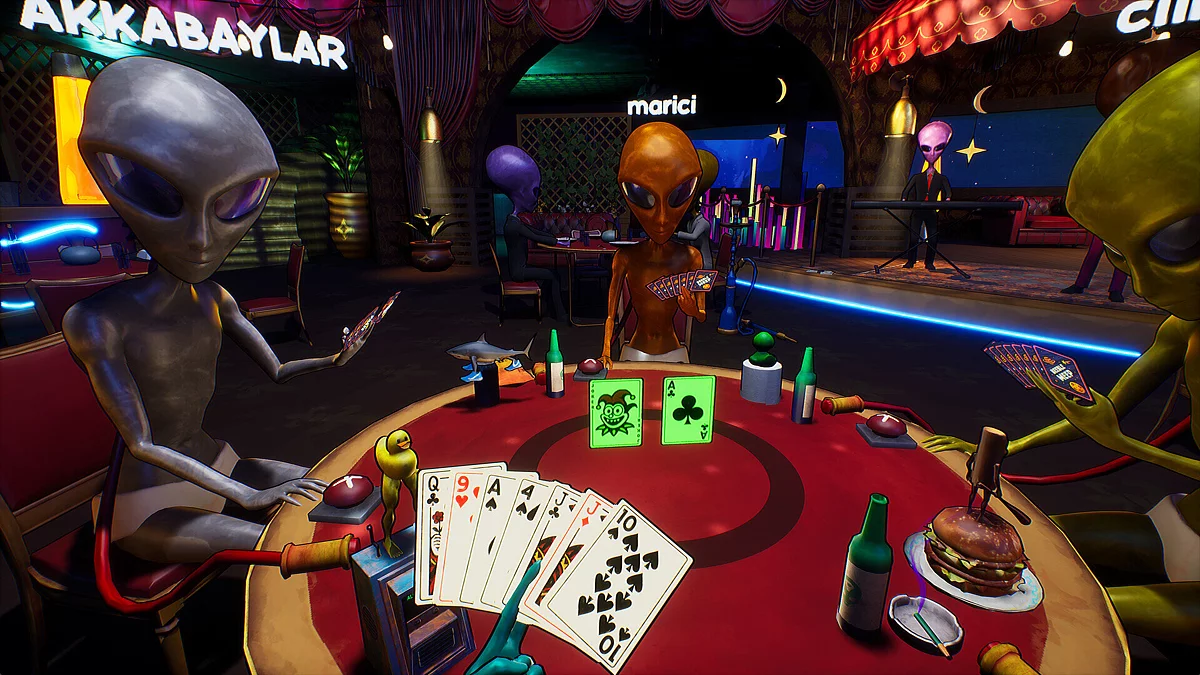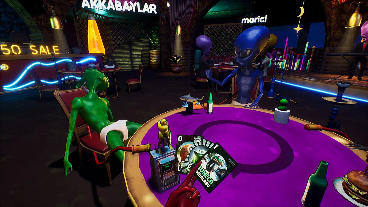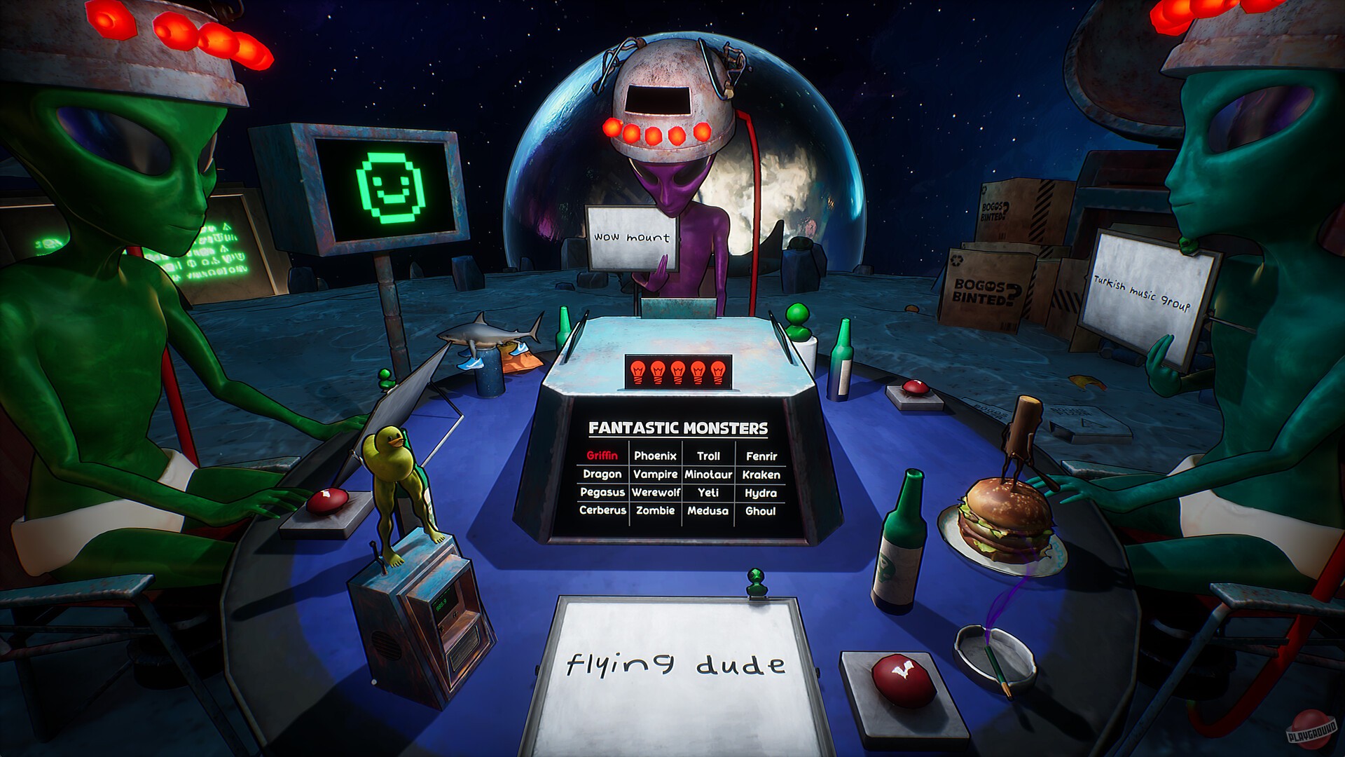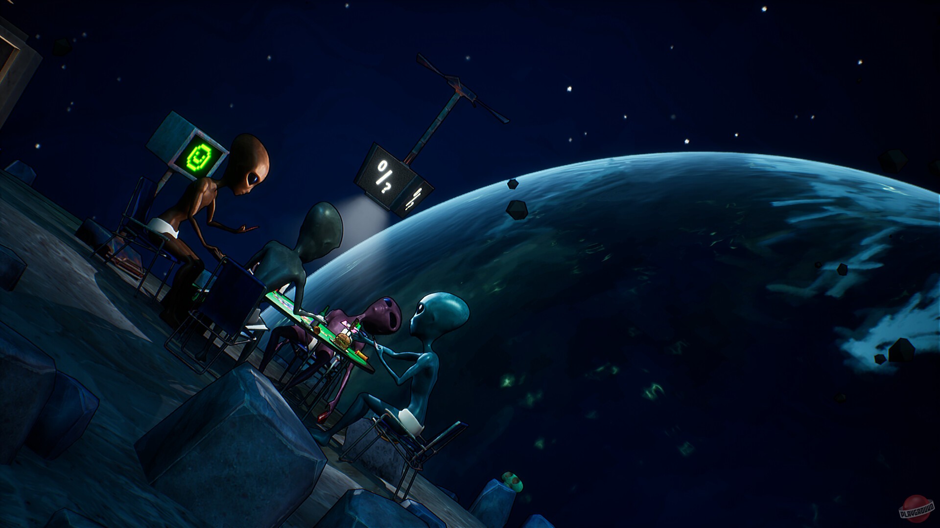 Кооперативная карточная игра, в которой инопланетяне не изучают Землю, а собираются на Луне ради безумных настольных баталий. Каждый участник — воплощение абсурдного галактического юмора, где правила меняются по настроению, а победа нередко достаётся самому наглому. Всё пропитано духом странных шуток, кривых улыбок и весёлого хаоса.