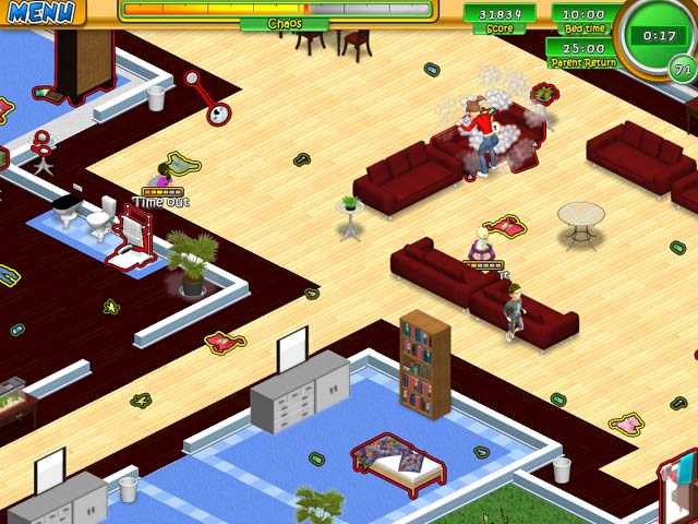 Готовы ли вы променять спокойную жизнь на хаос, вопли и горы игрушек? Тогда встречайте Babysitting Mania — тайм-менеджер, который заставит вас почувствовать себя героем боевика, только вместо пистолетов у вас подгузники, а вместо взрывов — катастрофические последствия разлитого сока на белом диване! В этой безумной аркаде вы берете на себя роль начинающей няни, чья миссия — не просто присмотреть за малышами, а выжить в настоящем водовороде задач. Ваша цель проста: навести порядок в доме, накормить всех голодных ртов, успокоить плачущих, развлечь скучающих и уложить всю эту шумную компанию спать до того, как вернутся родители. Звучит легко? Попробуйте сделать это, когда один ребенок рисует фломастерами на обоях, второй устраивает бассейн из детской ванны, а третий уже залез на люстру!