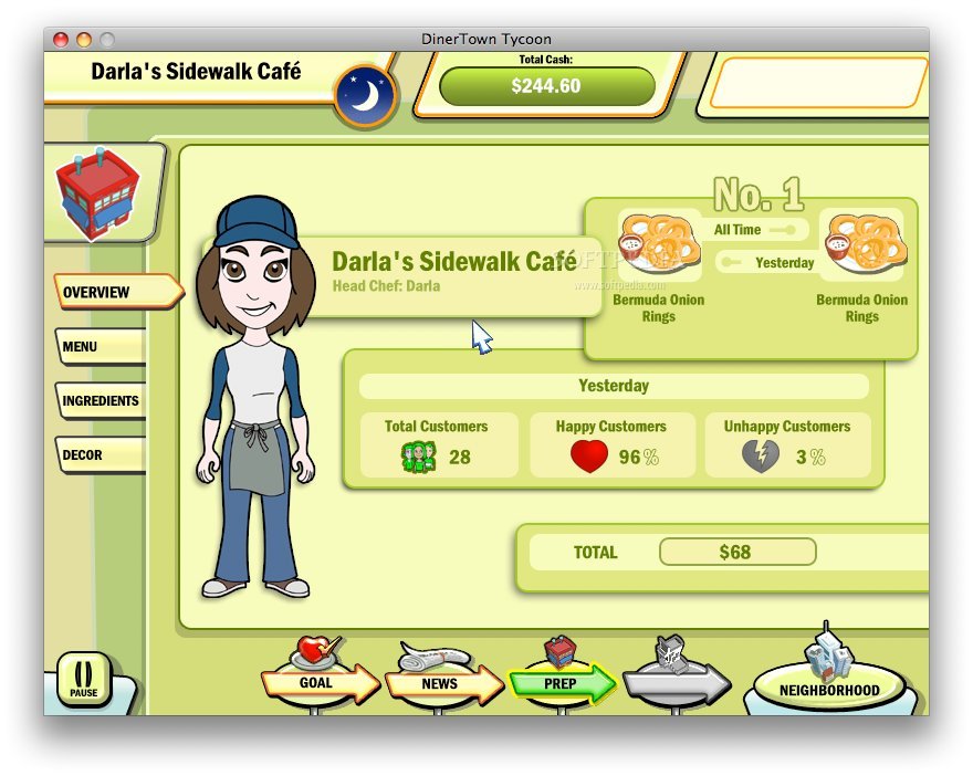 Игра предлагает вам окунуться в яркий и забавный мир, знакомый по культовой серии Diner Dash. Вы встретите более 25 обожаемых персонажей, каждый со своими причудами и предпочтениями. Ваша задача — не просто накормить их, а угадать, чего они хотят: свежего салата из Thyme Square или, может быть, морепродуктов из Bistro Bay? Геймплей DinerTown Tycoon — это идеальный микс стратегического планирования и быстрой реакции. Вам предстоит не только выбирать из более чем 90 рецептов для своего меню, но и грамотно устанавливать цены, чтобы конкурировать с Grub Burger, закупать свежие ингредиенты, обновлять интерьер и запускать рекламные кампании. Каждое из пяти уникальных районов DinerTown требует своего подхода, так что скучать не придется!