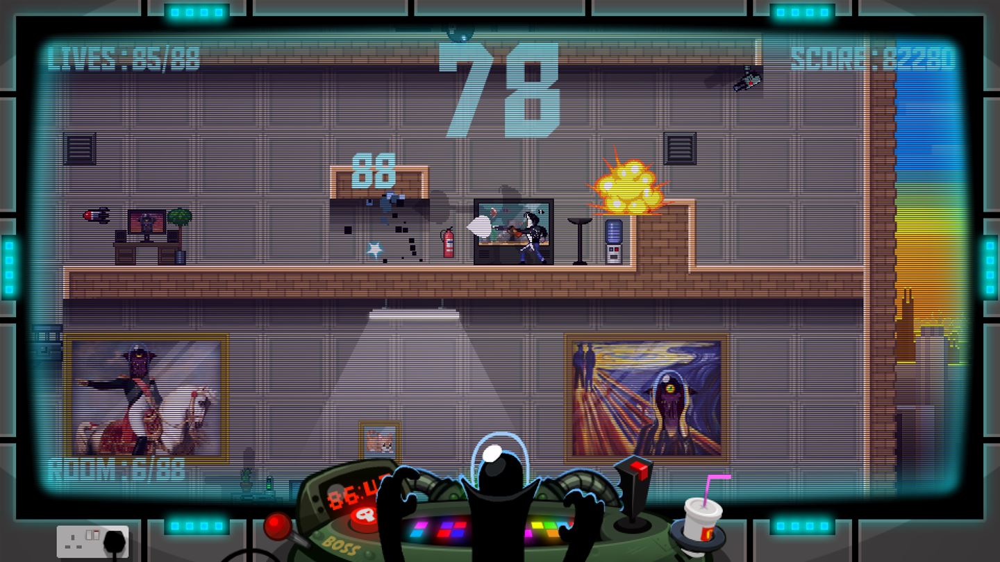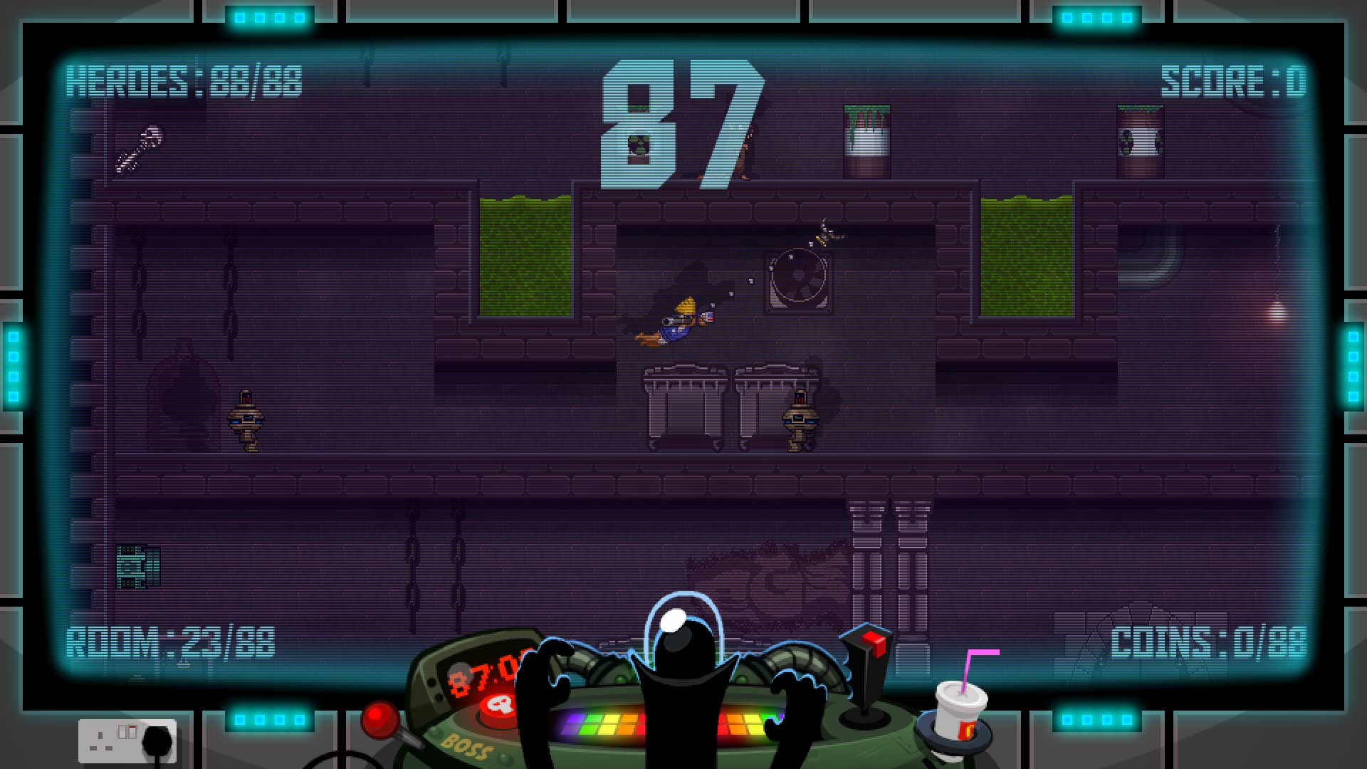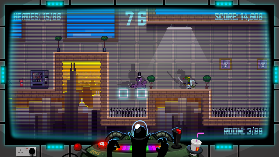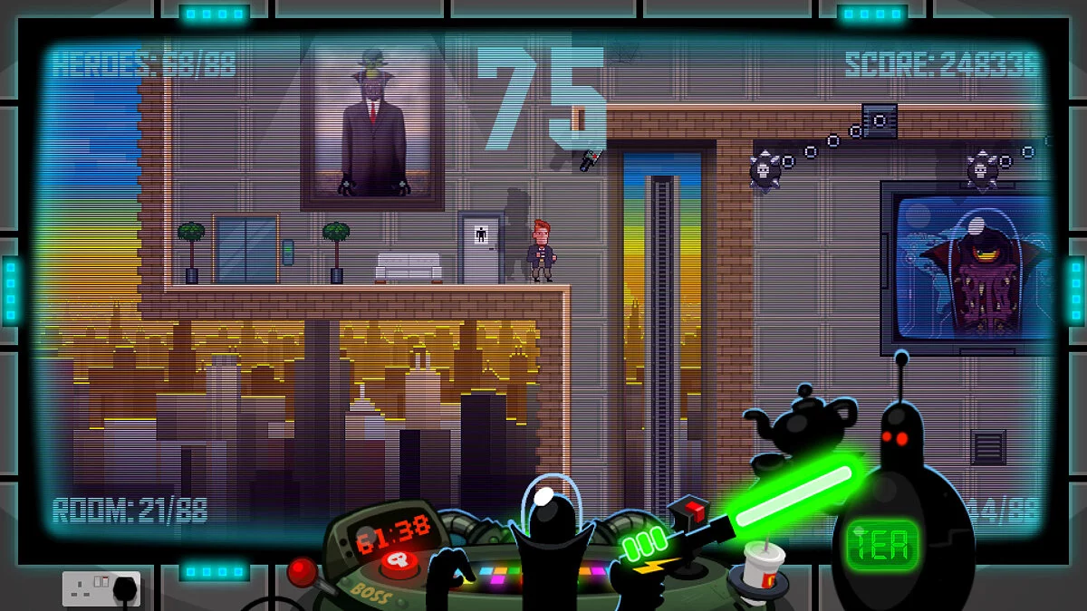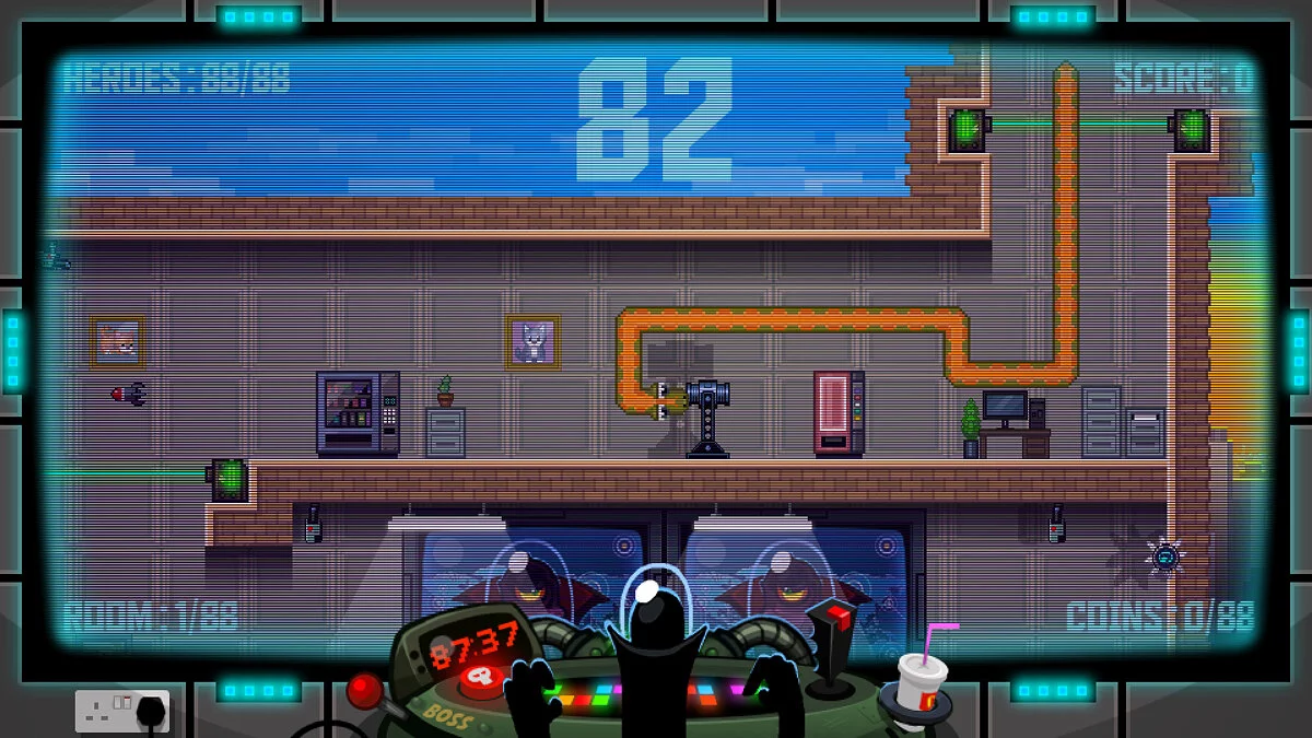 Суть геймплея 88 Heroes проста, как дважды два, но при этом гениальна. У вас есть ровно 88 минут, чтобы пройти все 88 уровней и победить злодея Доктора Гениуса. Каждый раз, когда вы погибаете или успешно завершаете уровень, игра подкидывает вам нового героя из своей огромной коллекции. И поверьте, эти 88 персонажей — это не просто набор скинов. У каждого своя история, свой стиль и, конечно же, свои причудливые способности. Тут вам и йог, который может проходить сквозь стены, и пожарный, тушащий всё на своём пути, и даже... хм... парень в костюме хот-дога. Да-да, вы не ослышались. В мире 88 Heroes быть хот-догом — это вполне достойная профессия для героя. Такой подход делает каждый запуск игры непредсказуемым и заставляет вас постоянно адаптироваться, превращая прохождение в увлекательную головоломку с элементами рогалика.