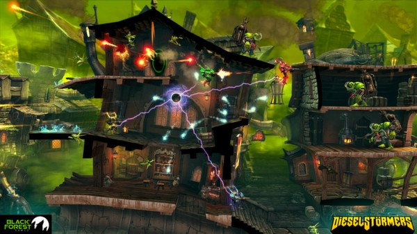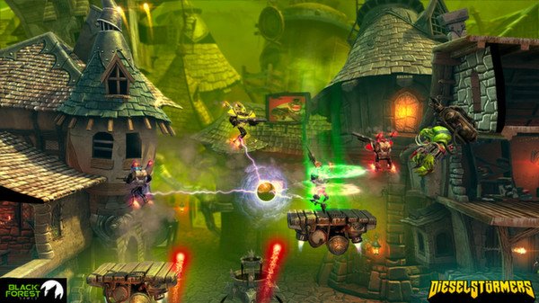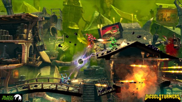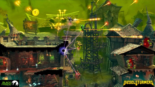 Забудьте про унылые будни и погрузитесь в безумный мир DieselStormers — это не просто run 'n' gun аркадный платформер, это настоящий дизельпанковский карнавал хаоса для до четырех отчаянных смельчаков! Представьте себе: вы — рыцарь в гигантских металлических ботинках, вооруженный до зубов пушками, которые, кажется, способны отправить на тот свет даже самого Брюса Уиллиса из «Крепкого орешка». Ваша миссия? Очистить город Рейвенсдейл от орды зеленокожих Орков, которые, судя по всему, решили, что их место под солнцем — прямо у вас в гараже. И да, все это происходит в мире, где эстетика 1940-х годов смешалась с паром, шестеренками и здоровенной порцией безумия.