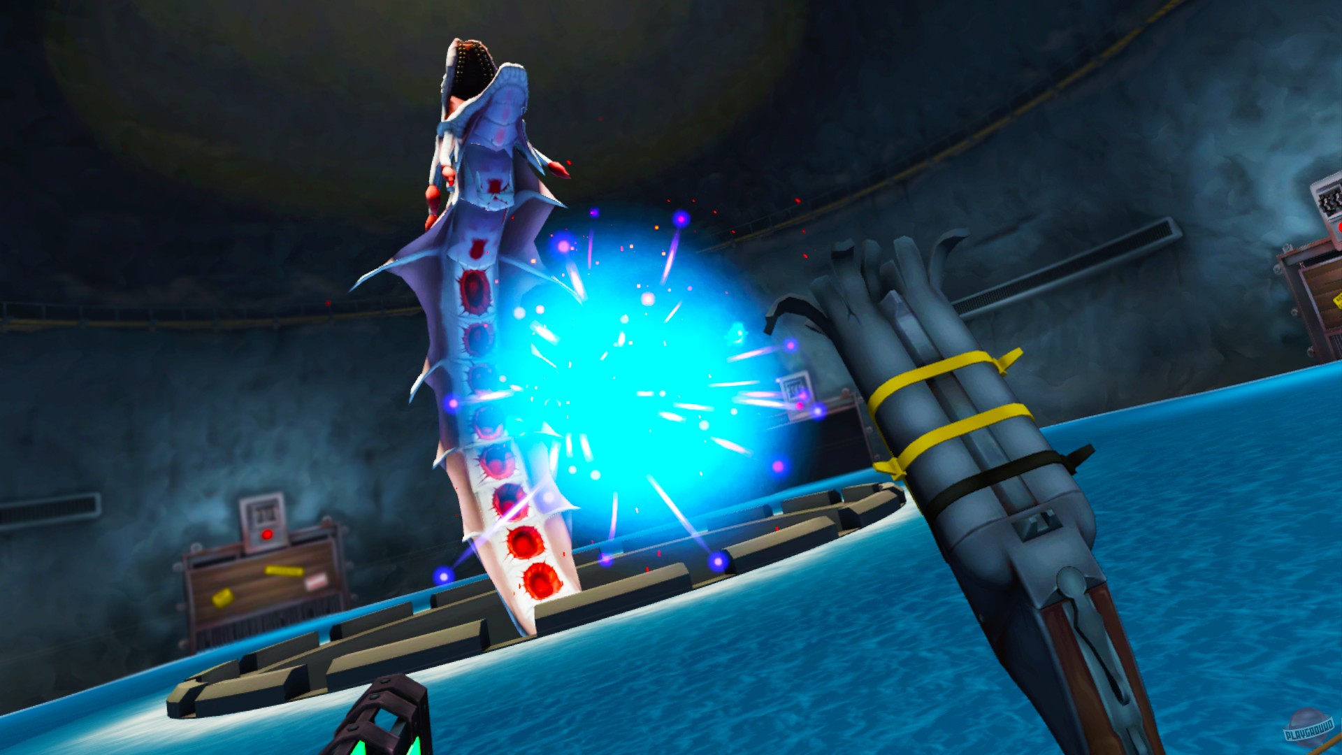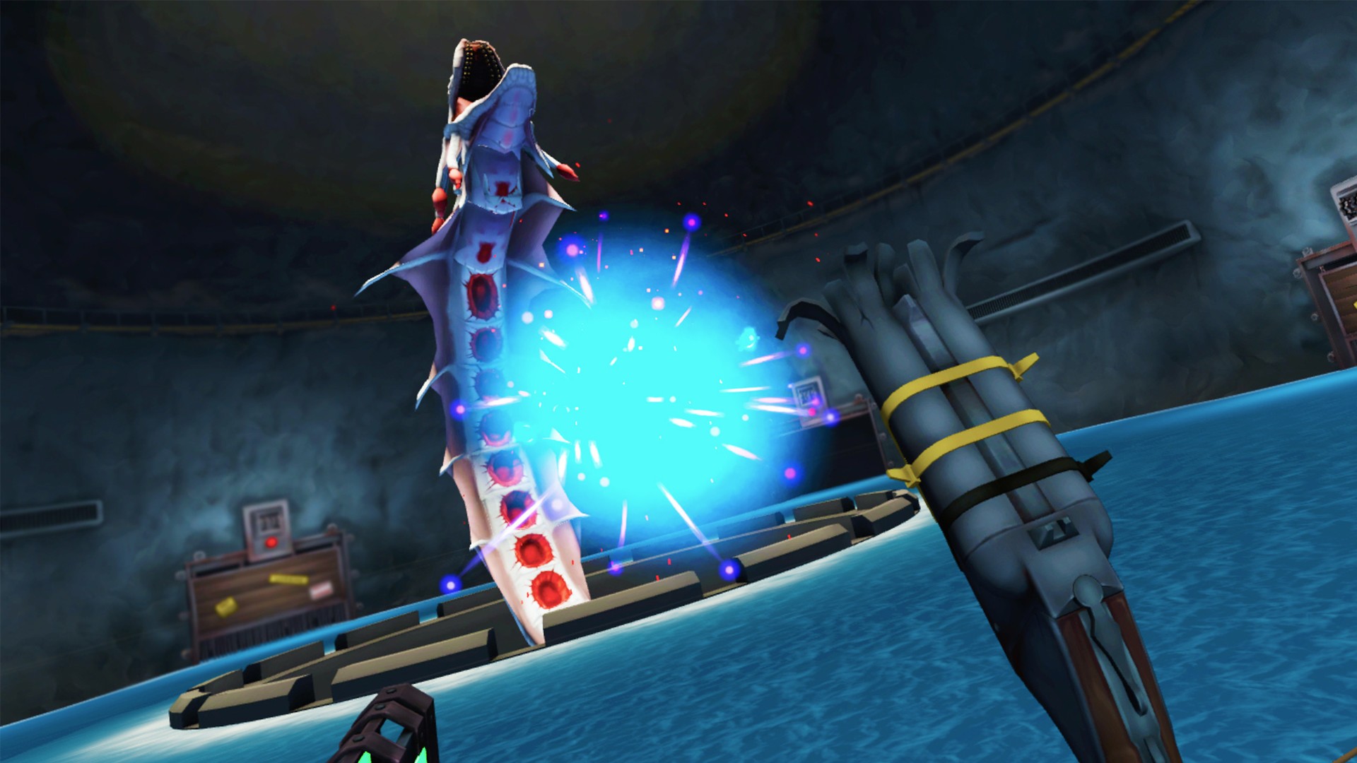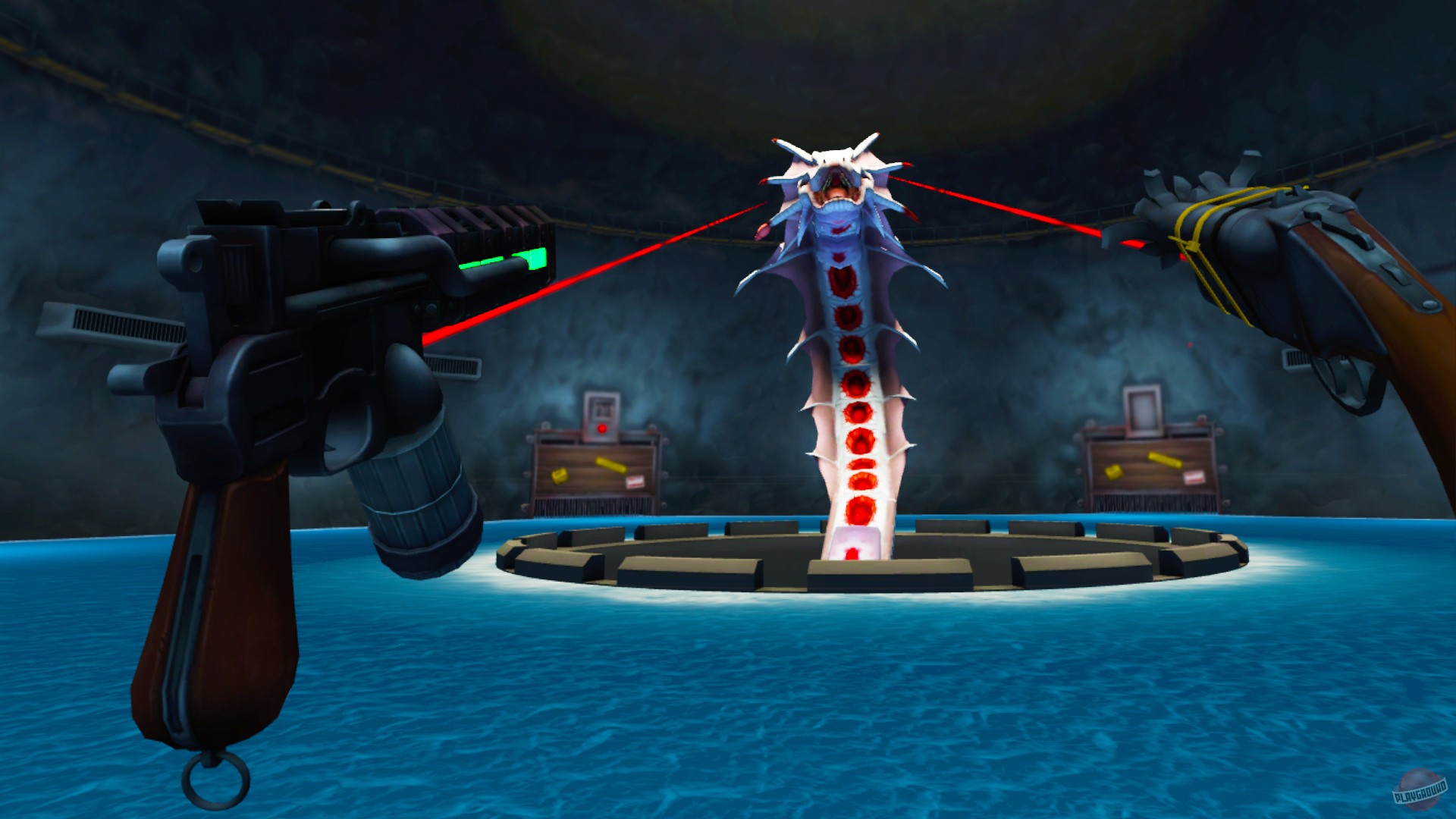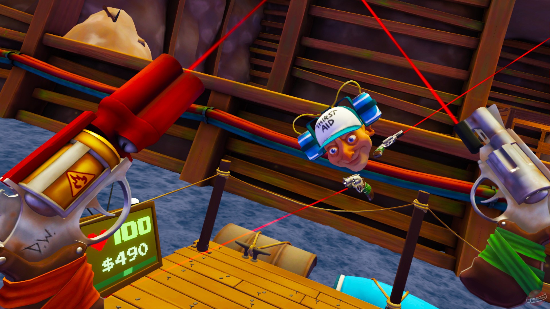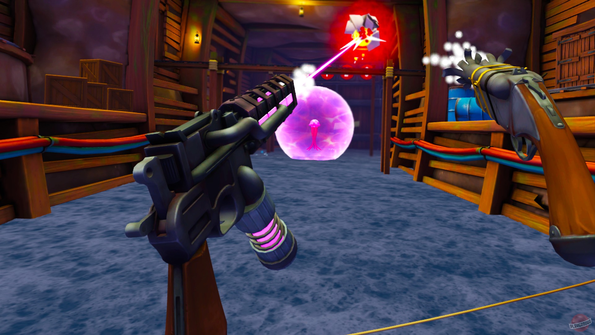 Dick Wilde 2 — это аркадный VR-шутер с видом от первого лица, созданный для тех, кто хочет получить максимум адреналина и смеха за минимальное время. Геймплей построен по принципу «коридорного экшена»: вас плавно несет по уровням (в основном на лодке или по рельсам), а вы, вооружившись парой пушек, методично расправляетесь со всем, что шевелится и пытается вас съесть. Враги здесь — это отдельное шоу: от крыс-камикадзе и ядовитых лягушек до огромных крабов, которые явно смотрели «Мстителей» и решили, что могут быть одним из них. Игра выполнена в ярком мультяшном стиле, так что даже самые жуткие мутанты выглядят скорее забавно, чем страшно, что делает этот VR-шутер идеальным для новичков и семейного досуга в виртуальной реальности.