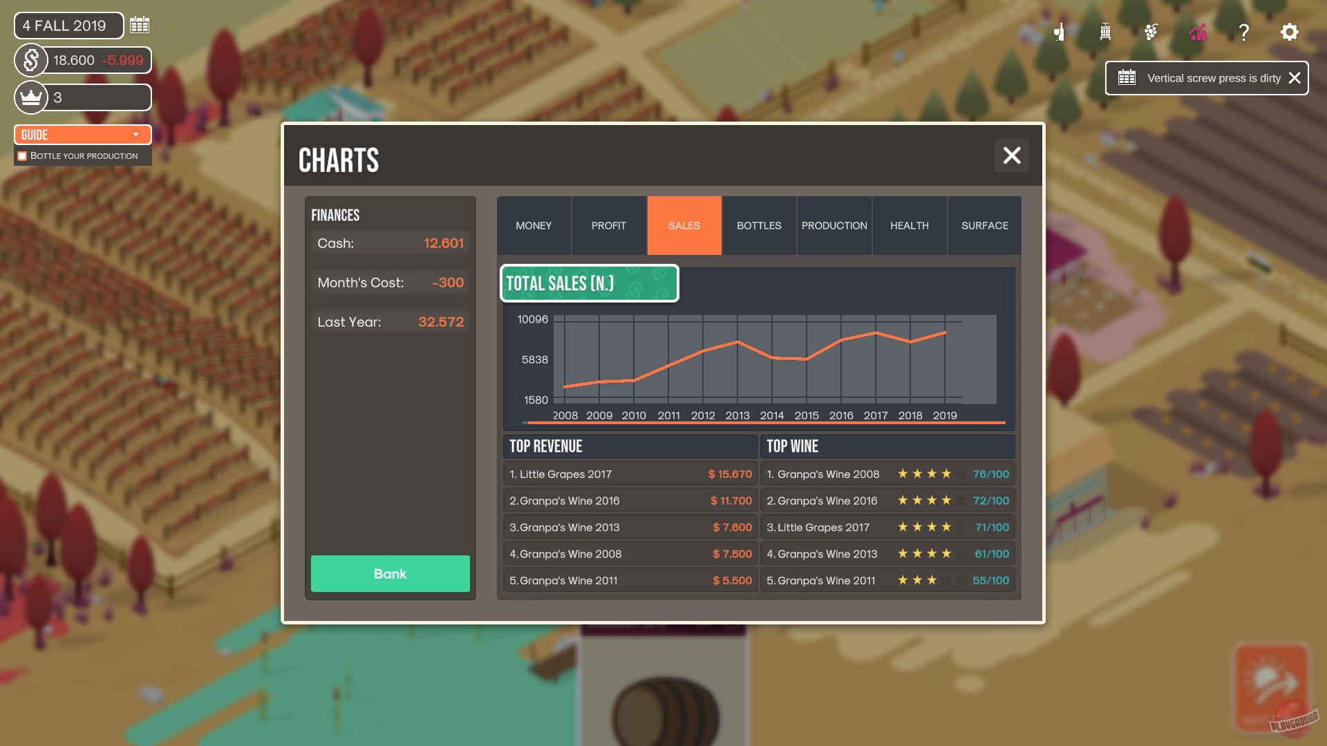 В Hundred Days вас ждёт удивительно глубокий и реалистичный процесс создания вина, который заставит вас почувствовать себя настоящим винным гуру. Вам предстоит не просто поливать лозы, а буквально вести диалог с природой: анализировать почву, подбирать идеальные сорта винограда (Каберне Совиньон сегодня или может быть Пино Нуар?), высчитывать идеальное время сбора урожая и принимать судьбоносные решения на каждом этапе производства. Стоит ли отправить вино на выдержку в дубовых бочках или лучше продать его молодым и свежим? Каждый ваш выбор — это кирпичик в фундаменте вашей винодельческой империи. И помните, как говорил великий (и совершенно вымышленный) винодел Жан-Поль Бутылкин: «Хорошее вино — это не удача, а результат сотни правильных решений». Или, в нашем случае, ста дней!