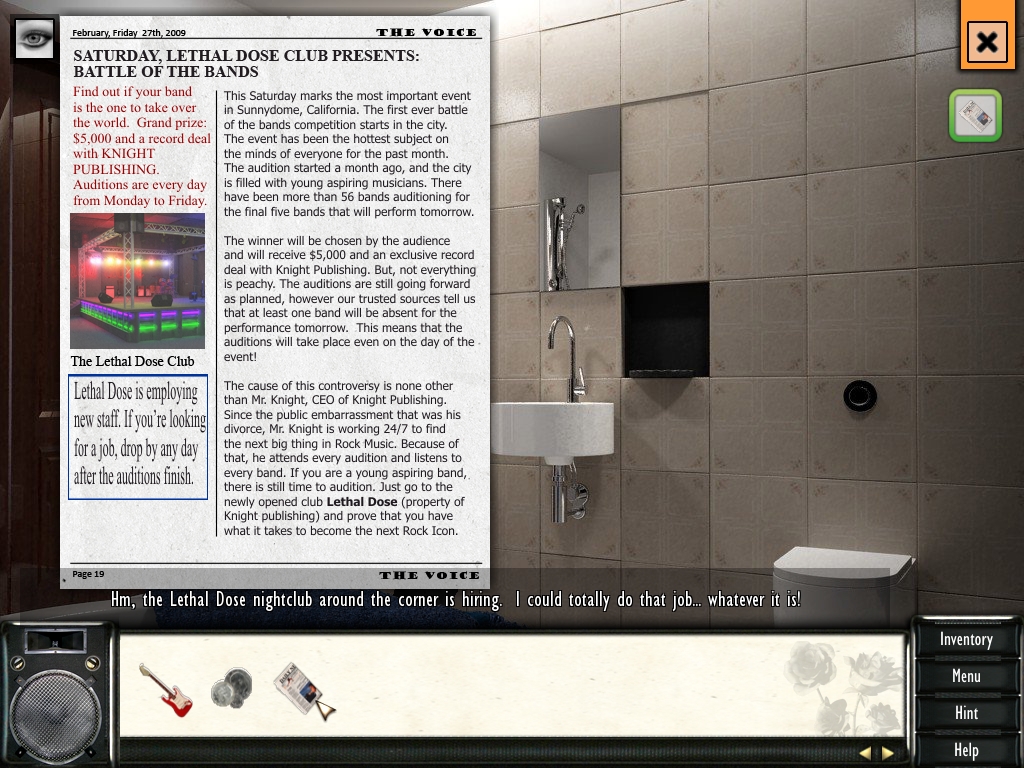 Все подробности о нелегком пути на вершины чартов расскажет вам игра Iron Roses от компании Sandlot Games. Единственной любовью всей жизни Алекс была музыка. А точнее, музыкальный репертуар ее бывшей группы Iron Roses. После скандального распада члены ее группы разошлись каждый своим путем. Но Алекс все еще продолжает мечтать о возвращении на сцену. В игре вы будете помогать ей разыскать своих бывших друзей и убедить их участвовать в конкурсе "Битва групп". В этих поисках девушка найдет утерянное музыкальное оборудование группы и будет учиться решать конфликтные ситуации. Оригинальный саундтрек к игре написала музыкальная группа "Megasapien".