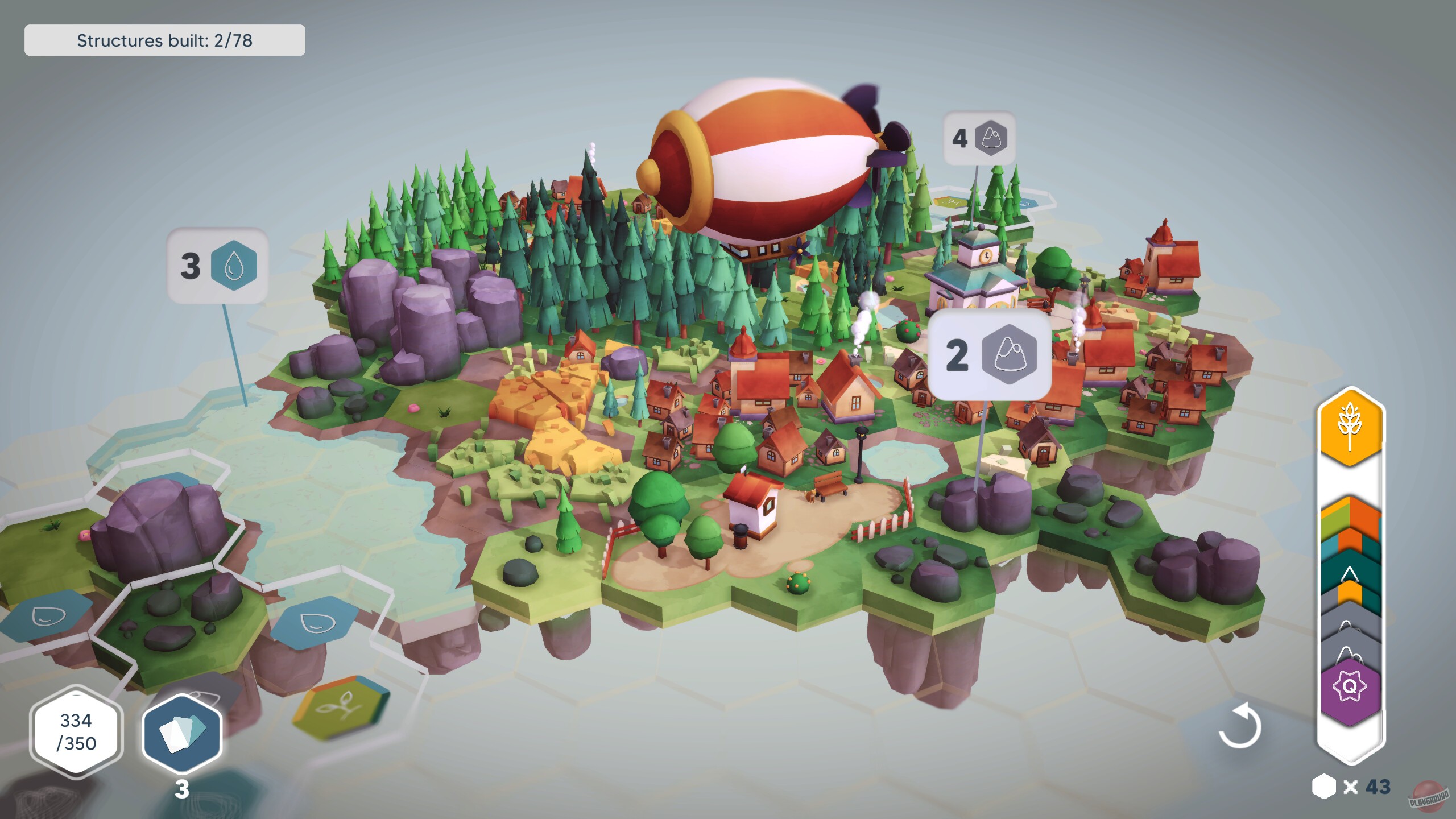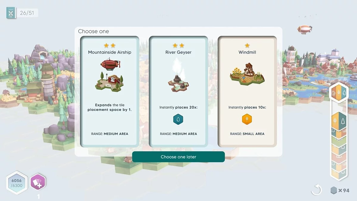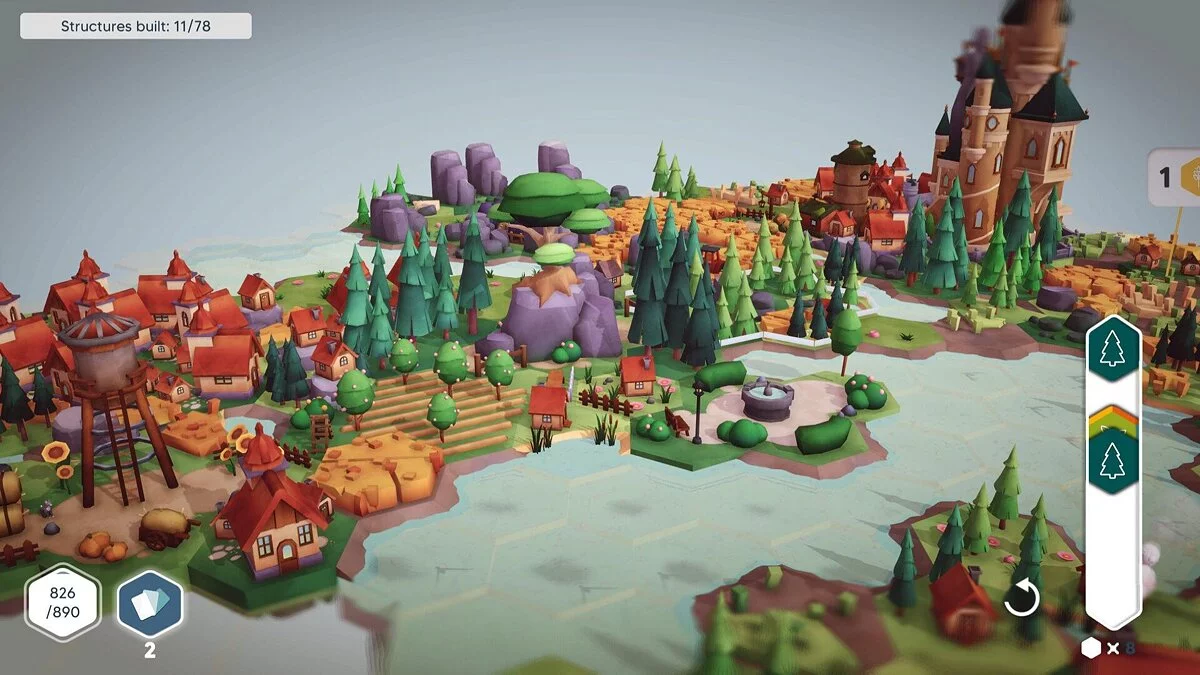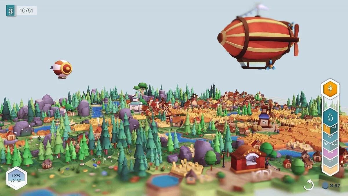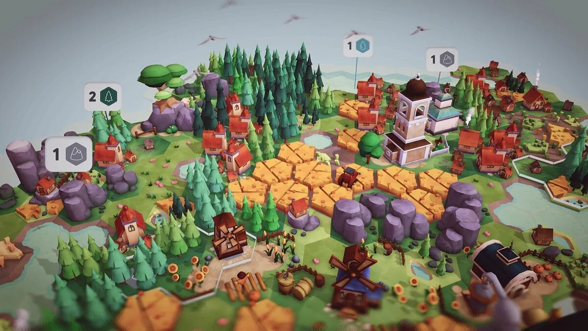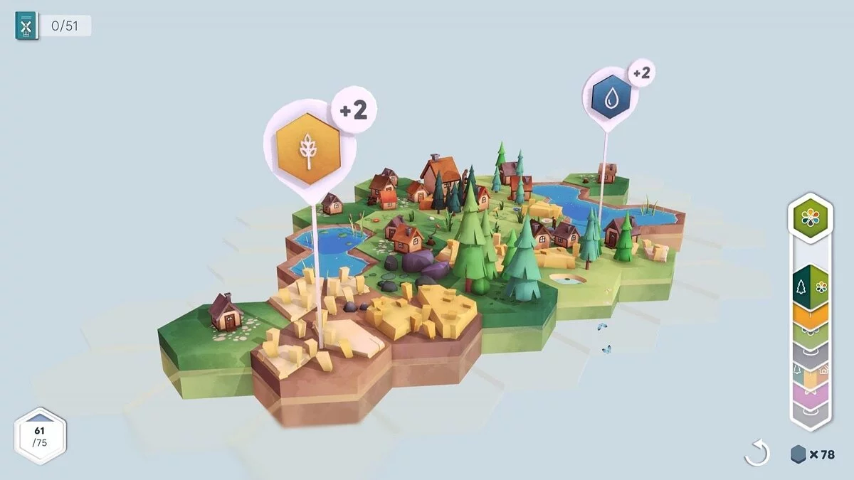 В этой игре вы создаёте свой собственный мир из плиток. Вы соединяете участки земли разных цветов, чтобы формировать различные биомы: леса, горы, озера и т.д. Вы также размещаете структуры, такие как дома, фермы, мосты и т.д., чтобы увеличить свои очки. Но не вёе так просто: вам также нужно выполнять задания, которые заставят вас думать стратегически и адаптироваться к изменяющимся условиям.