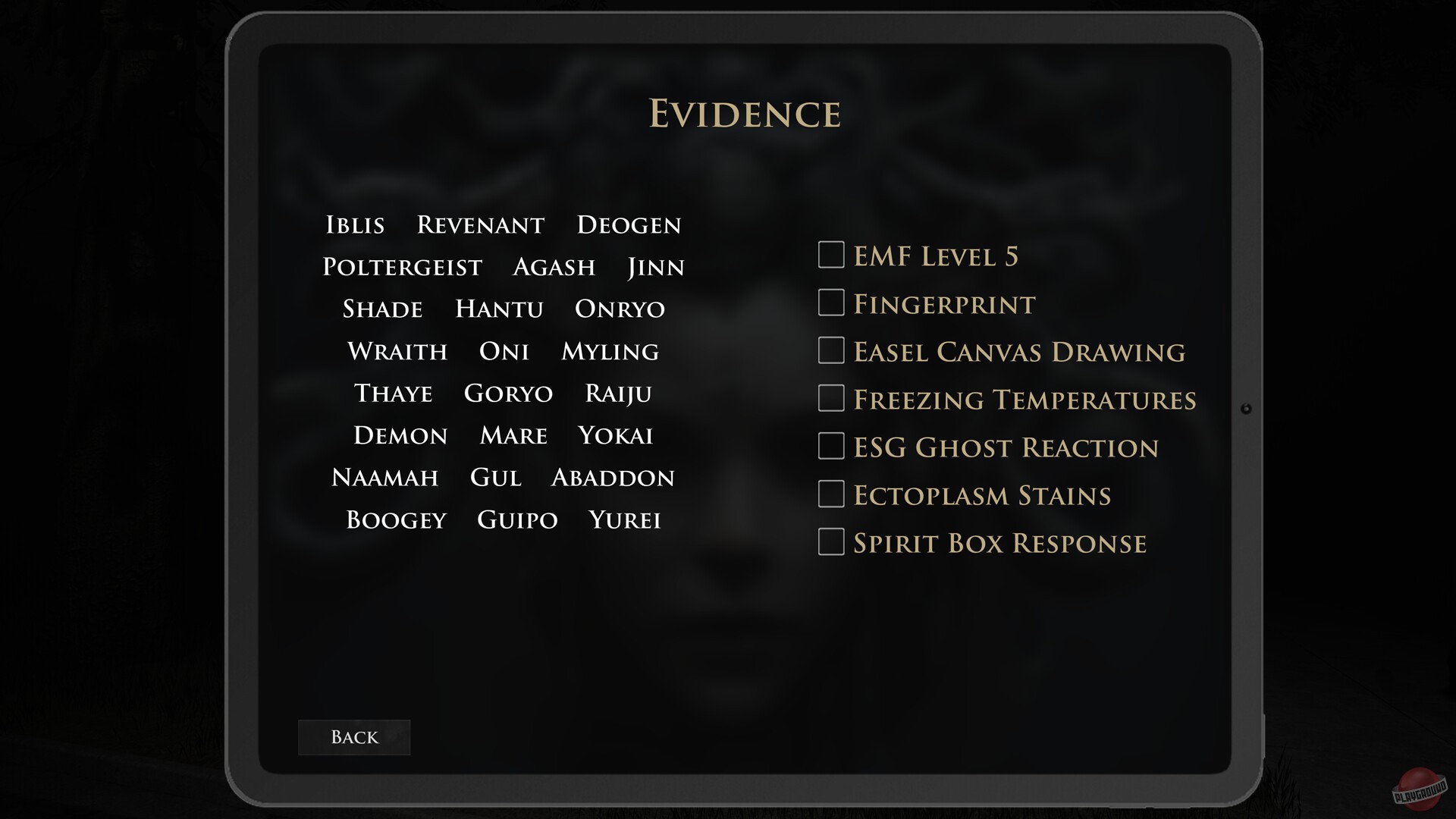 Кооперативная игра, в которой до 4 человек исследуют проклятые локации и пытаются определить вид злого духа, чтобы изгнать его. Для этого можно использовать специальное оборудование. За успешное выполнение задания персонаж получает деньги, которые можно потратить на улучшение своего убежища.