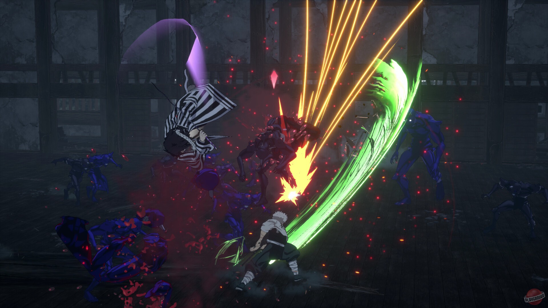 Игра по аниме «Истребитель демонов», где дерутся с мечами против всякой нечисти. Тут есть история, где проходишь за главного героя Тандзиро через несколько арок из сериала — там где они в красных фонарях сражались, потом в деревне кузнецов, и где столпы тренировались. Демонов побеждаешь, смотришь красивые сценки, переходишь дальше.