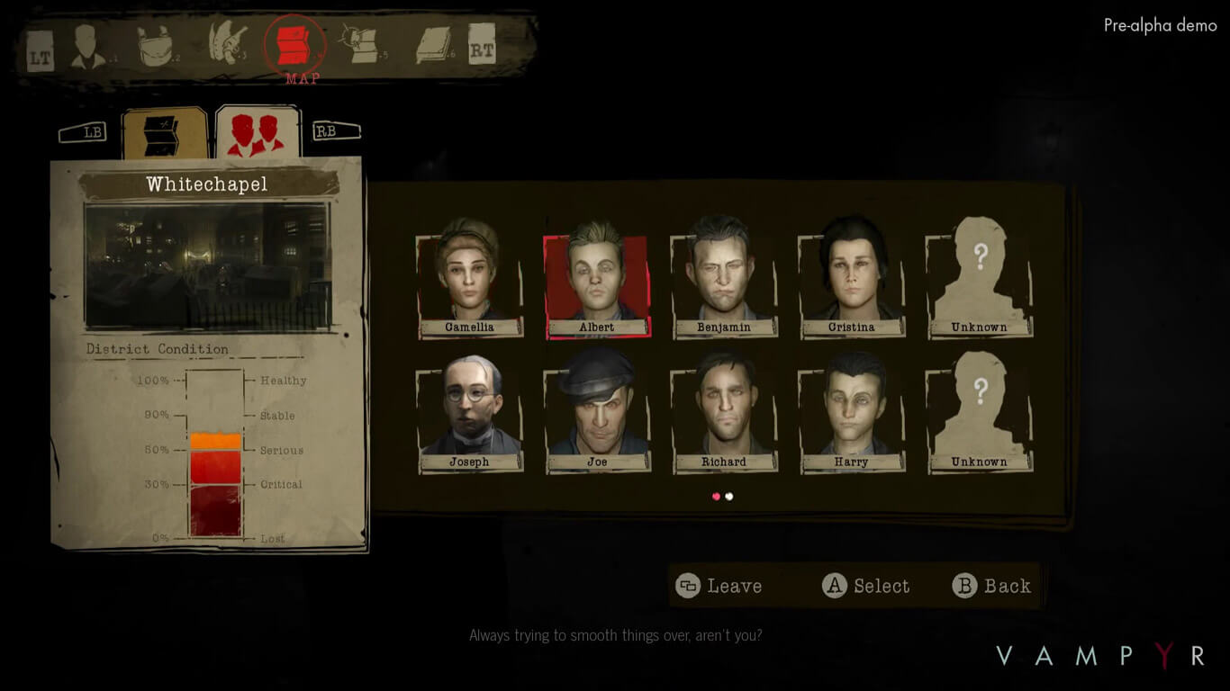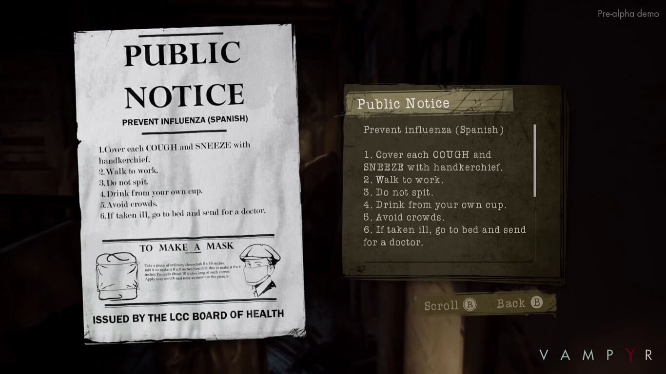 Vampyr - это ролевая игра про вампиров, действие которой разворачивается после Первой Мировой войны. Главным героем игры становится доктор, который после укуса вампира сам становится кровожадным монстром, который, впрочем, сохранил рассудок и пытается создать лекарство от бушующей испанки, не став монстром окончательно. Игрокам предоставляется выбор - или сохранить свою человечность, выпутываясь из сложившейся ситуации исключительно своими силами, или же поддаться соблазну и стать легендарным монстром. В зависимости от принятых решений игроки продвигаются по сюжету, меняя судьбы разных людей, и приходя к совершенно неожиданным развязкам.