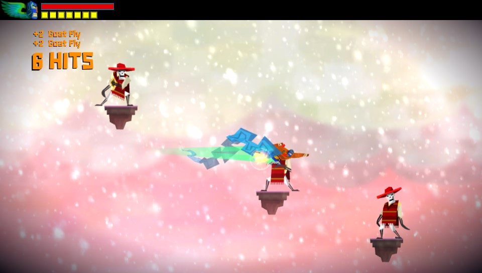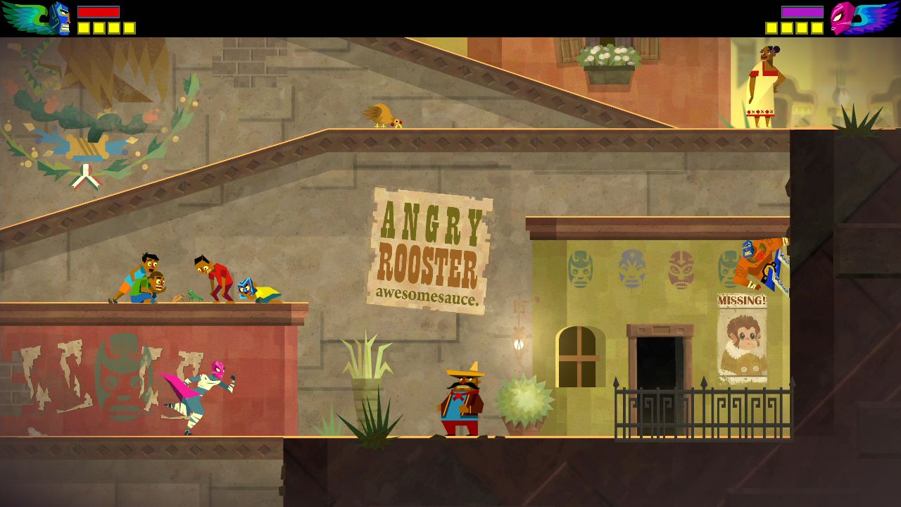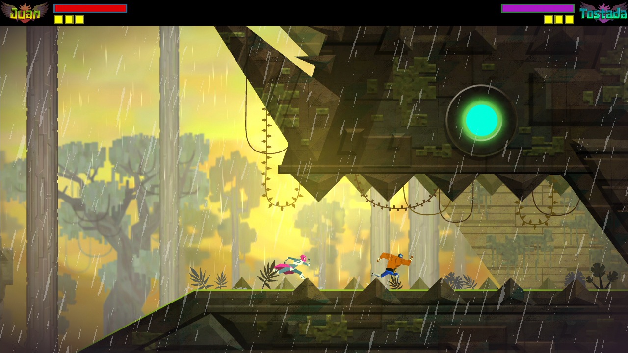 Геймплей Guacamelee! — это идеальный микс из головокружительных прыжков, взрывных комбо-атак и увлекательного исследования. Вас ждут огромные, запутанные лабиринты уровней, полные секретов, коллекционных предметов и испытаний на ловкость. Ключевая фишка игры — способность переключаться между миром живых и миром мёртвых. Это не просто красивый спецэффект: стены и платформы в одном измерении могут быть непроходимыми, а в другом — исчезают, открывая новые пути и скрытые комнаты. Так что готовьтесь ломать не только кости врагам, но и свой мозг над хитроумными головоломками. Боевая система здесь настолько глубока и приятна, что каждый удар локтем или прыжковый апперкот ощущается как маленькая победа, особенно когда вы отправляете целую толпу скелетонов в полёт с помощью фирменного удара «Гуако-Пауэр».