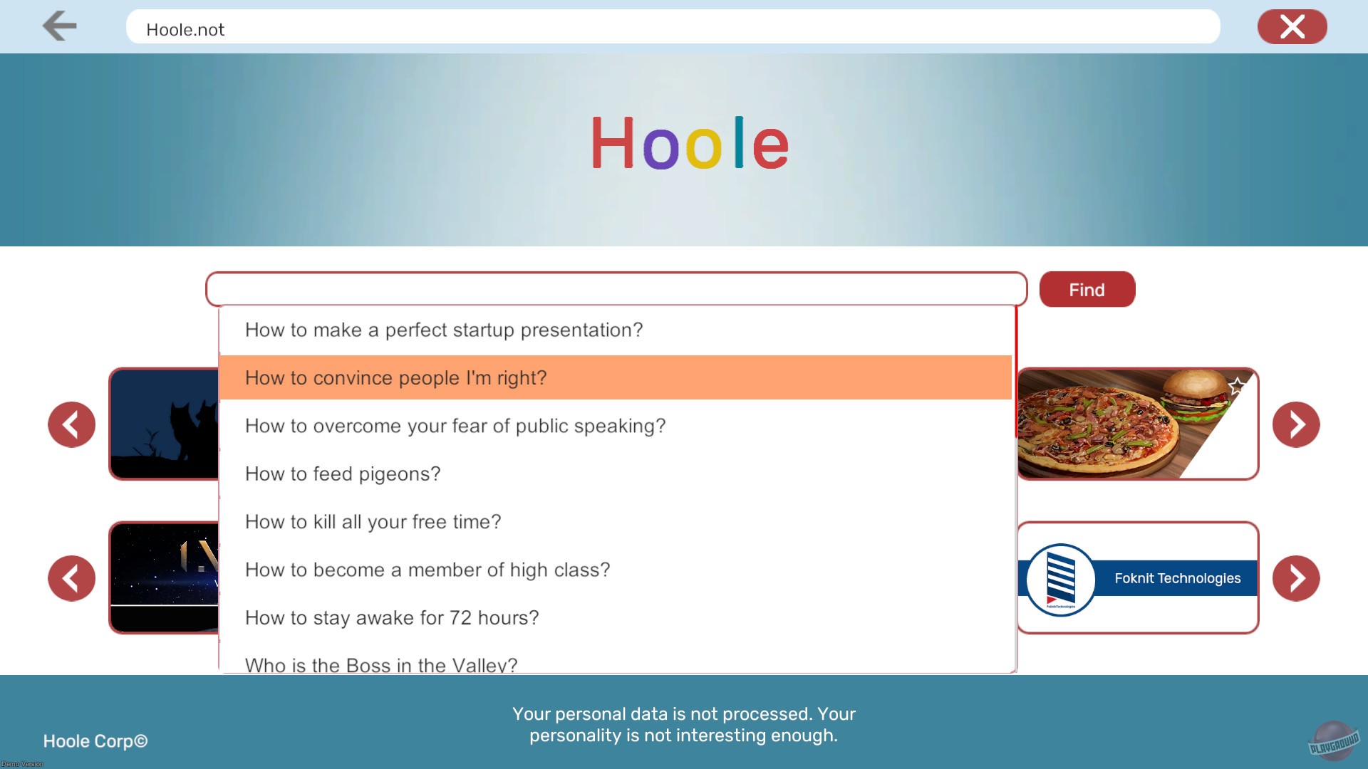 Чёрная комедия, где вам предстоит взять на себя роль начинающего стартапера в Кремниевой Долине. У вашего героя нет денег, но зато есть друг-алкоголик Ларри, бывшее разъярённое нечто, отсутствующий инвестор, SVC и 8 дней, чтобы не умереть.