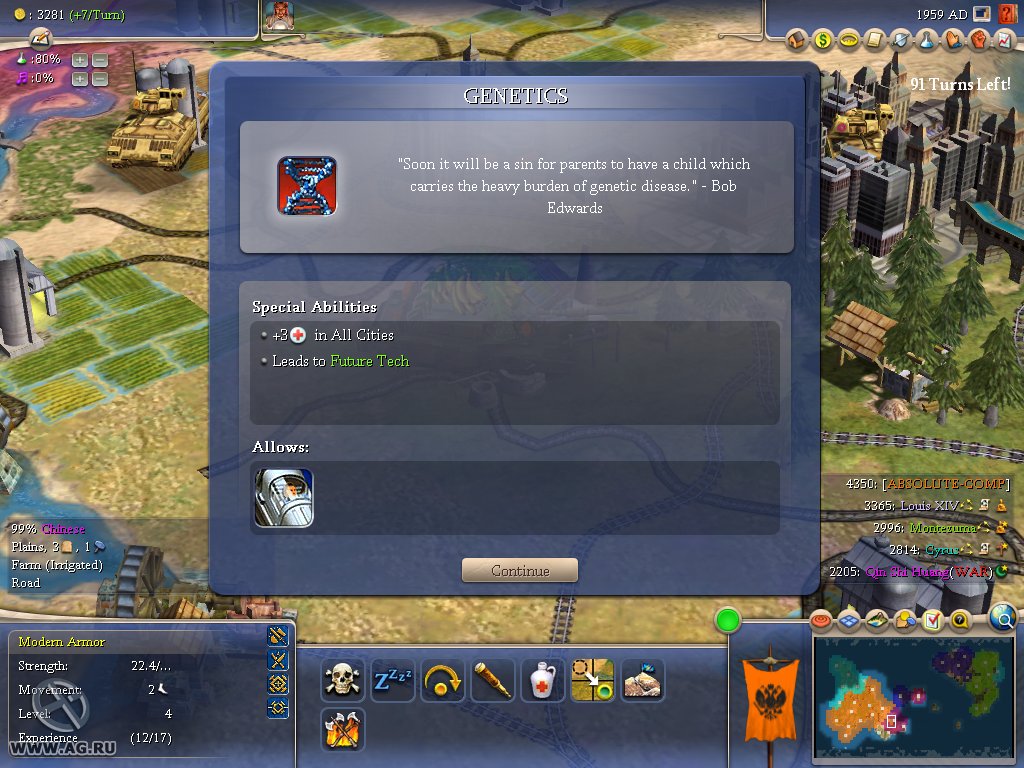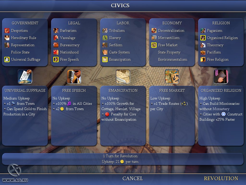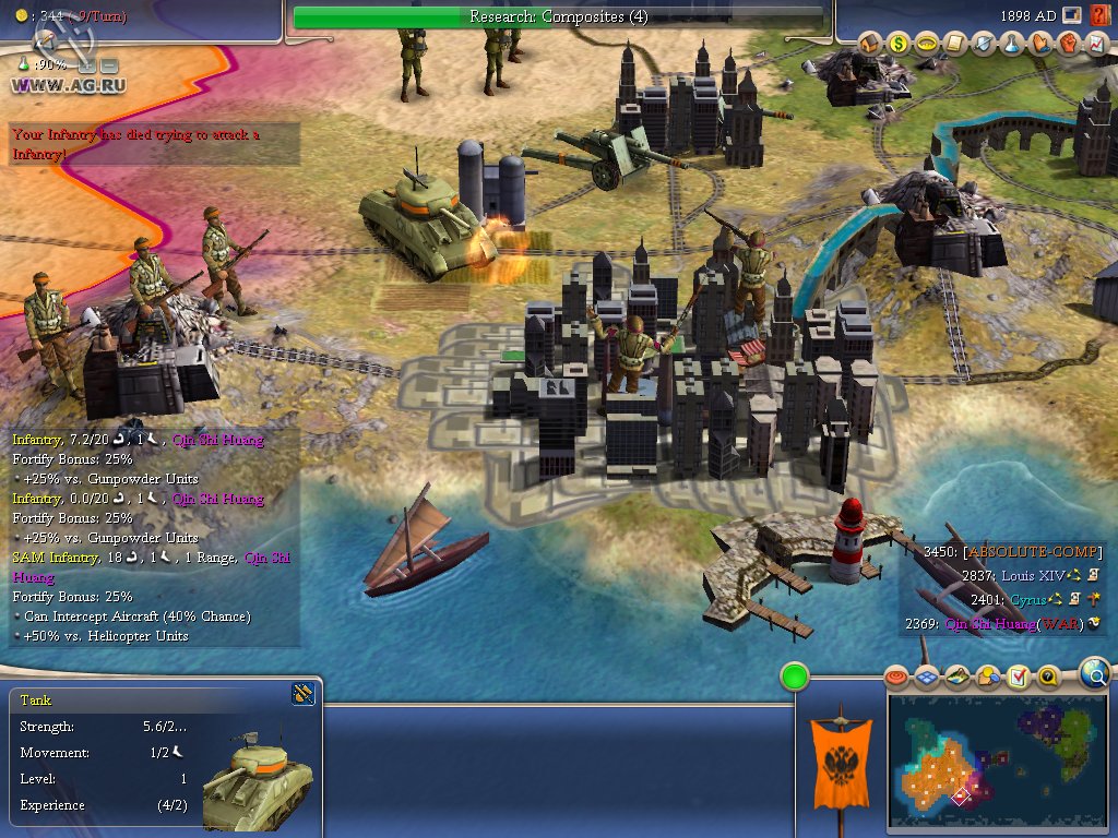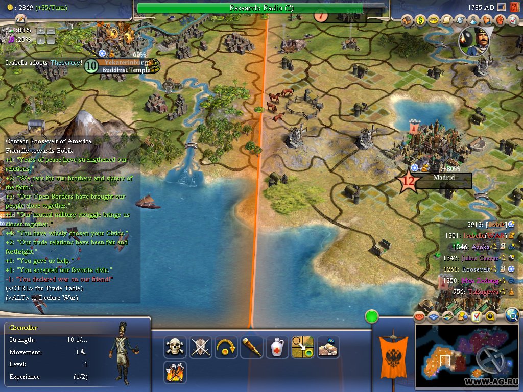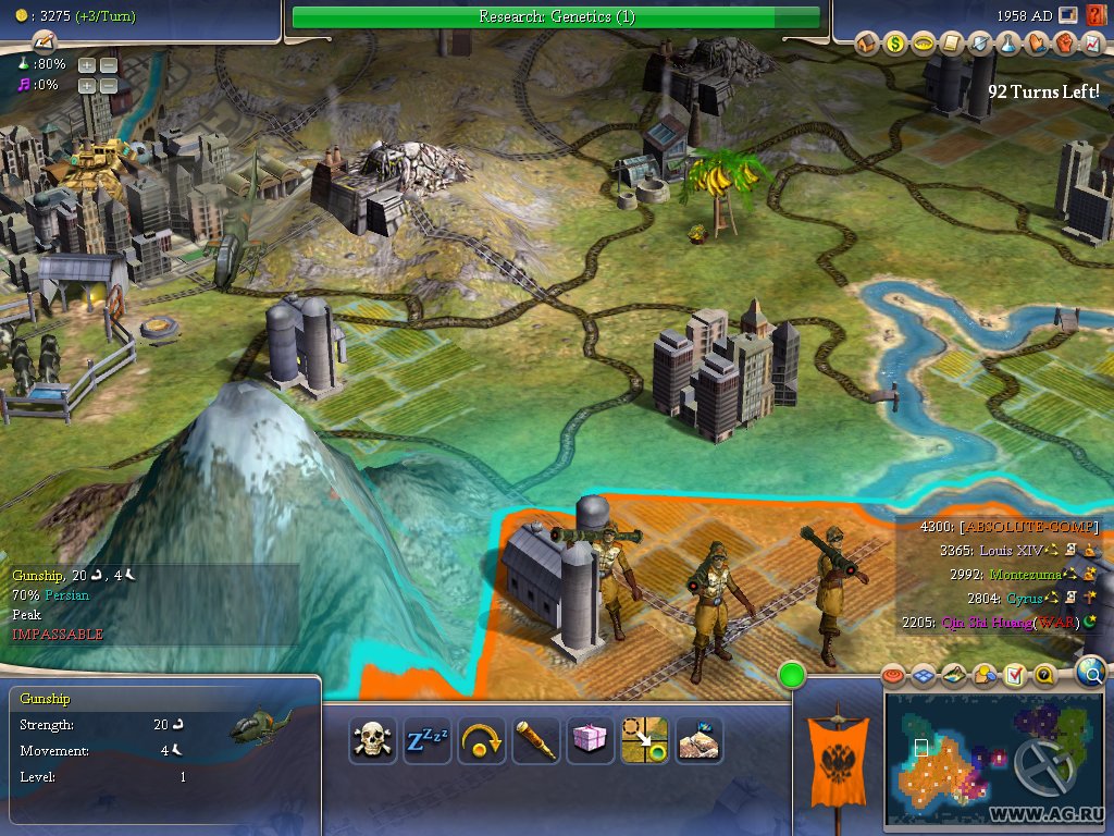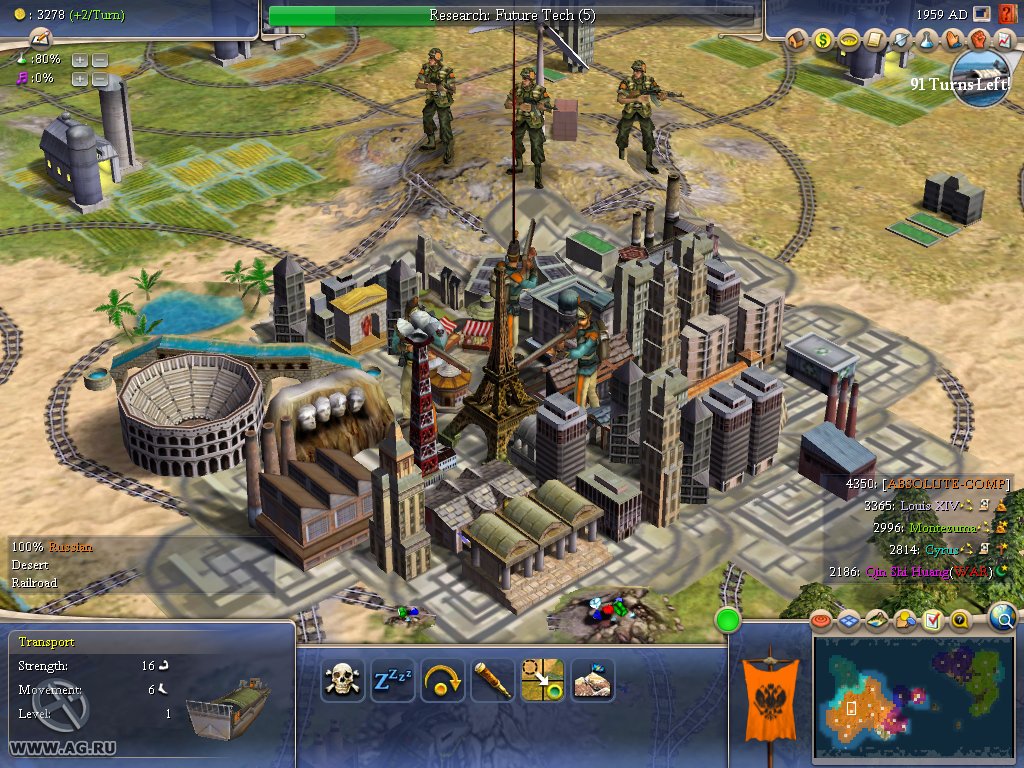 Геймплей Civilization IV — это как шахматы, но вместо коней и слонов у вас танки и атомные бомбы, а вместо доски — вся Земля. Вы выбираете одну из множества исторических наций (от Рима до Америки) и ведёте её через тысячелетия, развивая науку, культуру, религию и, конечно же, армию. Система исследований позволяет вам открывать новые технологии, от колеса и письменности до лазеров и робототехники. А продуманная дипломатия даёт возможность заключать союзы, торговать ресурсами или просто объявлять войну соседу, потому что его города «слишком близко к вашим». Каждое решение имеет последствия, и каждый ход — это шаг к величию или к полному краху.