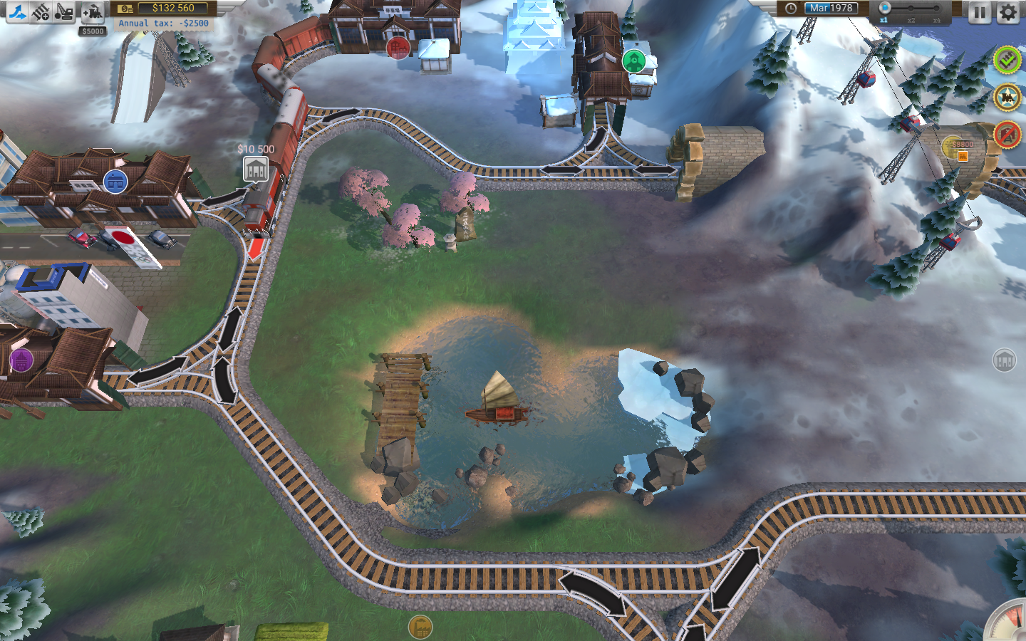 Ваше приключение начинается в далёком 1830 году, когда первый паровоз только-только начал пугать лошадей своим дымом и свистом. Постепенно, от эпохи к эпохе — через Америку дикого Запада, промышленную Европу, загадочную Японию и просторы России — вы будете модернизировать свою сеть. Вы получите в своё распоряжение более 15 уникальных моделей локомотивов и 18 видов вагонов, от старинных деревянных до современных электричек. Каждый уровень — это новая головоломка: ограниченный бюджет на строительство, хитрые маршруты, требовательные города и, конечно же, вечный риск аварии, если вы решите пустить два поезда навстречу друг другу, как в самом напряжённом эпизоде сериала. Управляйте трафиком, стройте разъезды и депо, планируйте логистику — ведь в Train Valley каждый метр рельса на счету!