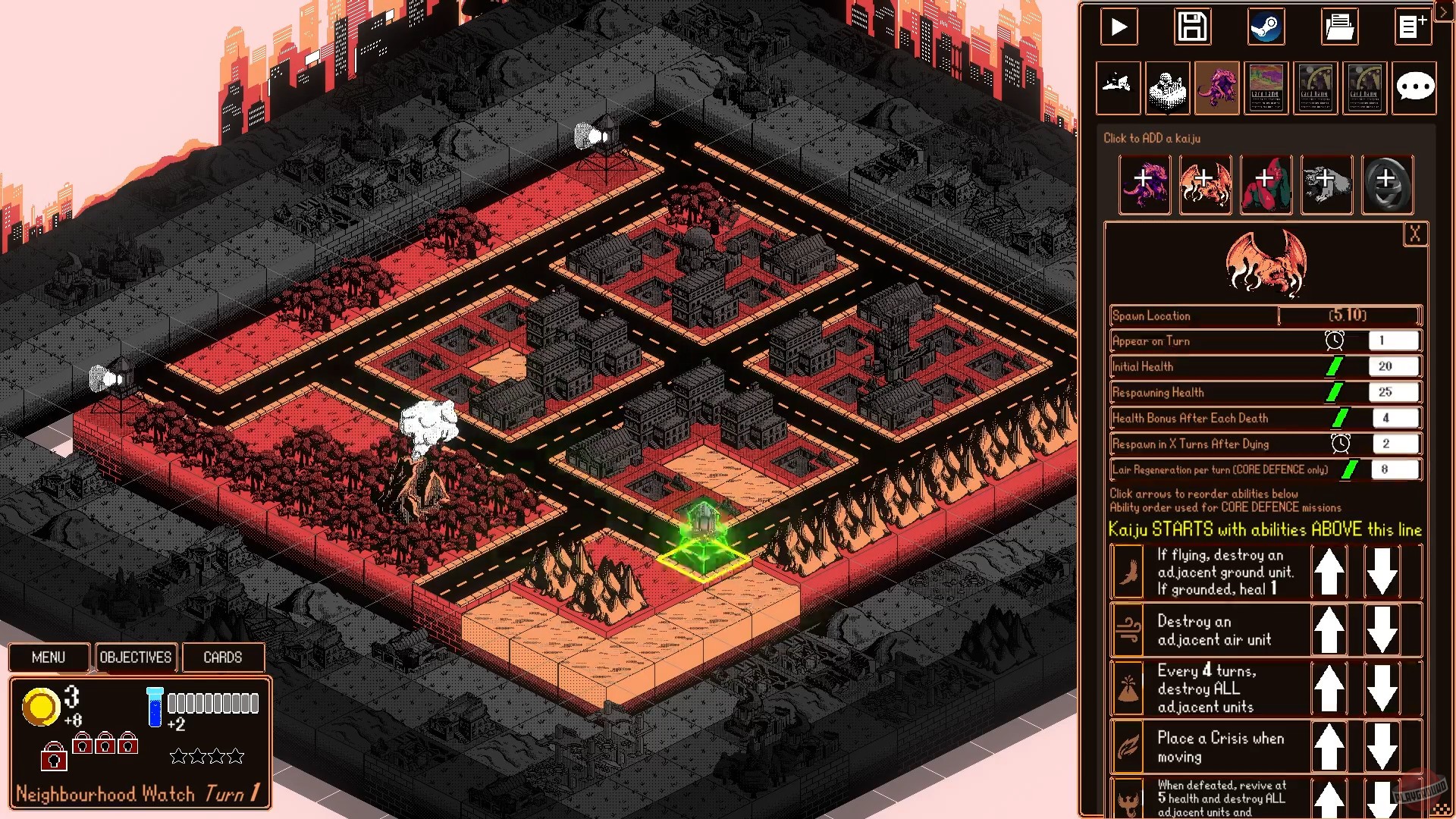 Тактическая пошаговая стратегия про защиту городов от нападения гигантских монстров — кайдзю. Возводите сооружения и обороняйте свой город при помощи армии. Приобретайте пушечные танки и реактивные самолёты, чтобы оказать сопротивление монстру. Не забывайте, что его сила возрастает с каждым последующим ходом, поэтому старайтесь действовать быстро и обдуманно. Вам предстоит столкнуться с разными видами мутантов, каждый из которых обладает своими особенностями атаки, поведением и количеством здоровья.