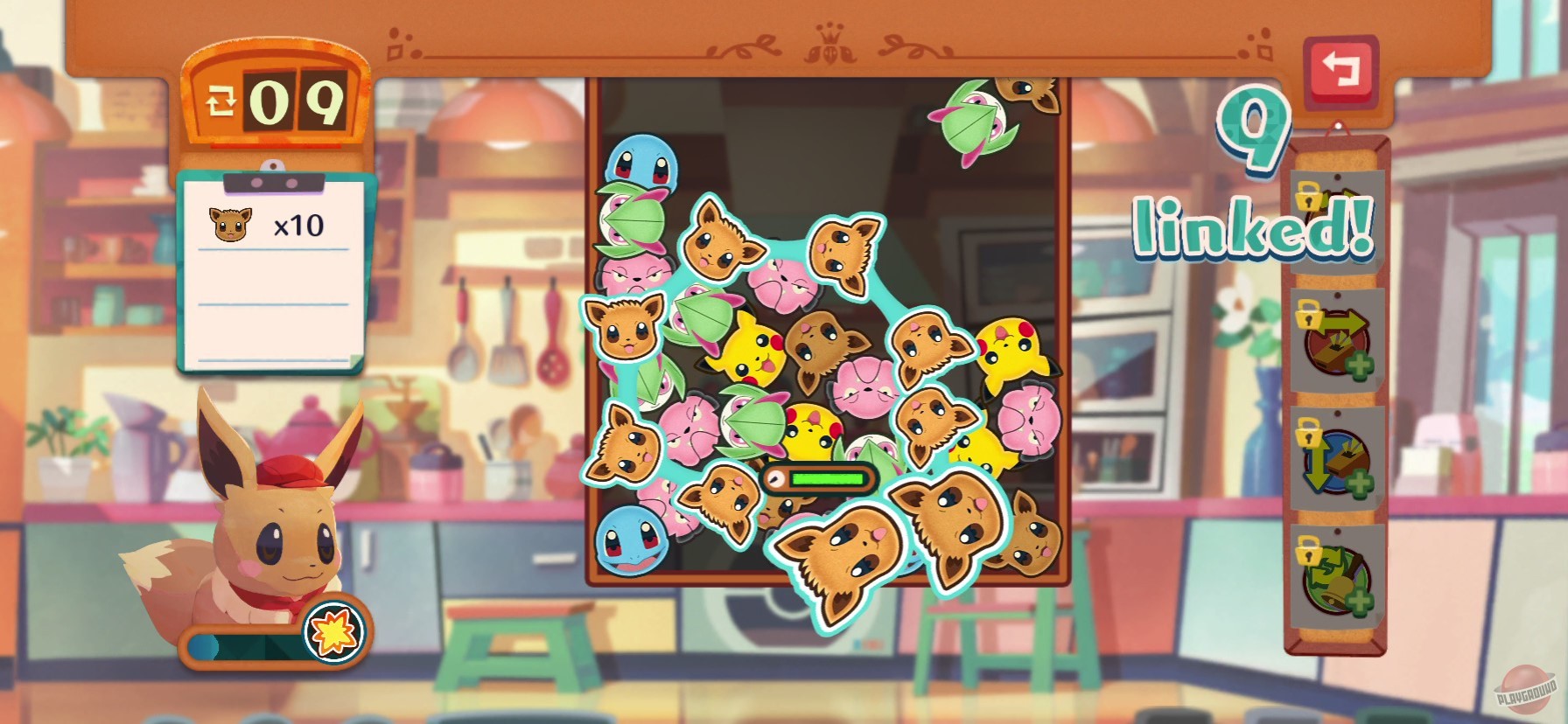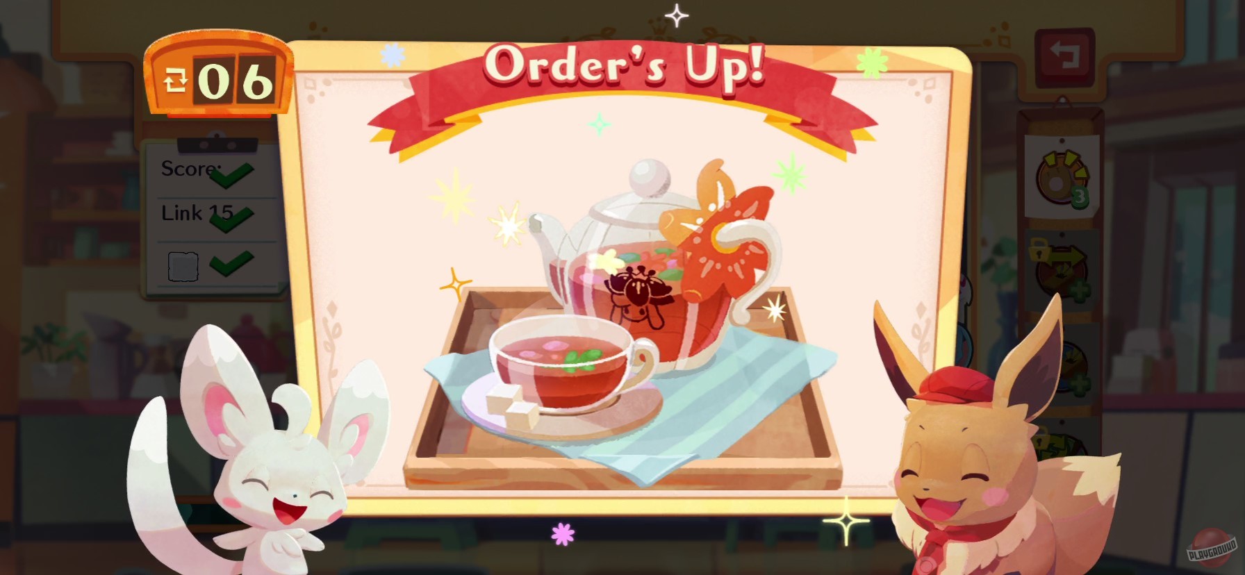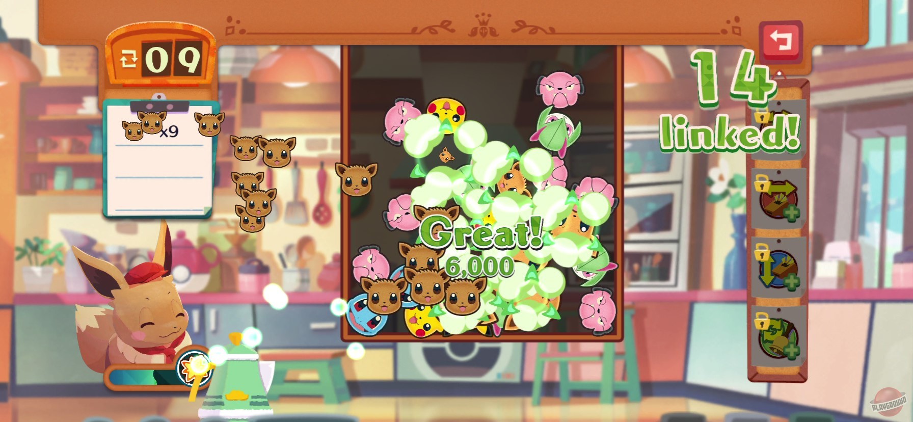 Открывайте и развивайте собственную закусочную, в которой вам необходимо принимать заказы у гостей-покемонов и готовить вкусные лакомства, решая головоломки. Решить головоломку нужно за указанное количество ходов, поэтому периодически придётся использовать особые таланты покемонов или расходные предметы, чтобы выполнить заказ.
