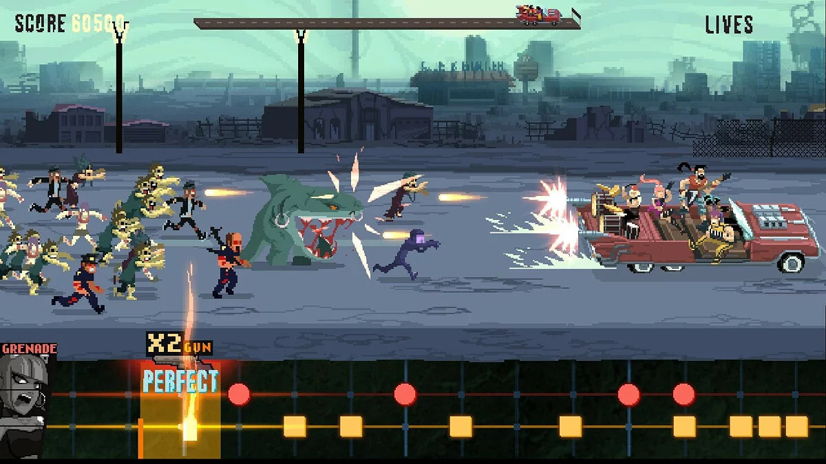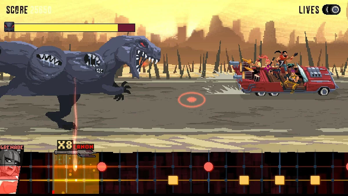 Забудьте про скучные поездки! В Double Kick Heroes вы не просто едете по дороге — вы устраиваете на ней настоящий металлический апокалипсис! Представьте: ваш верный «Гандиллак» (да-да, именно так зовут этот боевой фургон) мчится сквозь постапокалиптические пейзажи, а из динамиков рвется такой хардкорный рифф, что даже зомби на обочине начинают кивать головами в такт. Но расслабляться не стоит, ведь толпы противников — от обычных бандитов до гигантских акул с лазерами (ну а почему бы и нет?) — мечтают превратить ваш круиз в одностороннее путешествие на тот свет. И здесь-то на помощь приходит гениальный геймплей: вы не просто жмете на спусковой крючок, вы играете на клавишах своего оружия, как на электрогитаре! Каждый выстрел идеально ложится в ритм мощной саундтрековой композиции, превращая кровавую бойню в эпичное музыкальное шоу. Это не просто ритм-игра или шутер — это гармоничный симбиоз двух жанров, где ваша реакция и чувство такта становятся главным оружием.
