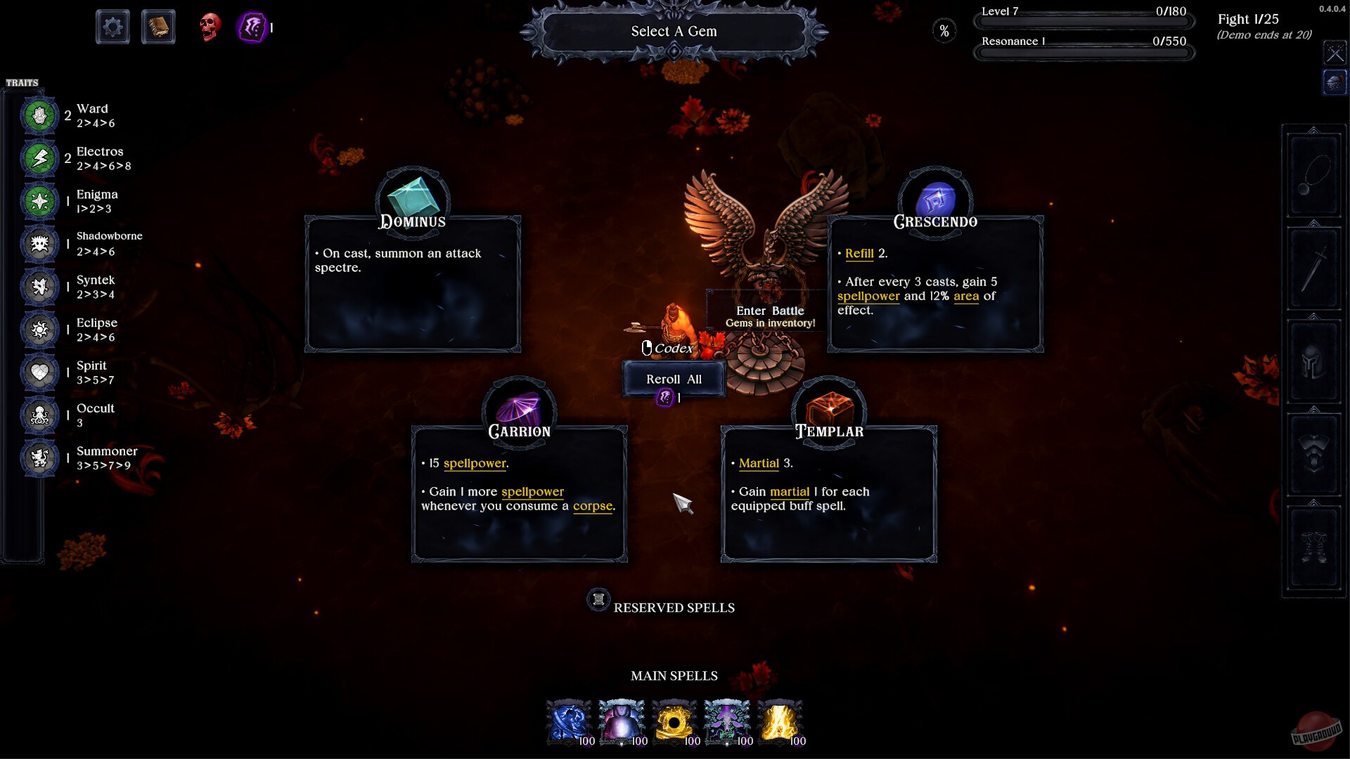 Godslayer Arena — это такая игра, где вам нужно собирать набор заклинаний, а потом ваш персонаж сам дерётся на арене. То есть вы не управляете боем напрямую, а только заранее решаете, какие заклинания использовать и в каком порядке их расставить. Работает это примерно так: перед боем попадаете в магазин, где можно купить разные заклинания. Денег обычно хватает не на всё, поэтому приходится выбирать. Можно потратить ресурсы на то, чтобы обновить ассортимент в магазине, а можно прокачать уровень — тогда появятся более крутые заклинания.