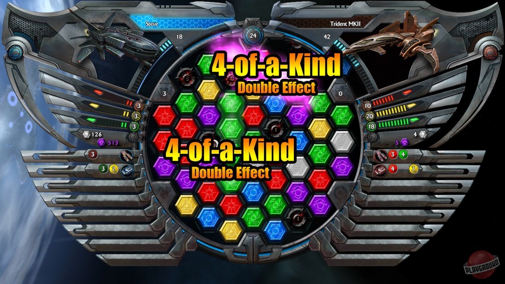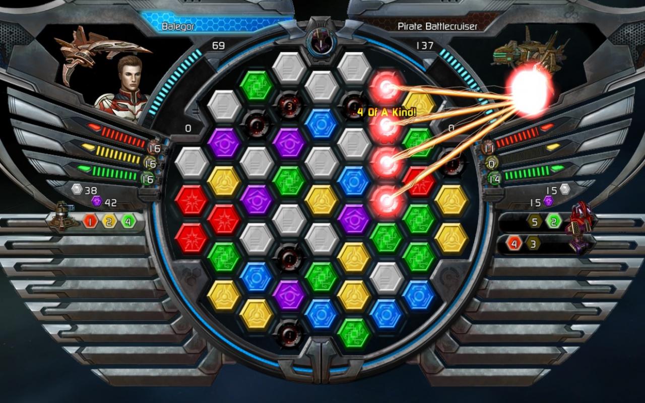 Суть битвы в Puzzle Quest: Galactrix проста, как дважды два, но глубока, как чёрная дыра. Вы сражаетесь на уникальной гексагональной доске, где каждый ваш ход — это не только попытка собрать цепочку из одинаковых кристаллов для атаки, но и продуманная тактика. Собираете зелёные — восстанавливаете щиты, красные — наносите урон, синие — заряжаете свои лазеры. А ещё есть редкие квантовые кристаллы, которые могут полностью изменить расклад сил! Геймплей настолько затягивает, что вы легко можете провести часы, забыв о реальном времени, пока не поймёте, что ваш корабль уже стал флагманом целой армады. И да, здесь есть полномасштабная кампания, где вас ждут десятки миссий, исследование планет и, конечно же, противостояние с интриганами и пиратами.