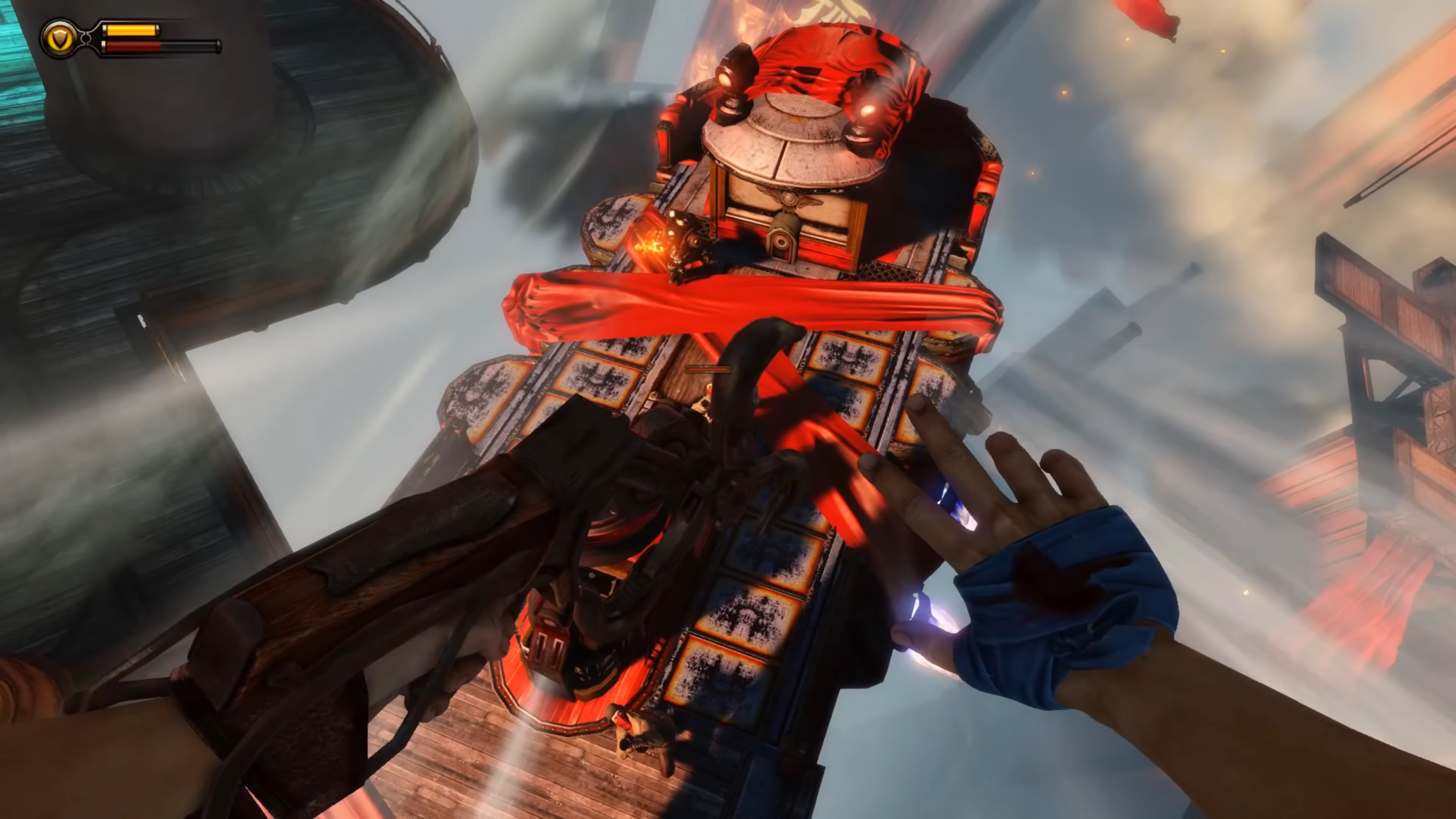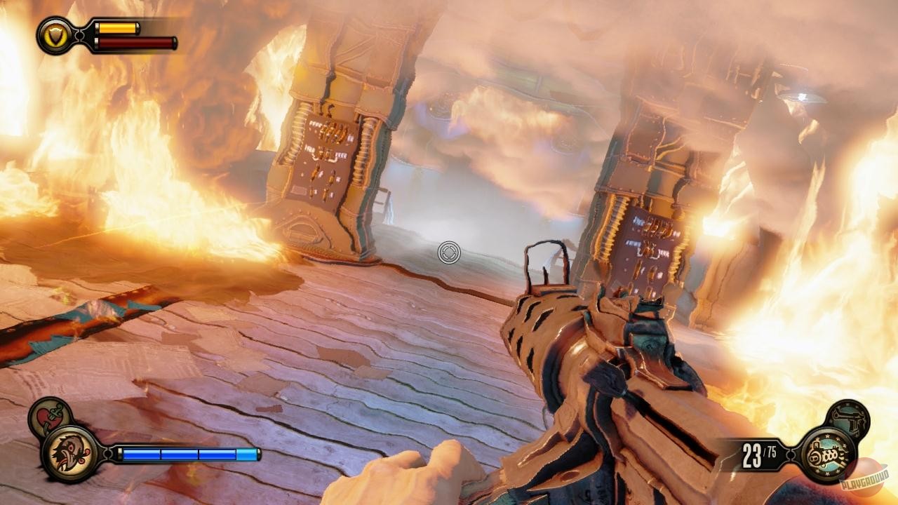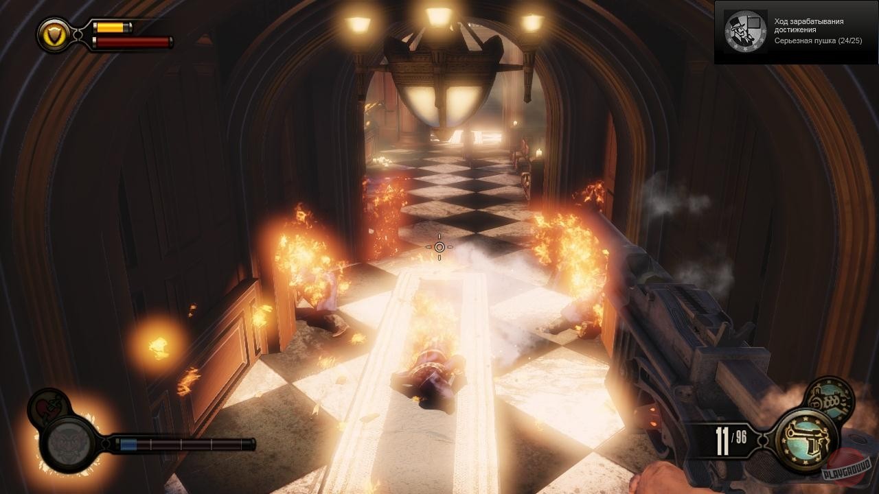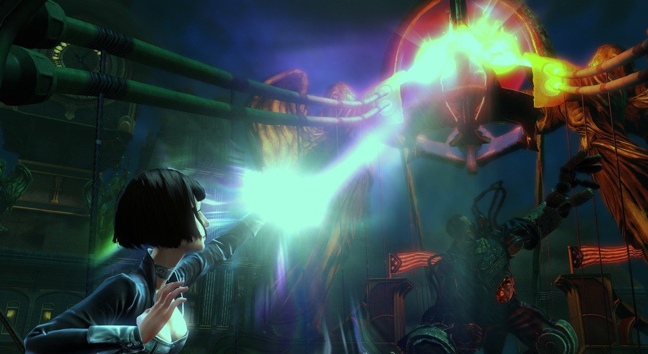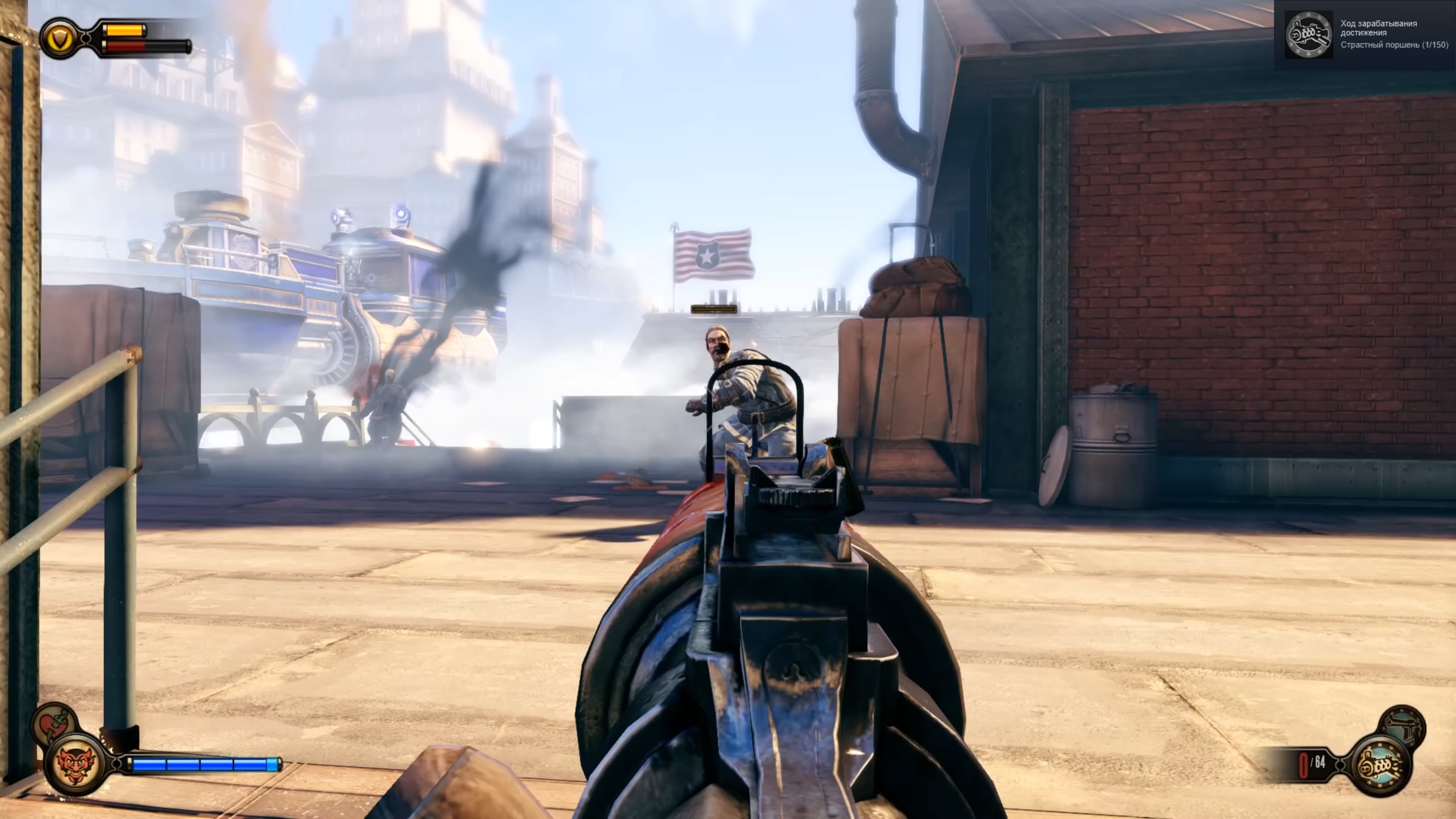 Геймплей BioShock Infinite — это настоящий экшен-коктейль для любителей шутеров от первого лица. Вы не просто стреляете по врагам; вы танцуете над пропастью! Благодаря своему верному «небесному крюку» (Sky-Hook), вы мгновенно перемещаетесь по специальным рельсам между островами Колумбии, устраивая воздушные акробатические номера прямо в разгаре перестрелки. Это не Call of Duty, друзья, это цирк высокого лета! А ещё у вас есть Вигоры — особые силы, которые позволяют вызывать бури, поджигать врагов или даже призывать союзников из других реальностей. Комбинируйте их с вашим оружием и окружением, и каждая схватка превратится в уникальное и зрелищное шоу. Главное — не забывайте про свою напарницу Элизабет, которая не просто стоит в сторонке, а активно помогает вам, доставая из карманов пространства-времени всё, что может пригодиться в бою.
