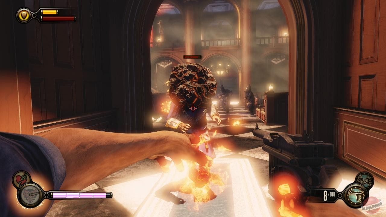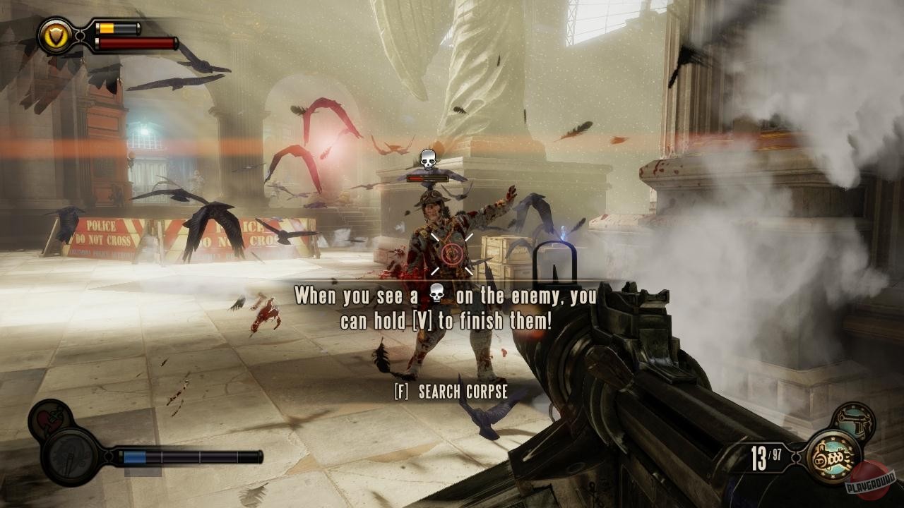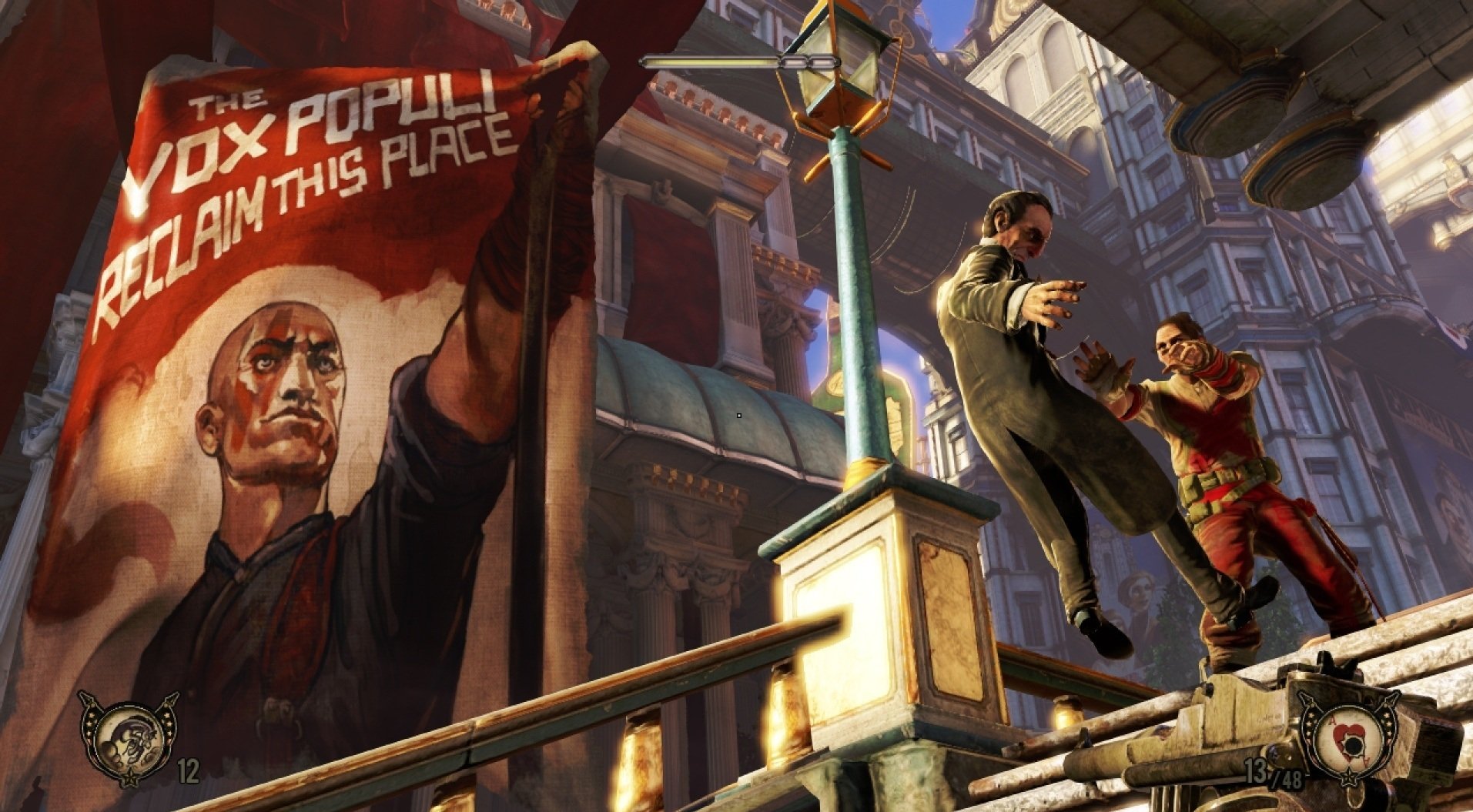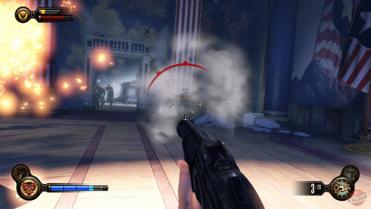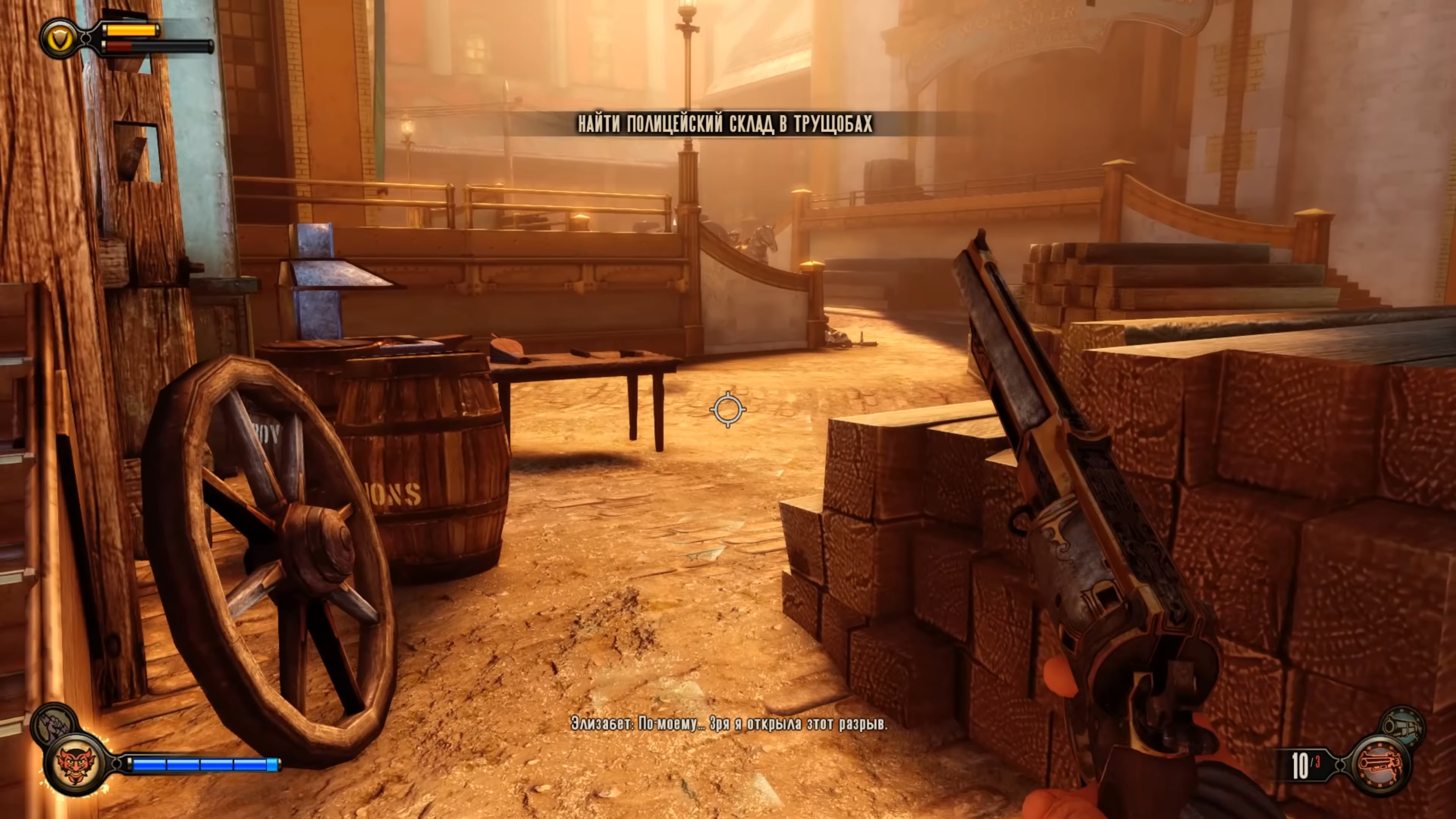Геймплей BioShock Infinite — это настоящий экшен-коктейль для любителей шутеров от первого лица. Вы не просто стреляете по врагам; вы танцуете над пропастью! Благодаря своему верному «небесному крюку» (Sky-Hook), вы мгновенно перемещаетесь по специальным рельсам между островами Колумбии, устраивая воздушные акробатические номера прямо в разгаре перестрелки. Это не Call of Duty, друзья, это цирк высокого лета! А ещё у вас есть Вигоры — особые силы, которые позволяют вызывать бури, поджигать врагов или даже призывать союзников из других реальностей. Комбинируйте их с вашим оружием и окружением, и каждая схватка превратится в уникальное и зрелищное шоу. Главное — не забывайте про свою напарницу Элизабет, которая не просто стоит в сторонке, а активно помогает вам, доставая из карманов пространства-времени всё, что может пригодиться в бою.