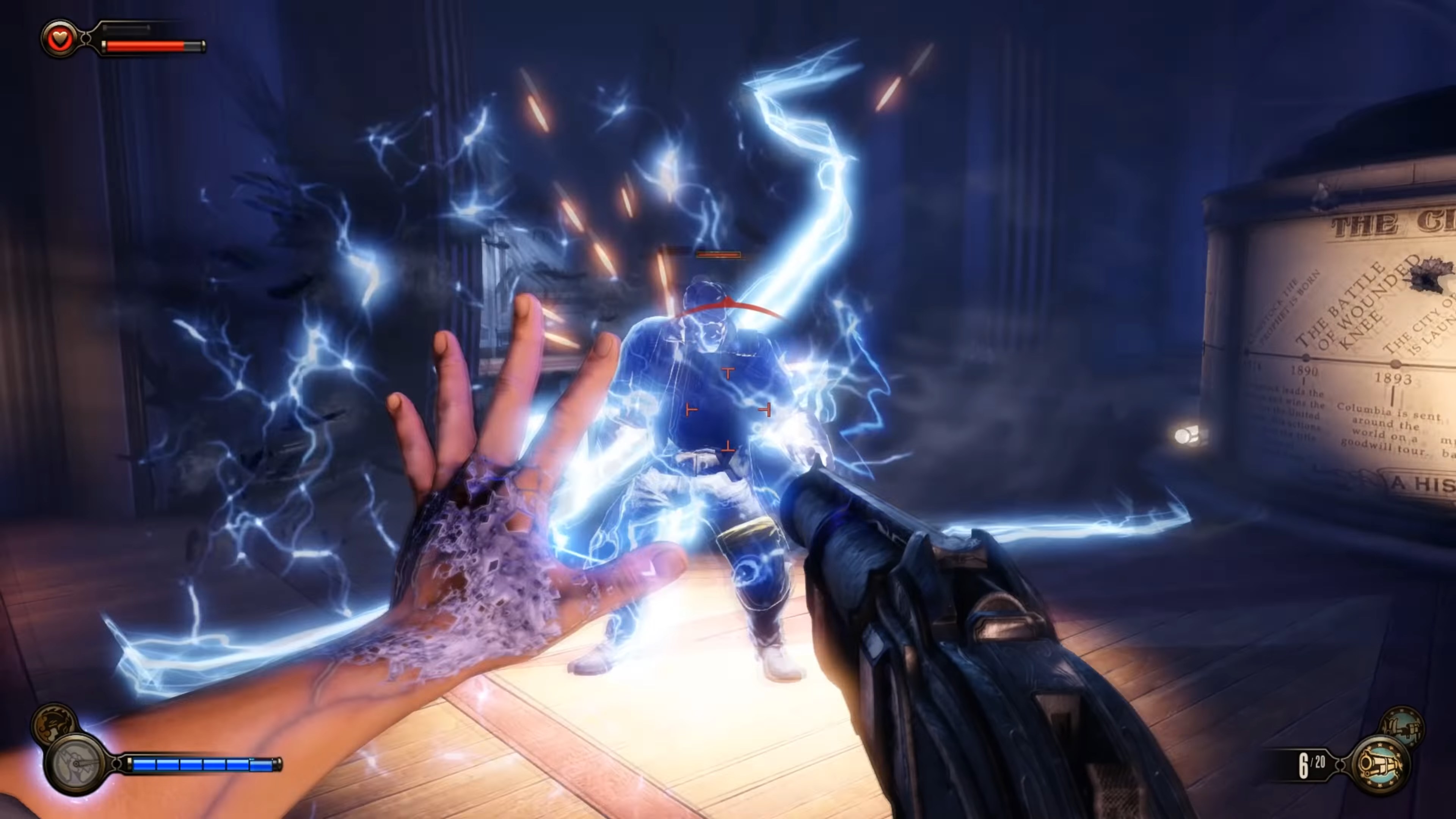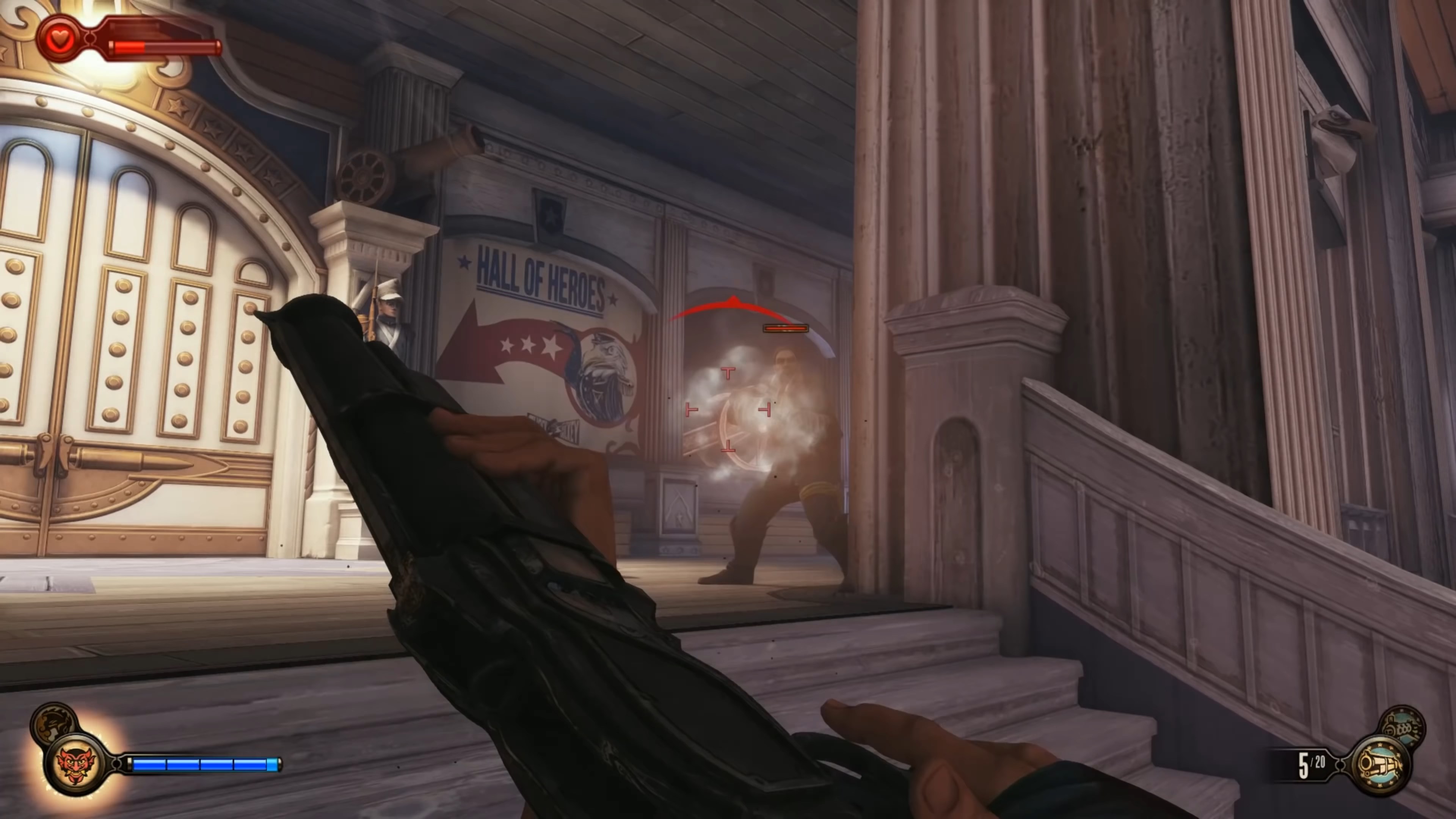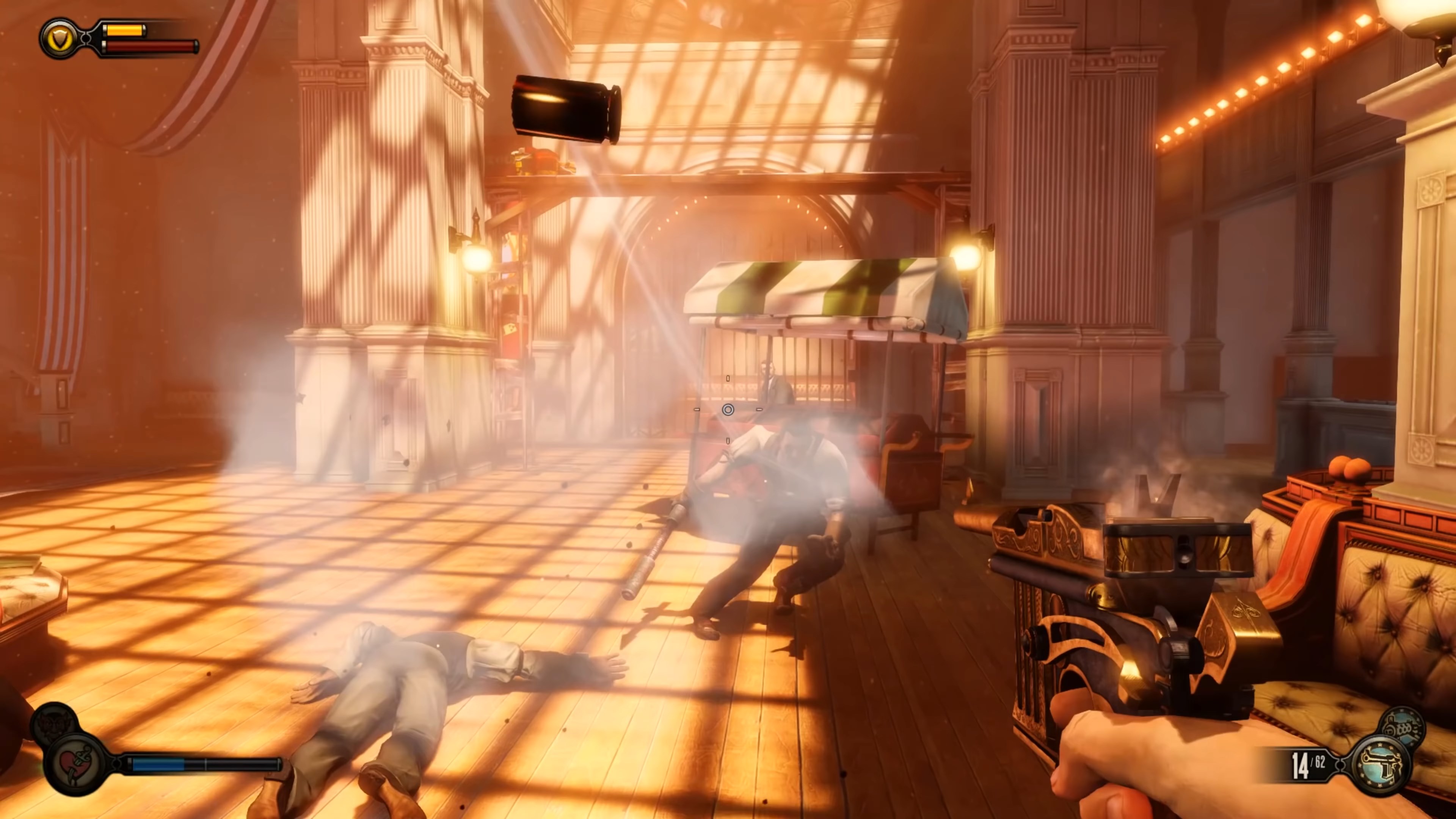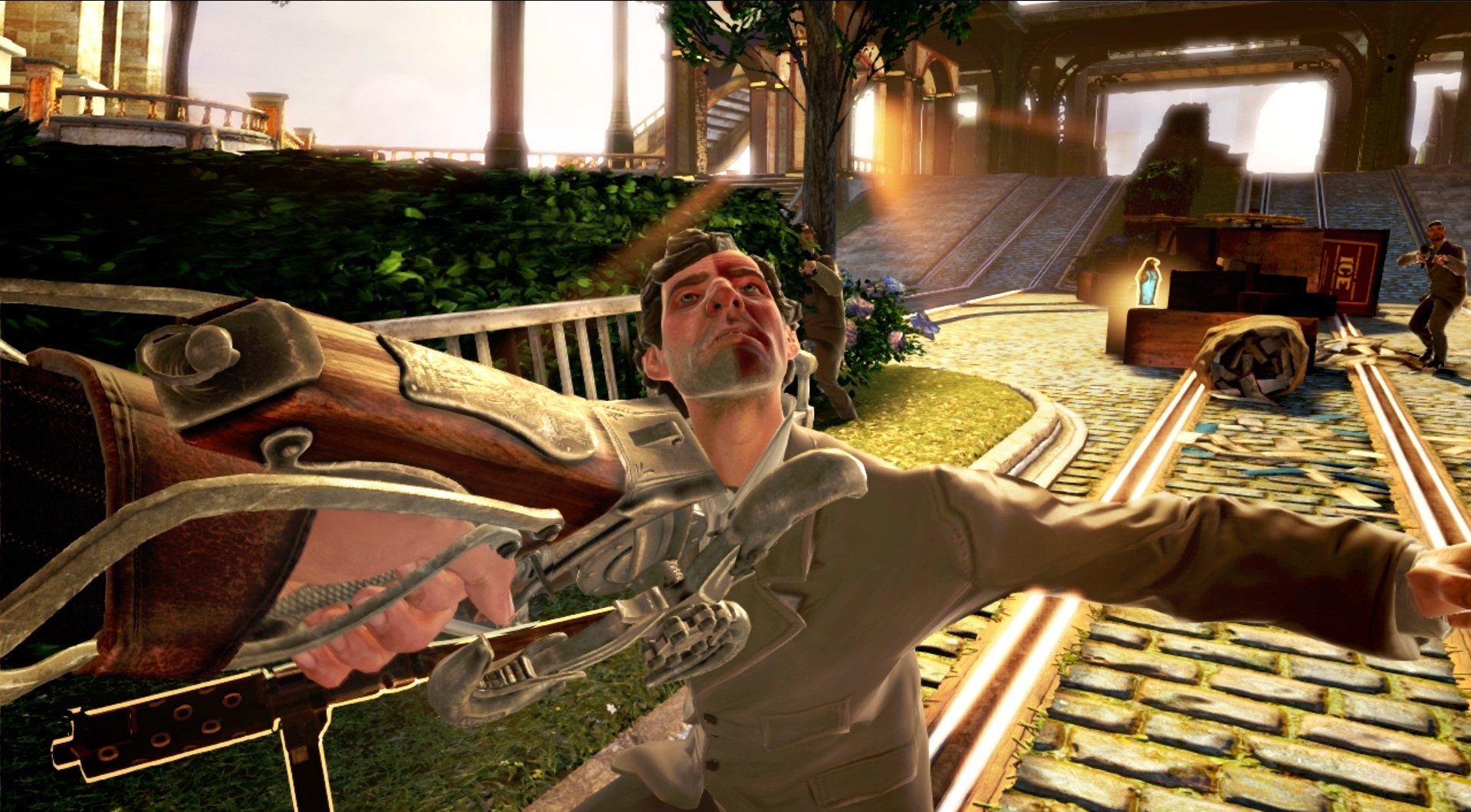 Геймплей BioShock Infinite — это настоящий экшен-коктейль для любителей шутеров от первого лица. Вы не просто стреляете по врагам; вы танцуете над пропастью! Благодаря своему верному «небесному крюку» (Sky-Hook), вы мгновенно перемещаетесь по специальным рельсам между островами Колумбии, устраивая воздушные акробатические номера прямо в разгаре перестрелки. Это не Call of Duty, друзья, это цирк высокого лета! А ещё у вас есть Вигоры — особые силы, которые позволяют вызывать бури, поджигать врагов или даже призывать союзников из других реальностей. Комбинируйте их с вашим оружием и окружением, и каждая схватка превратится в уникальное и зрелищное шоу. Главное — не забывайте про свою напарницу Элизабет, которая не просто стоит в сторонке, а активно помогает вам, доставая из карманов пространства-времени всё, что может пригодиться в бою.