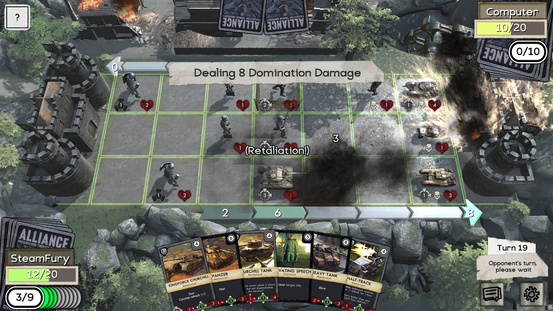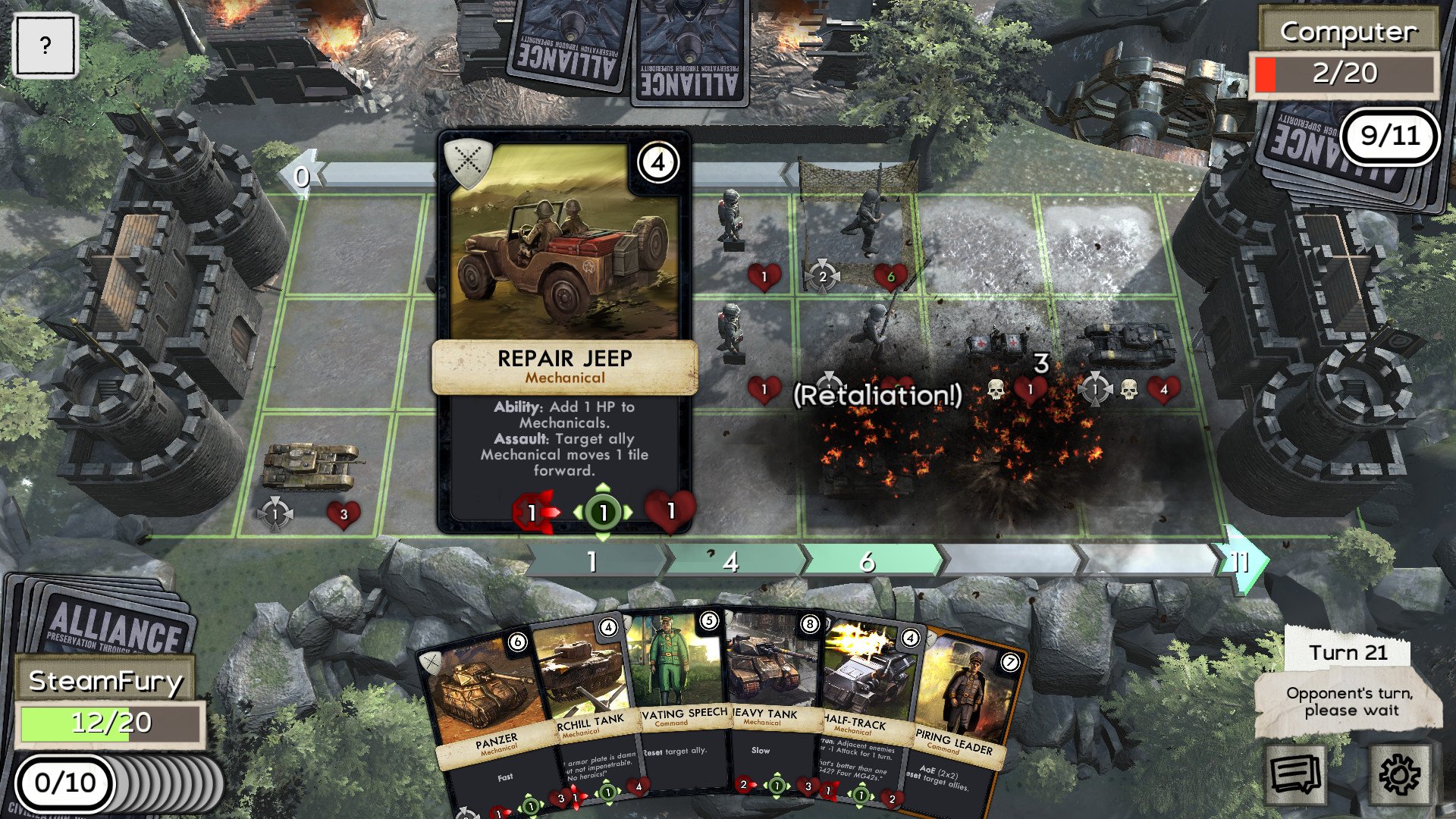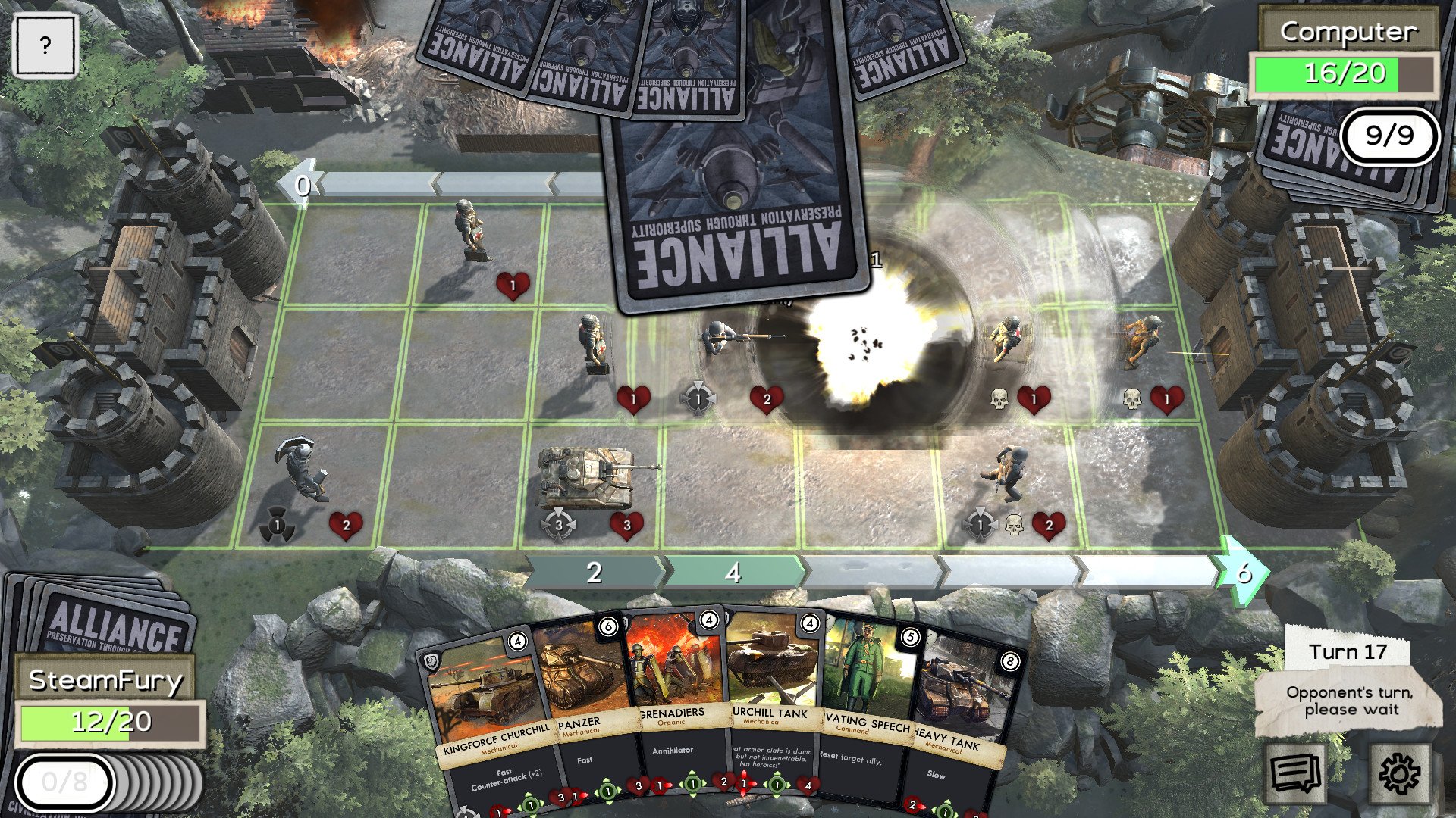 Геймплей MoW: Face Off XL — это идеальный микс между головоломкой и адреналиновым PvP-поединком. Вас ждут пошаговые сражения, где скорость реакции уступает место холодному расчёту и хитроумным тактическим уловкам. Вам предстоит собирать огромную коллекцию карт, каждая из которых представляет уникальное подразделение, здание или особую способность из этого альтернативного мира. Хотите отправить в бой летающий линкор? Пожалуйста! А может, построить оборонительную линию из роботов-танков? И это тоже возможно! Игра бросает вызов вашему интеллекту, заставляя думать на несколько ходов вперёд, как настоящему полководцу. И да, здесь нет места для "нажал и забыл" — только чистая, неразбавленная стратегия в лучших традициях жанра.