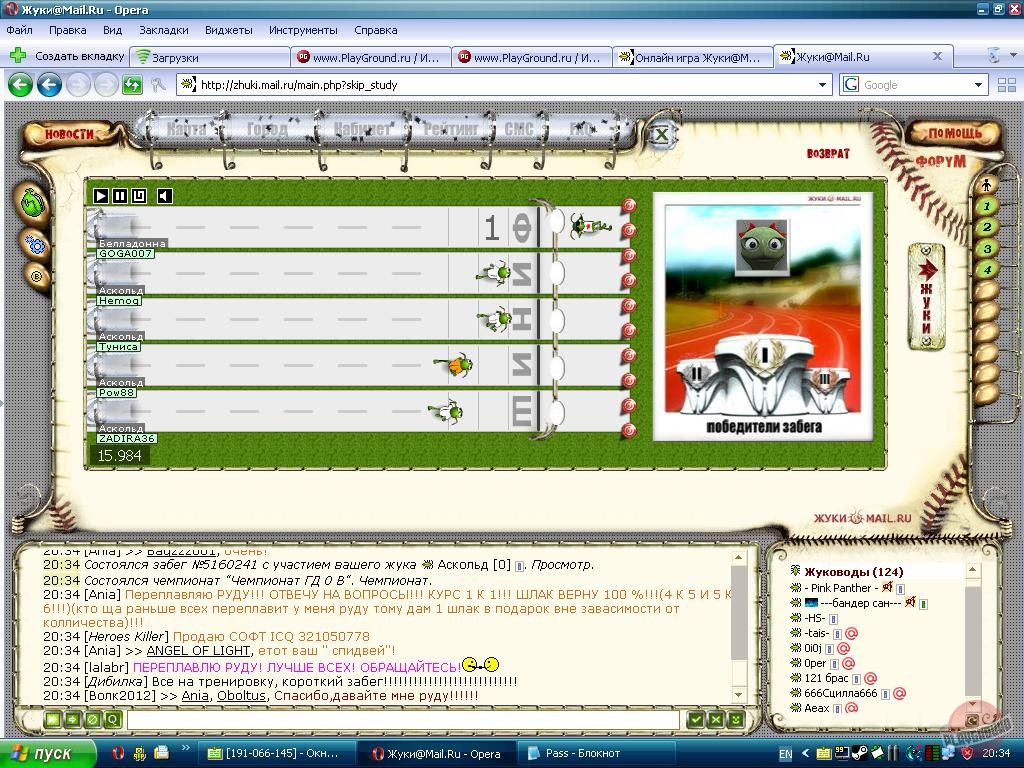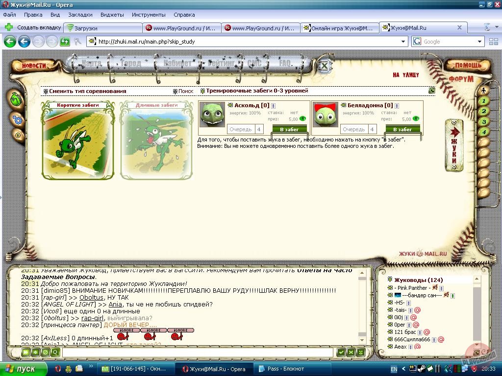 ЖУКИ@Mail.ru - это многопользовательская он-лайн игра, в которой бесплатно может принять участие каждый пользователь сети. Главное — наличие компьютера, Интернета и, конечно, желания. Пользователь заводит себе жуков, тренирует и воспитывает их, а питомцы зарабатывает для себя и хозяина деньги и славу, участвуя в спортивных соревнованиях.