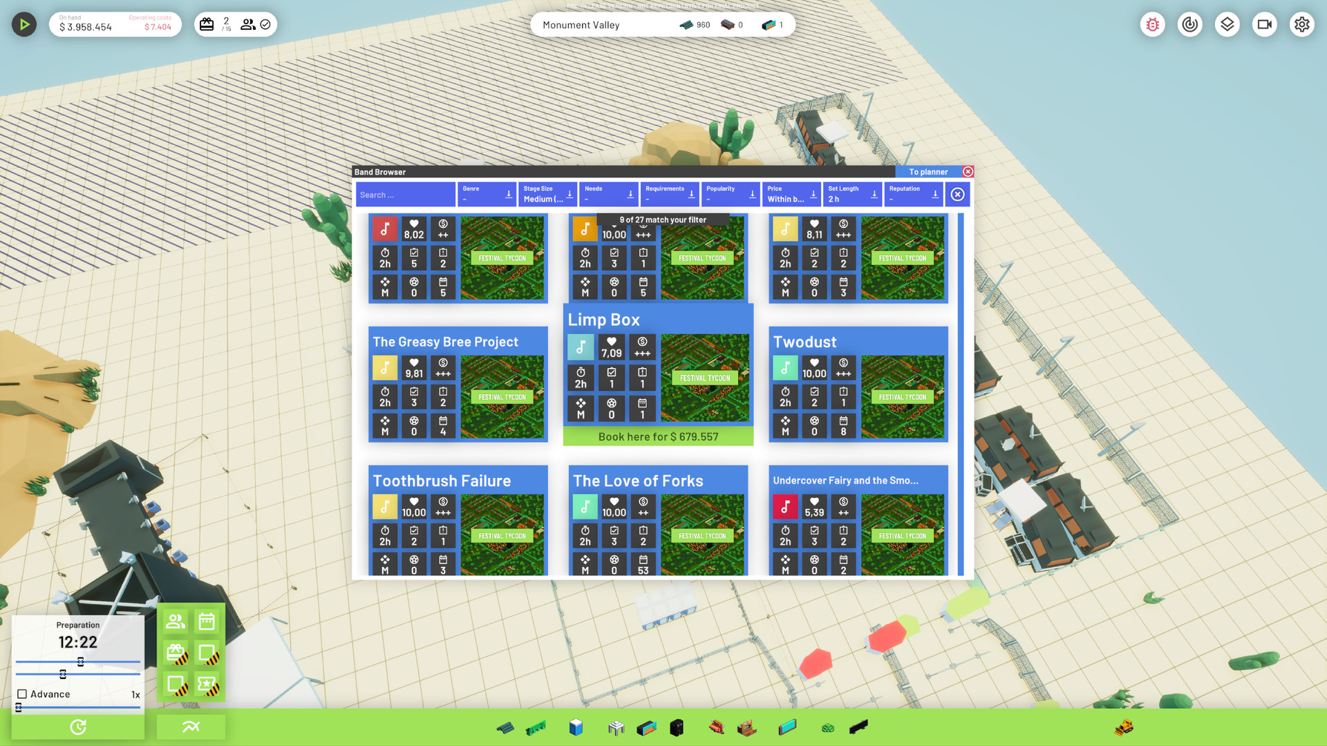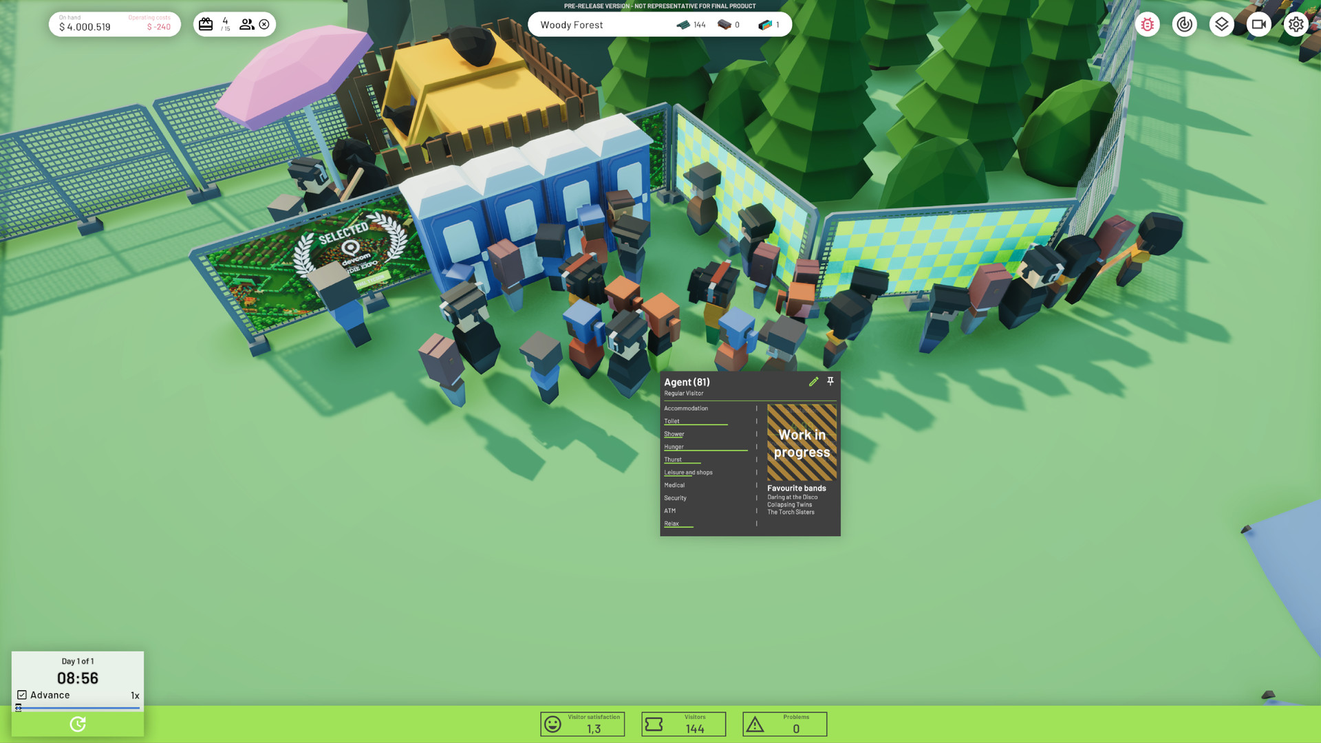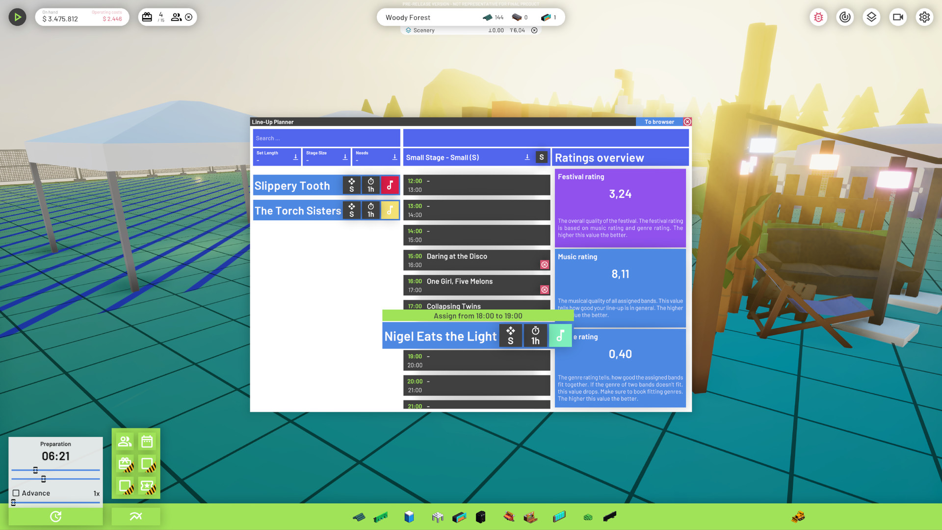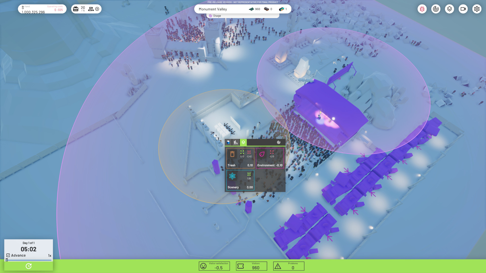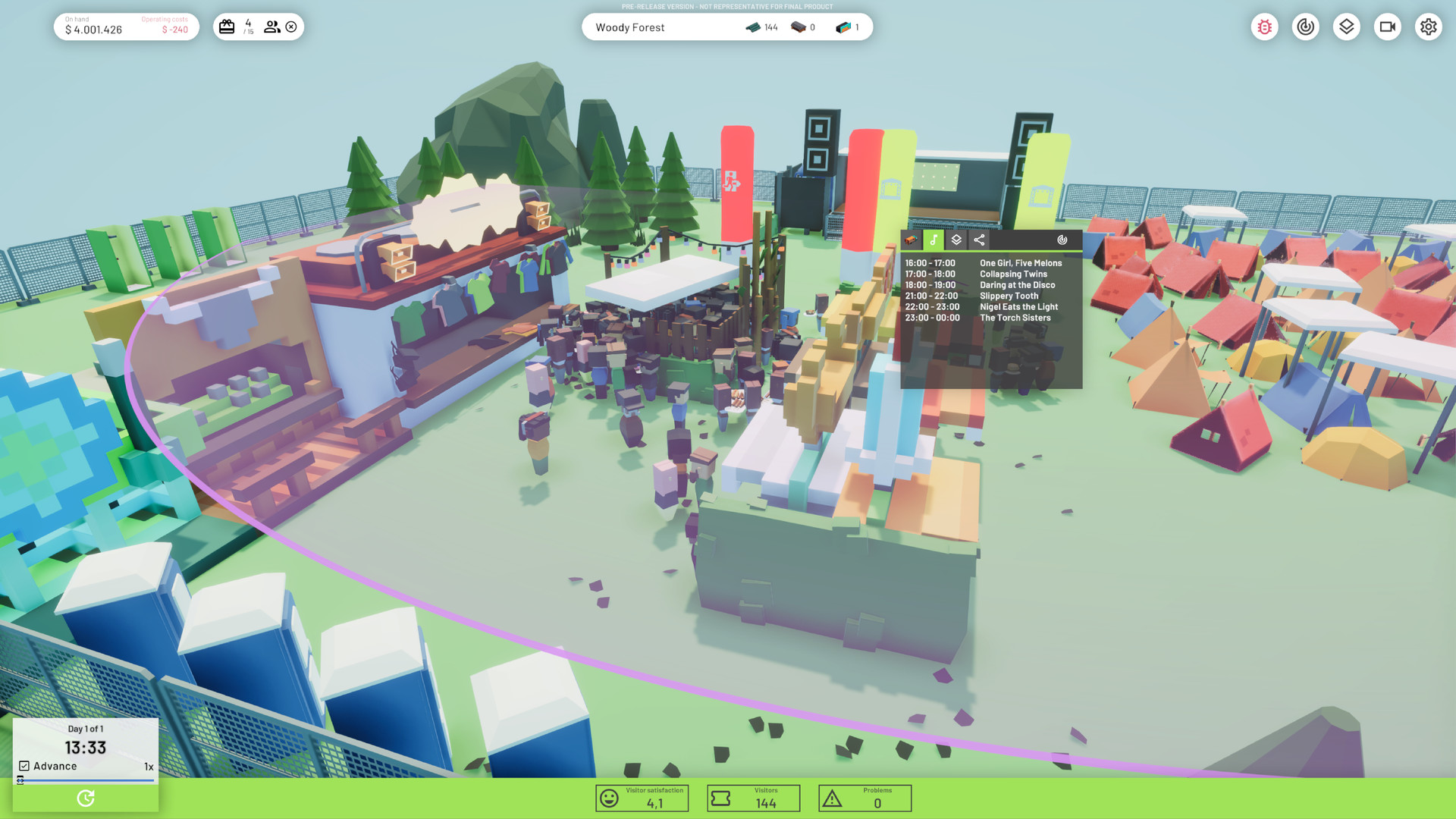 Симулятор менеджмента, в котором вам необходимо организовывать и проводить музыкальные фестивали под открытым небом. Привозите группы, сооружайте сцены, устанавливайте палатки, туалеты, тележки с едой и повышайте репутацию вашего фестиваля на радость спонсорам и вашему кошельку.