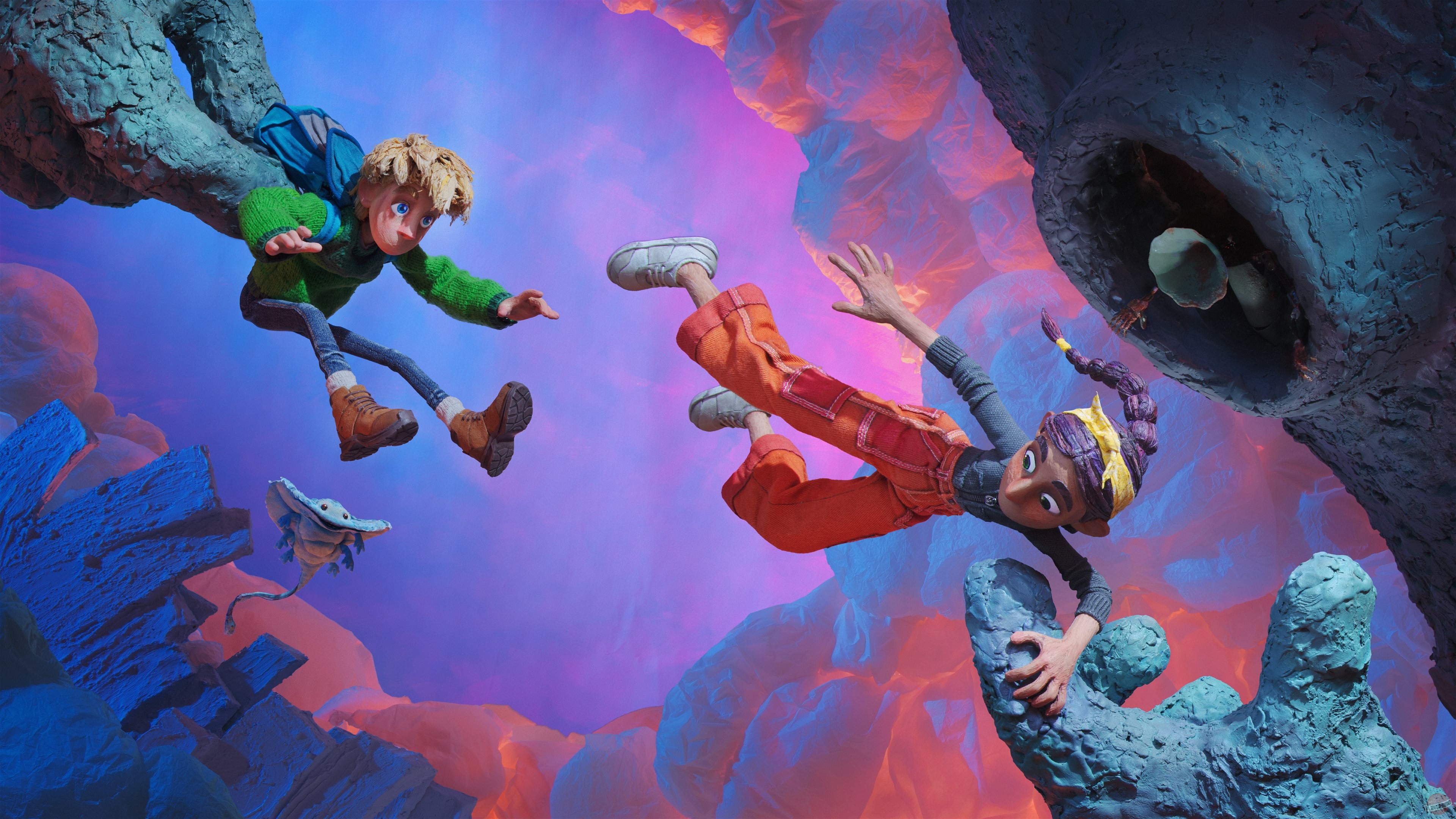 Двое подростков — Курт и Карла — хотели признаться друг другу в любви, но в самый ответственный момент у них пропали голоса. То есть буквально исчезли рты. А потом они ещё и провалились в какой-то странный мир, где теперь им надо всех спасать. Но самое интересное тут даже не сюжет, а то, как всё это выглядит. Представьте, что кто-то взял пластилин, налепил из него кучу человечков и домиков, а потом снял мультик, двигая всё это по чуть-чуть. Вот так всё тут и выглядит.