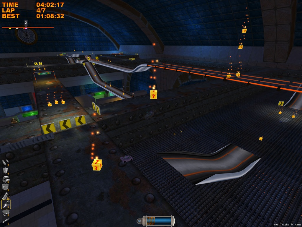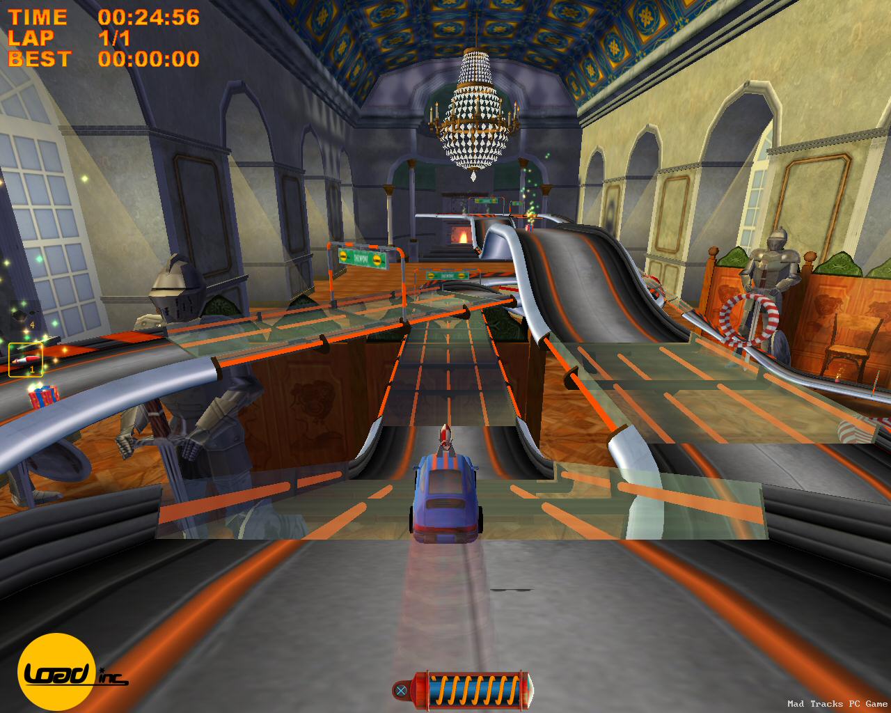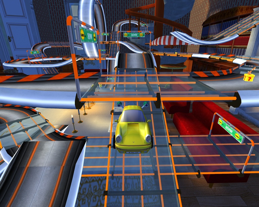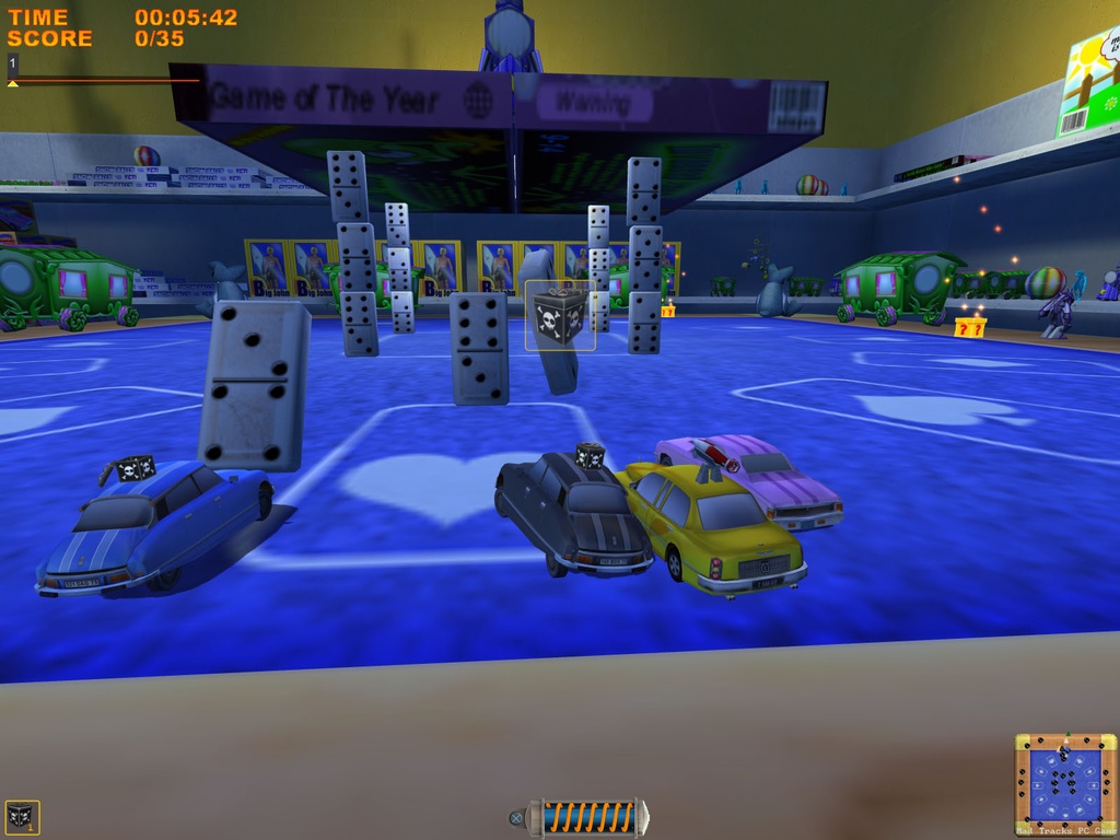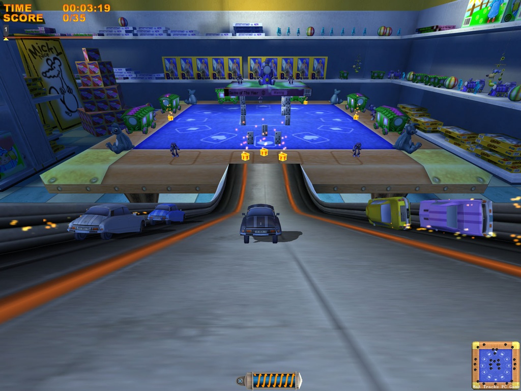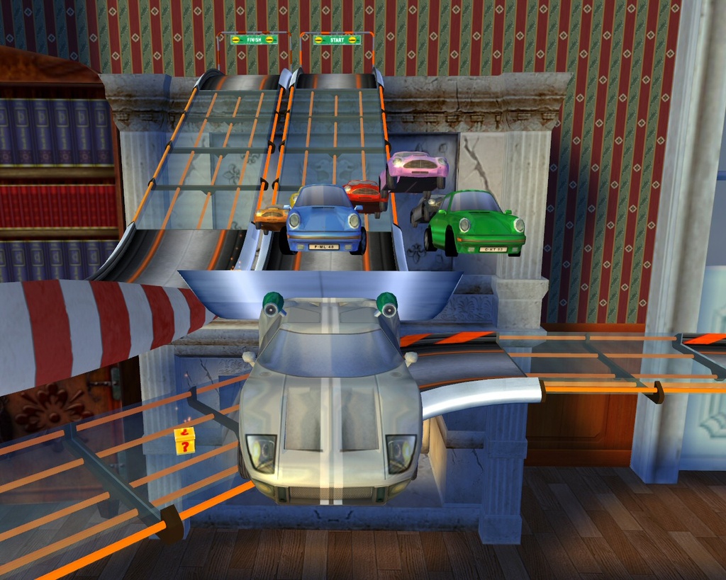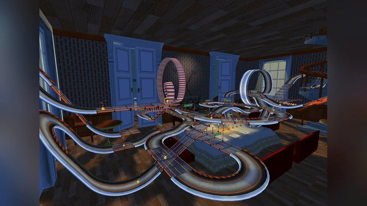 Забудьте всё, что вы знали о гонках! В Mad Tracks вас ждут не асфальтированные трассы Формулы-1, а настоящий хаотичный марафон по гигантским интерьерам, где ваш болид — это крошечная заводная машинка. Представьте: вы мчитесь на полной скорости через роскошную гостиную, делаете сальто на журнальном столике, пролетаете над диваном и устраиваете фейерверк из ракет прямо в баре, закрытом на ночь. Это не просто аркадные гонки, это безумное приключение в мире, где все предметы обихода превращаются в элементы сумасшедшего автодрома. Если вы всегда мечтали устроить гоночный апокалипсис на кухне или устроить погоню по крышам небоскрёбов в миниатюре, то эта игра — ваш идеальный выбор.