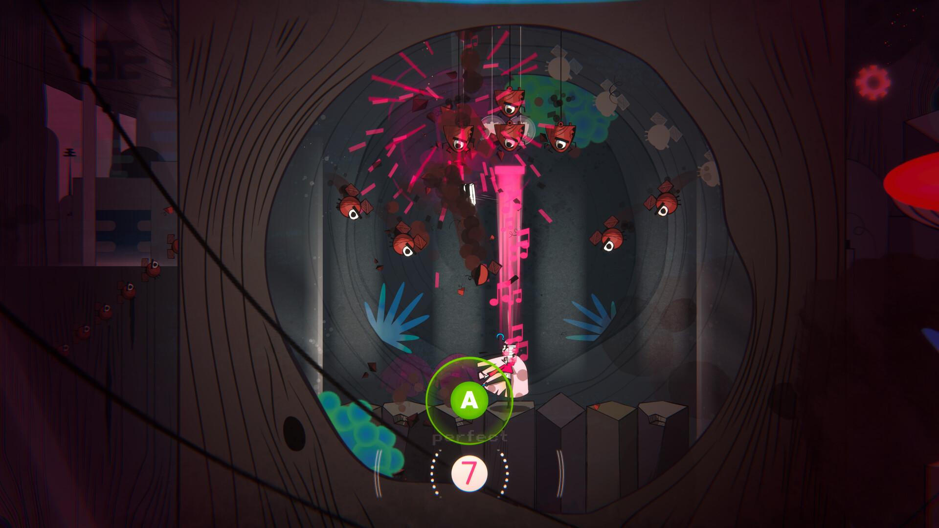 Микс из шутера, платформера и ритм-игры от французского разработчика Louis Rigaud, который ранее создал Iris and the Giant. В этот раз автор взялся за новую игровую вселенную, где три музыканта-бойца сражаются против орд роботов под собственный саундтрек. По сюжету безумная королева строит гигантскую электростанцию под названием «Дрель», от которой вся планета начинает вибрировать в такт этой адской машине.