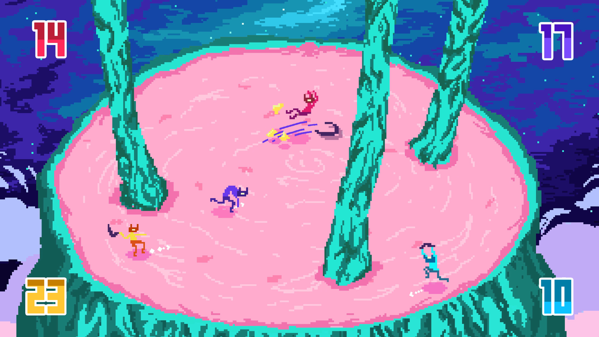 Bamerang - это пиксельный многопользовательский экшен, где игроки сражаются в 2-4 человека на небольшой арене, используя при этом бумеранги. Задача игроков - столкнуть своих оппонентов с поля боя, используя различные приемы и уловки. К услугам игроков - более двадцати уникальных арен со своими правилами, а также возможность играть как "каждый сам за себя", так и в команде.