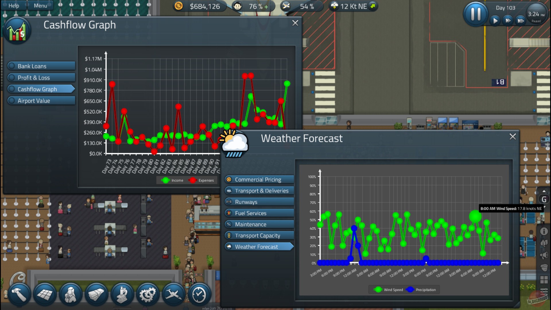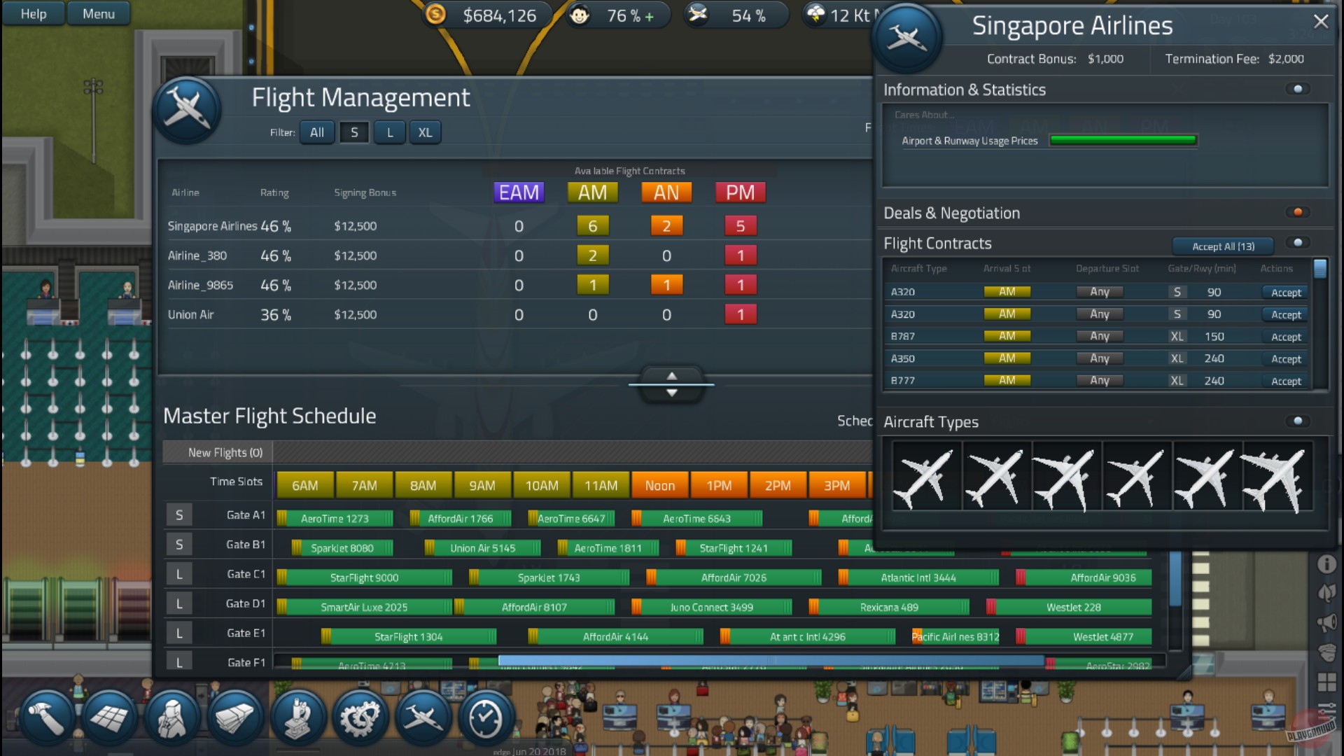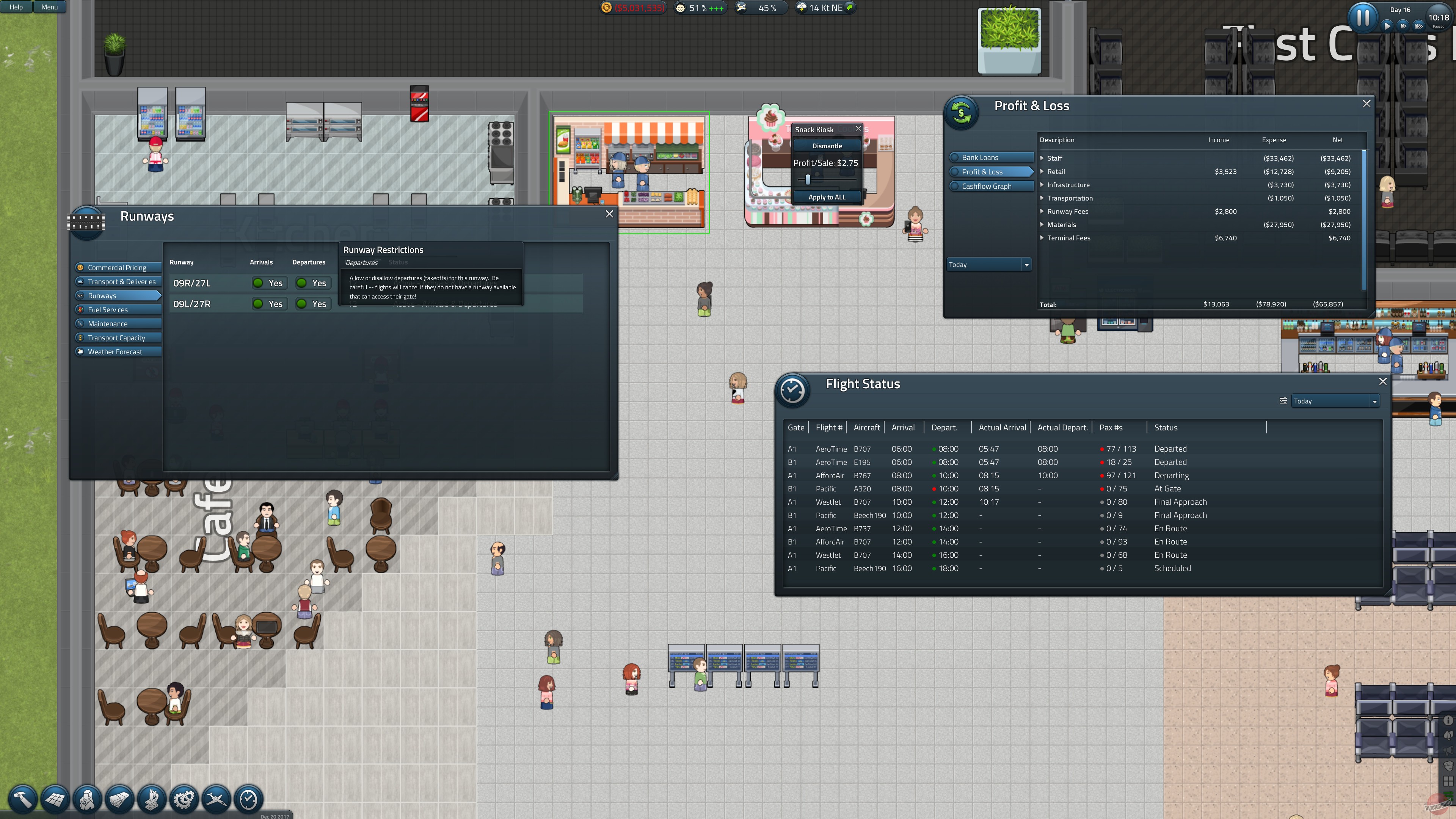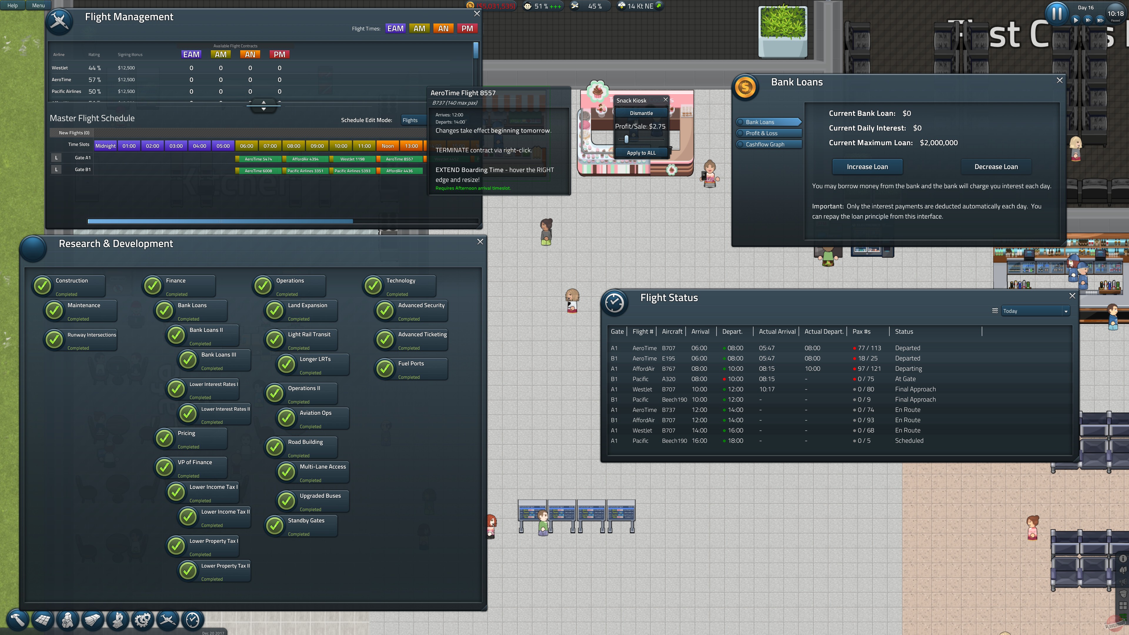В SimAirport вас ждет глубокий и детальный менеджмент каждого аспекта работы аэровокзала. Вы будете не просто ставить здания, как в конструкторе Лего, а продумывать каждую деталь: от маршрутов движения пассажиров и размещения стоек регистрации до найма персонала (будет ли ваш бариста готовить латте или спать на рабочем месте?) и переговоров с авиакомпаниями. Каждый рейс — это маленькая операция: нужно обеспечить топливо, бортовое питание, обслуживание и, конечно же, не забыть про багажную систему, которая, как известно из фильмов, — это черная дыра, где теряются чемоданы и надежды. Игра предлагает два основных режима: карьеру, где вы начинаете с нуля и постепенно расширяете свое воздушное королевство, и свободную игру, где можно сразу построить аэропорт своей мечты без ограничений. Это идеальный симулятор для тех, кто любит стратегии, градостроительные игры и чувствует в себе душу настоящего логистического гения.