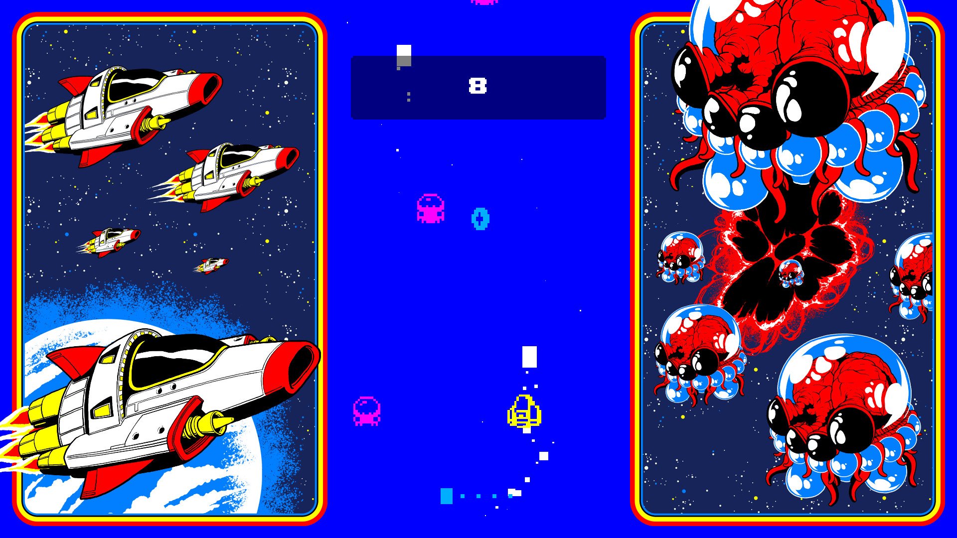 Switch 'N' Shoot — это любовное письмо классическим аркадам конца 70-х — начала 80-х, но с изюминкой, которая заставит ваш мозг работать на пределе. Ваш корабль постоянно движется по экрану, а благодаря эффекту "screen-wrapping" (то есть, если вы вылетаете слева, то появляетесь справа, и наоборот) пространство превращается в бесконечную петлю. Геймплей настолько прост в освоении, что его поймёт даже ваша бабушка, но так сложен в совершенстве, что для получения высокого счёта потребуется время и немало попыток. Это как одновременно играть в "Space Invaders", управлять автомобилем задним ходом и жонглировать цепными пилами — весело, хаотично и невероятно затягивает! Идеальный выбор для фанатов ретро-гейминга, хардкорных аркад и тех, кто ищет быструю, но глубокую игру для Nintendo Switch или ПК.