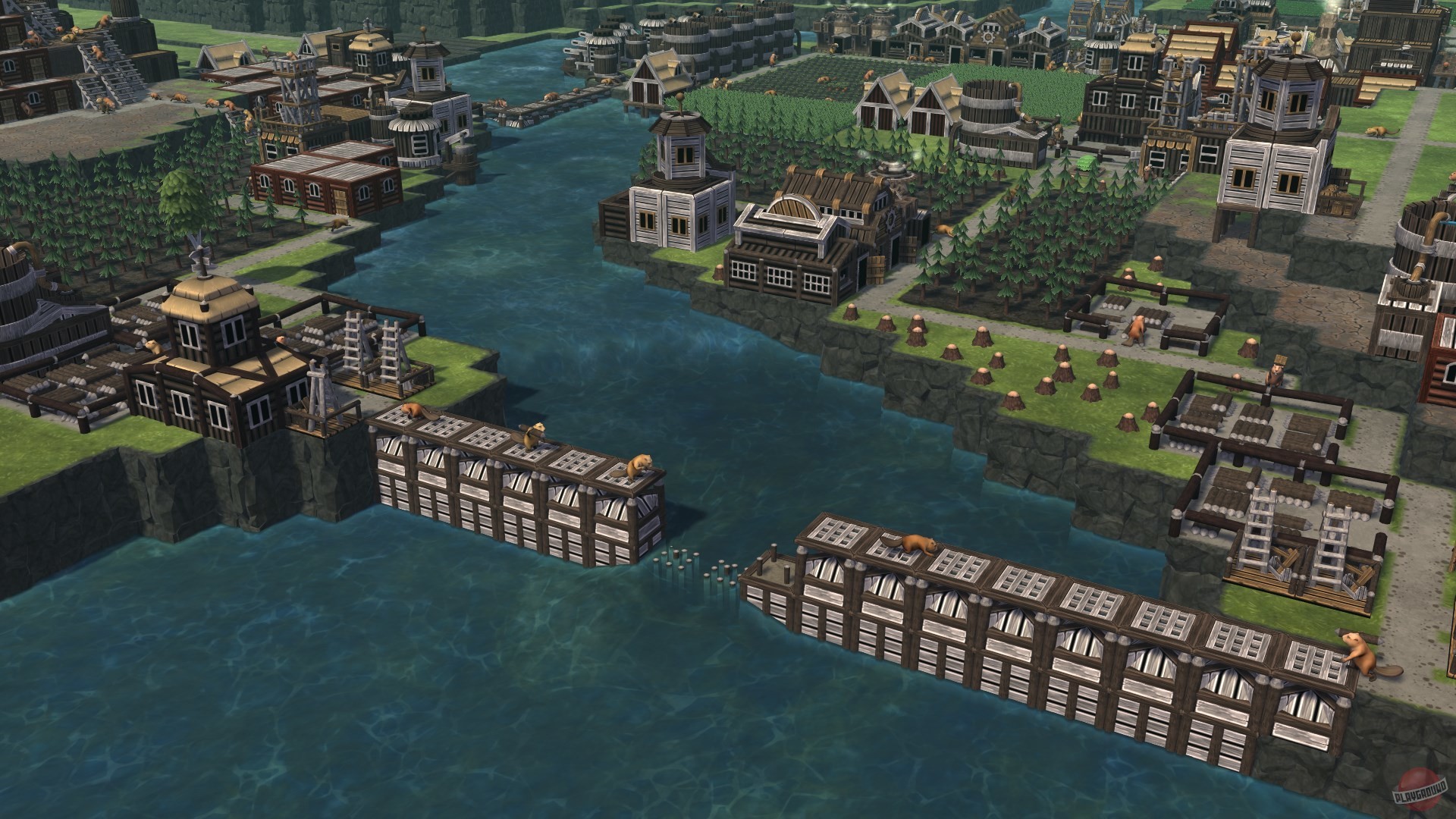 Timberborn — это градостроительный симулятор в реальном времени с изометрическим видом, где каждое ваше решение имеет значение. Главная фишка игры — это динамическая система гидрологии. Представьте: река — ваш лучший друг и самый коварный враг одновременно. В сезон дождей она может затопить все ваши старания, а в засуху — оставить колонию без капли воды. Поэтому ваша работа — не просто ставить домики один за другим, а продумывать сложнейшую систему плотин, каналов, насосов и резервуаров, чтобы укротить стихию. Это как «Водный мир», но вместо Кевина Костнера у вас команда бобров, которые строят водяные колёса и запасают морковку. Вы будете не просто строить город, а создавать сложный, живой механизм, где каждый житель — важный винтик в общей системе выживания.