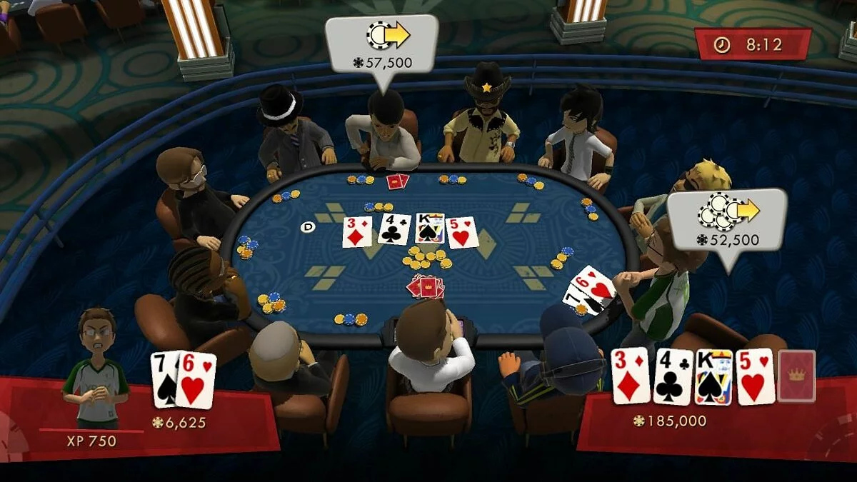 Геймплей Full House Poker построен на чистом, проверенном временем Техасском Холдеме, но с изюминкой. Разработчики из Microsoft Studios и Krome Studios добавили режим Texas Heat — серию напряженных турниров, где вы начинаете с нуля и должны пробиваться наверх, как настоящий герой боевика. Каждая победа приближает вас к вершине, а поражение — это просто повод для новой эпичной мести в следующей раздаче. Главная фишка игры — это ваши эмоции. Благодаря системе выражений лица и жестов вашего аватара, вы можете издеваться над соперниками после удачного блефа, демонстрировать уверенность, когда у вас на руках мусор, или же скорбно опускать голову, проиграв банк на последнем борде. Это не просто игра в покер онлайн, это театр одного актера, где главная роль — ваша пухлая от фишек стопка и нервы соперников.