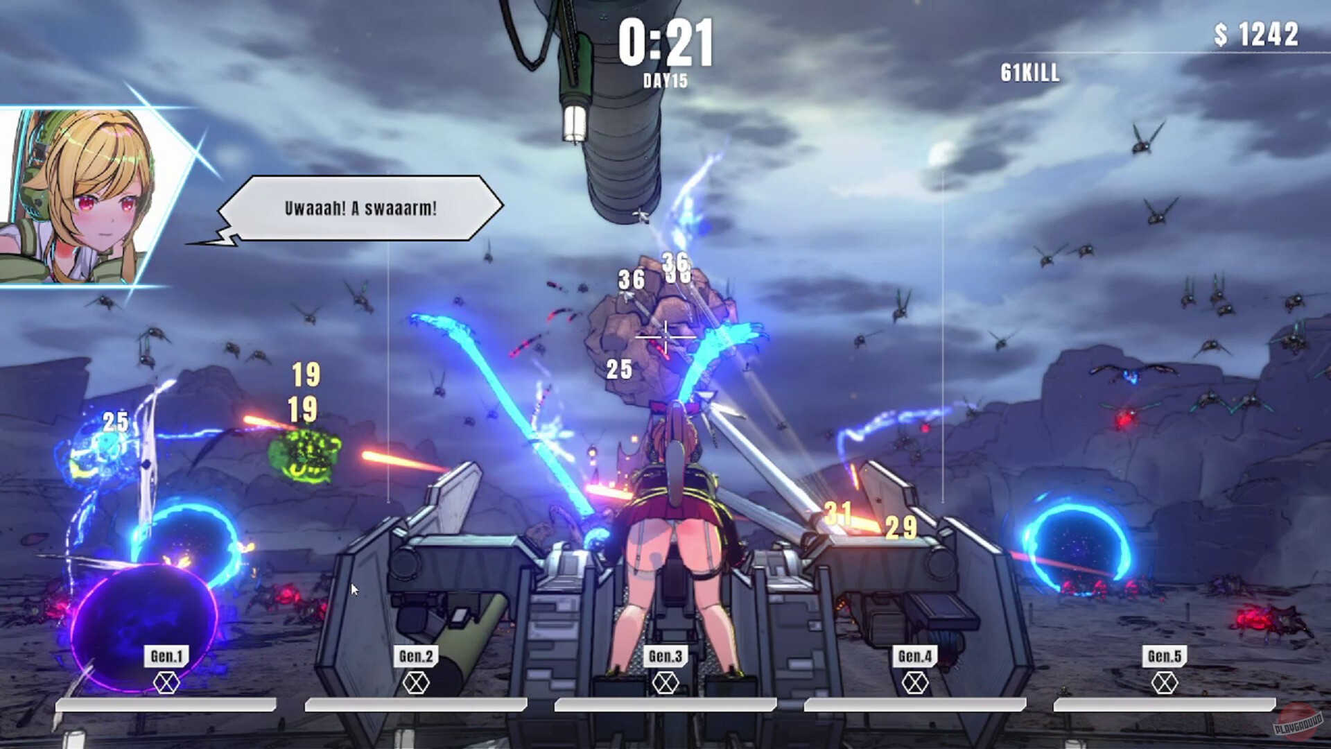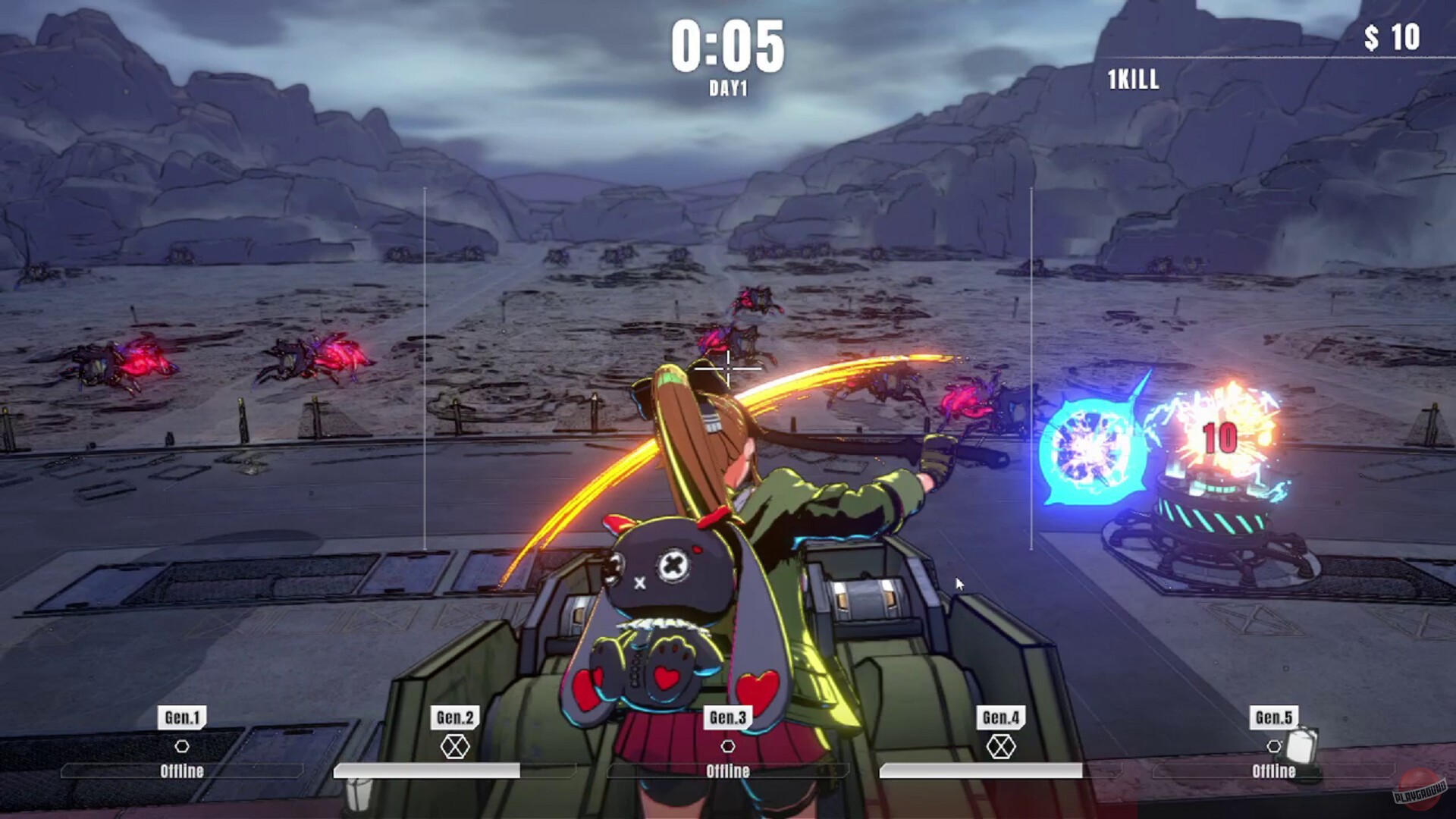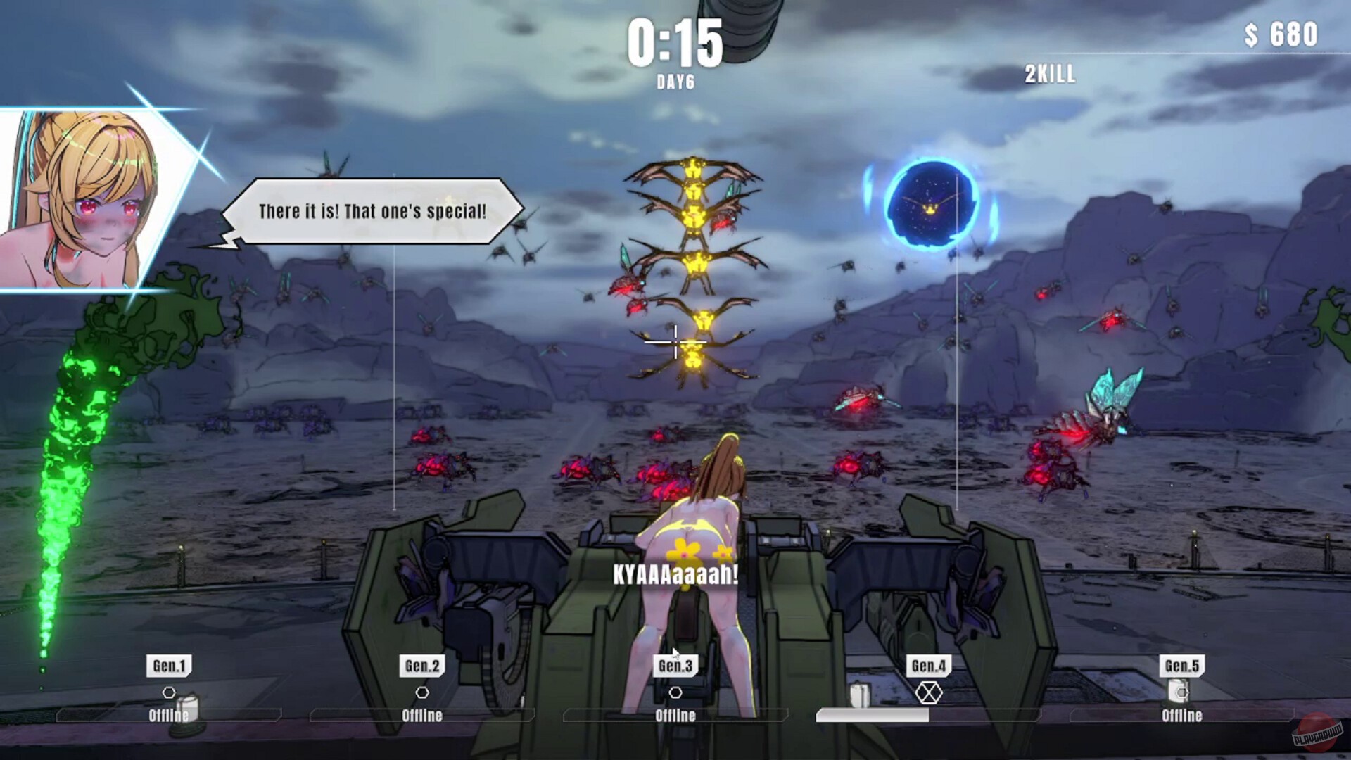 Игра про аниме-девушку, которая сидит на турели и отстреливает пришельцев. Она работает в какой-то военной организации с названием P.A.N.T.S.U. и должна защищать генератор, который заряжает суперорудие для спасения Земли. Пришельцы лезут через порталы волнами, а вы их отстреливаете, вот и весь геймплей.