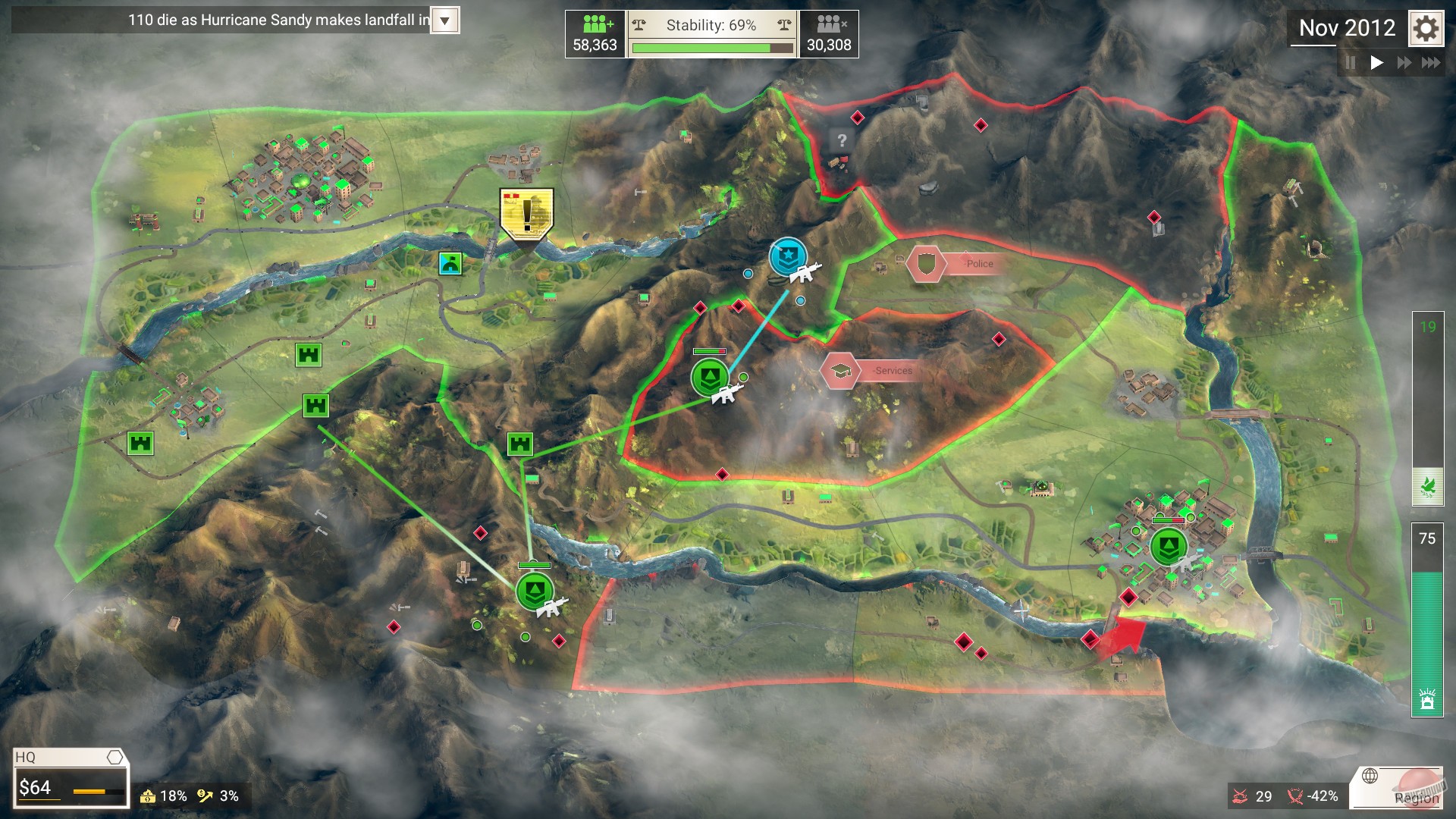 Геймплей Rebel Inc. — это идеальный баланс между глубокой стратегией и доступностью. Вы управляете регионом в режиме реального времени, распределяя бюджет между военными операциями, гражданским строительством, борьбой с коррупцией и даже проведением PR-кампаний. Карта живёт своей жизнью: повстанцы атакуют, мирные жители мигрируют, а ваши советники постоянно навязывают вам свои планы, которые редко бывают хорошими. Игра невероятно затягивает своей сложностью и реализмом — вы будете проигрывать снова и снова, но каждый раз анализировать, что пошло не так, и пытаться найти тот самый золотой компромисс. Отзывы игроков единодушны: первые пару часов вы чувствуете себя полным неудачником, но потом вдруг «клик» происходит, и вы понимаете всю гениальность этой политической симуляции.