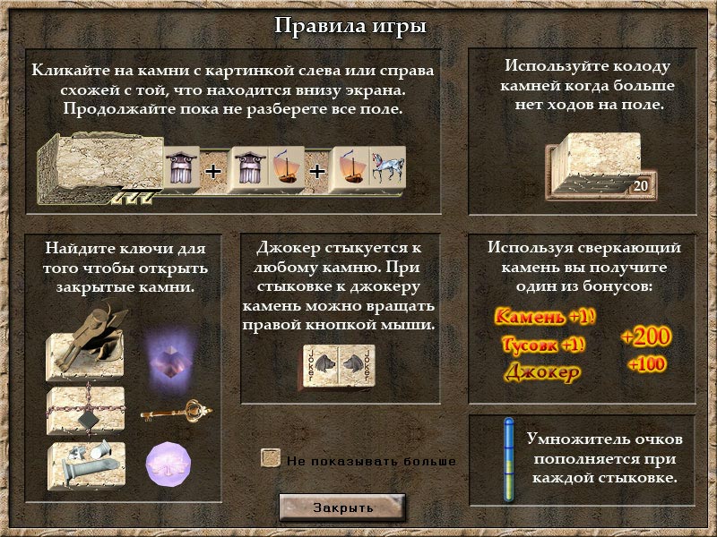Геймплей Каменного Пасьянса прост до гениальности, но увлекателен, как сериал «Спартанец». Вы смотрите на расклад камней и ищете два свободных (те, что не закрыты сверху и не зажаты с обеих сторон), которые имеют одинаковый рисунок. Кликнули — и пара исчезает, освобождая место для новых возможностей. Звучит легко? А вот и нет! Иногда нужные вам камни оказываются так глубоко в этой античной куче-мале, что их поиск превращается в настоящее археологическое приключение. Но не отчаивайтесь! У вас есть запасные камни — ваши личные «экзоскелеты» в этом интеллектуальном марафоне. Правда, их количество строго ограничено, так что используйте этот джокер с умом, а не как последний кусок пирога на празднике.