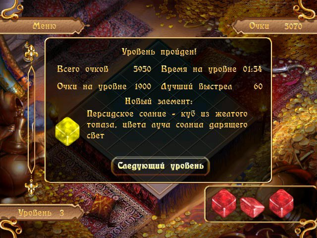 "Сокровища Персии" - игра-головоломка, где игрок решает арабские загадки. Составляйте группы из трехмерных разноцветных кубиков таким образом, чтобы расчистить игровое поле. Собирайте драгоценности на каждом из уровней, чтобы получить максимальное количество очков и бонусов.