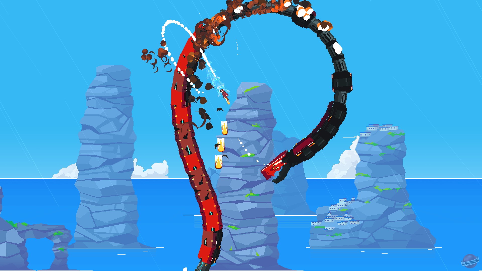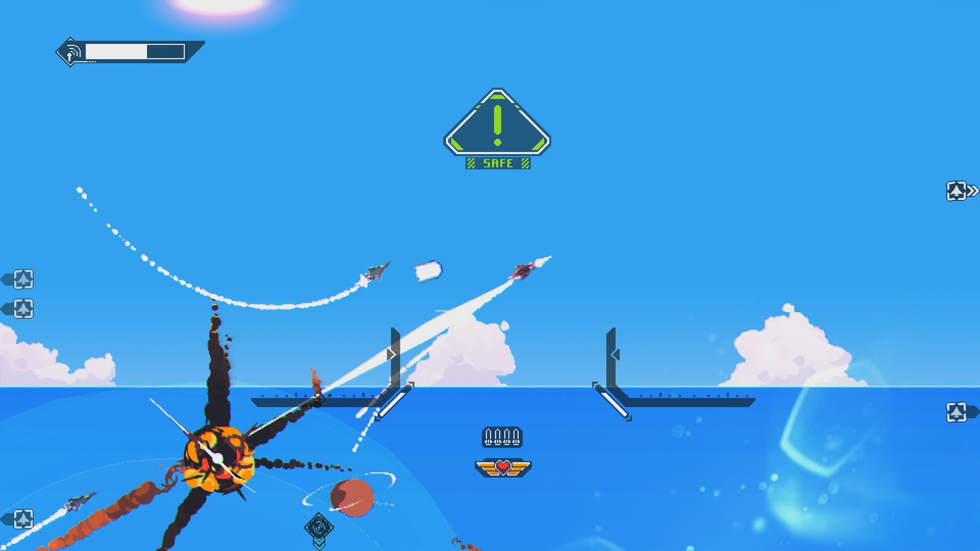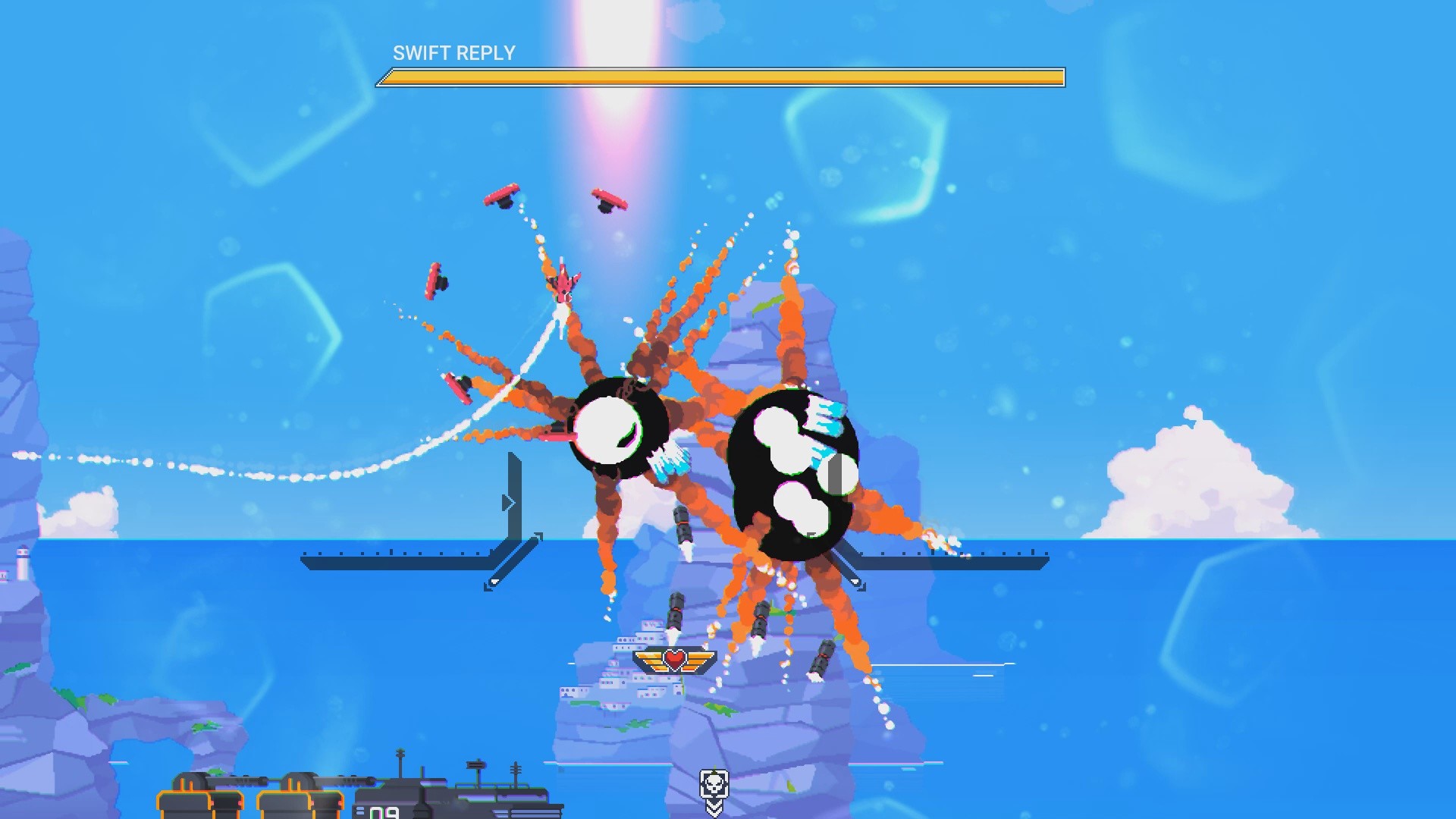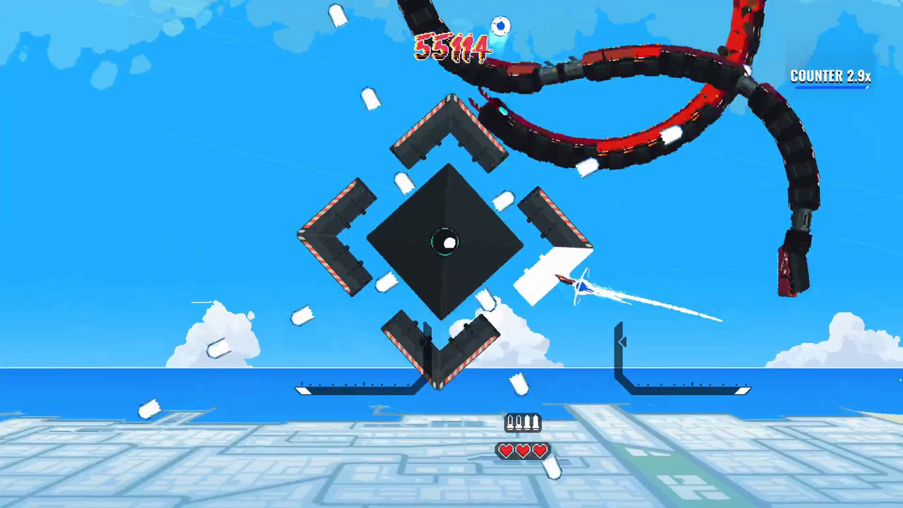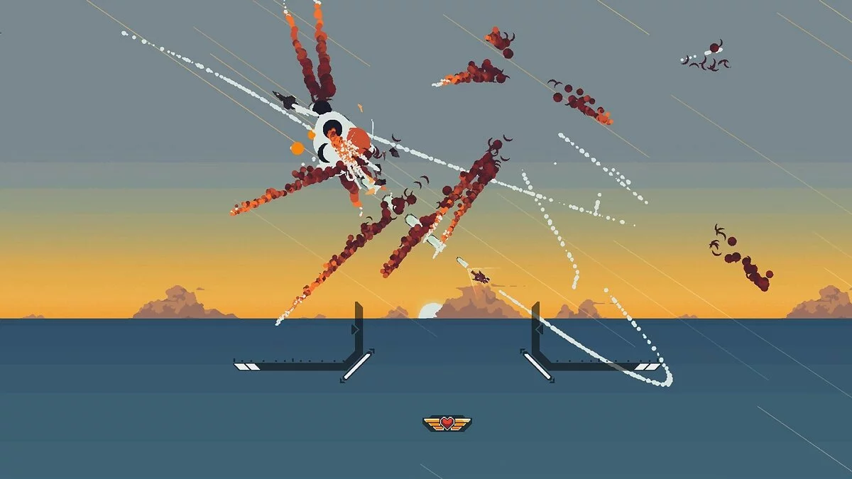Геймплей здесь — это сплошной кайф для любителей скорости и точности. Вы получаете полную свободу перемещения в 2D-пространстве: можете взмывать в зенит, пикировать вниз или выполнять сальто прямо под носом у разъярённого меха. Это не те старые добрые рельсовые шутеры, где вы просто смотрите вперёд и стреляете. Нет, в Jet Lancer вам придётся активно маневрировать, используя буст для резких ускорений и уклонений, чтобы выжить в этом хаосе из взрывов, трассирующих пуль и реактивных следов. Каждое столкновение превращается в захватывающий танец смерти, где победа достаётся тому, кто быстрее сообразит и точнее нажмёт на курок. А ещё здесь есть огромные роботы, которых нужно уничтожать — потому что почему бы и нет? Ведь кто не мечтал в детстве стать истребителем, который сбивает дронов и одновременно рубится с гигантским мехом?