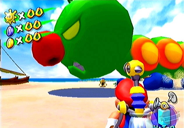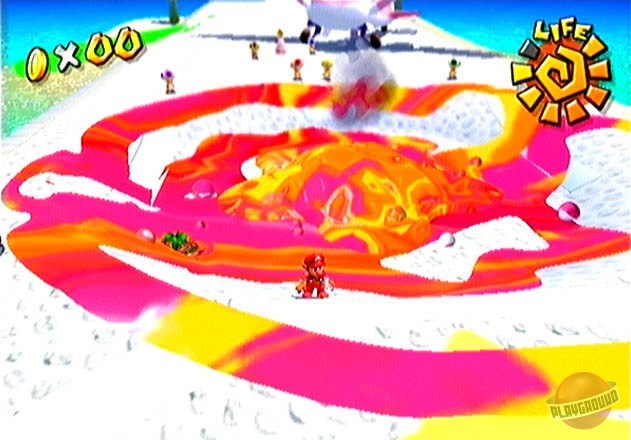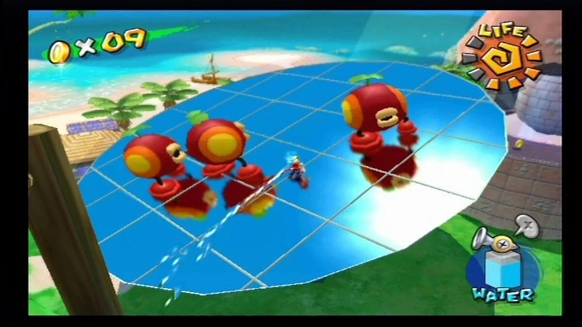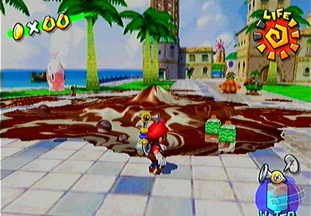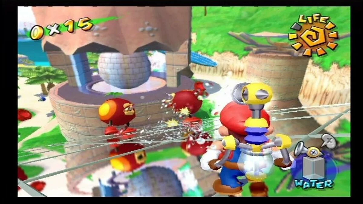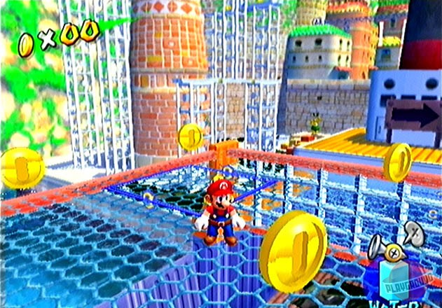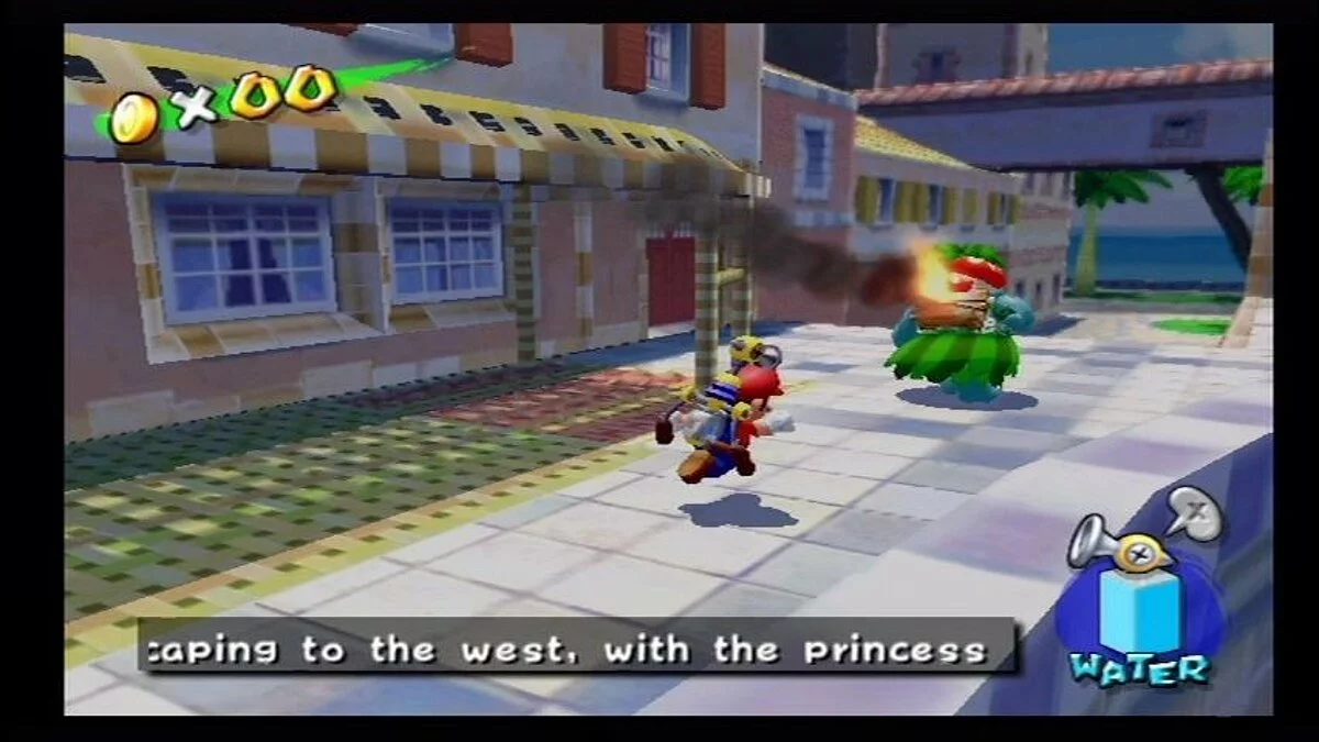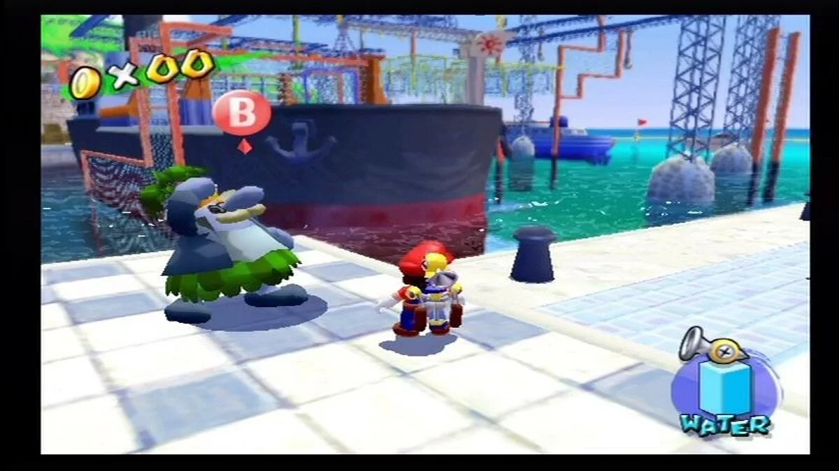 Геймплей Super Mario Sunshine — это взрыв веселья и креатива. Вам предстоит исследовать солнечный остров Дельфино, разделенный на уникальные зоны: от пляжей и деревень до парков развлечений и даже канализации (ну куда же без неё!). Ваша задача — собирать «Блестяшки Солнца» (Shine Sprites), которые являются ключом к прогрессу. Как их получить? Да как угодно! Промойте фасады домов от грязи, потушите пожары, победите забавных боссов, решите головоломки или просто найдите спрятанные секреты. F.L.U.D.D. — не просто шланг; он настоящий швейцарский нож для платформера: переключайтесь между режимами струи, реактивного ранца для полетов и даже турбо-спринта. Это делает управление Марио невероятно динамичным и открывает массу возможностей для нестандартного прохождения уровней. И да, здесь больше сюжета и диалогов, чем во всей серии вместе взятой — каждый NPC на острове готов рассказать свою историю!