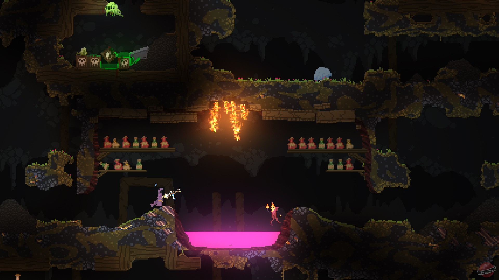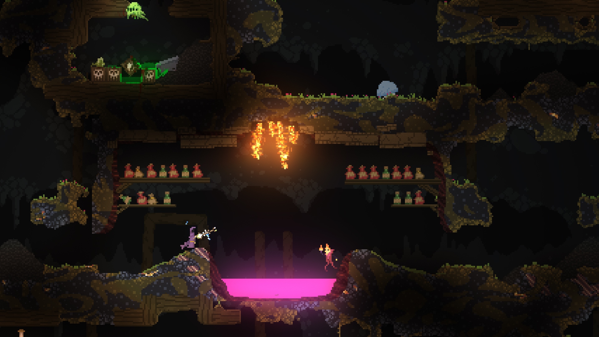 Добро пожаловать в Noita — игру, где ваша магия настолько мощная, что вы можете случайно испарить себя, свою пещеру и половину карты за пару секунд! Эта уникальная смесь жанров roguelike и платформера с элементами песочницы предлагает вам стать могущественным (но крайне хрупким) колдуном в мире, где буквально каждый пиксель подчиняется законам физики. Забудьте о скучных файерболах: здесь вы создаете заклинания, комбинируя сотни различных эффектов, от простого ледяного луча до самонаводящейся плазмы, которая взрывается в облако ядовитого газа. И да, вы вполне можете устроить цепную реакцию, которая превратит мир в кратер размером с Луну. Это не баг, это фича!