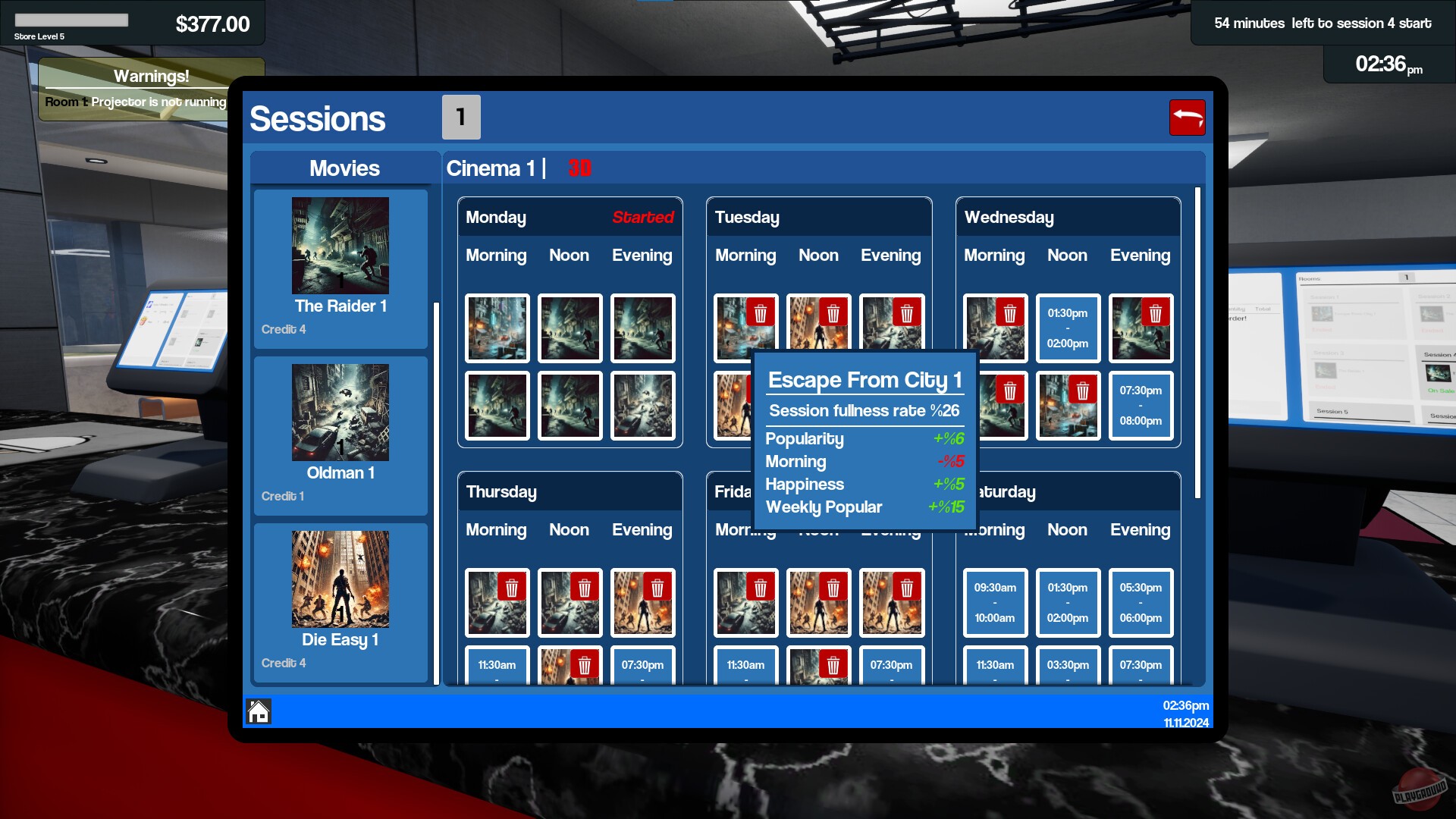 Нам достаётся небольшой кинотеатр. И теперь приходится разбираться со всеми прелестями управления — от закупки попкорна до уборки залов после сеансов. И в самом начале придётся всё делать самому: продавать билеты, готовить закуски, следить за чистотой. А ещё по ходу дела выясняется, что главная головная боль — это планирование сеансов. Нужно не только купить права на показ фильмов, но и решить, когда и по какой цене их крутить. Можно ставить дорогие билеты на популярные новинки или заманивать зрителей низкими ценами на старые фильмы.