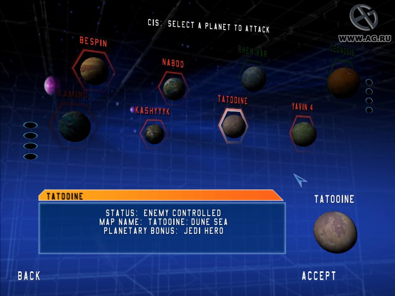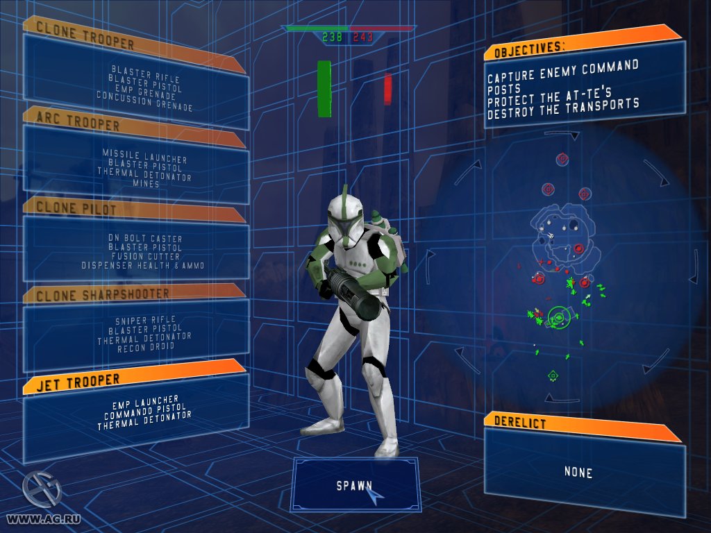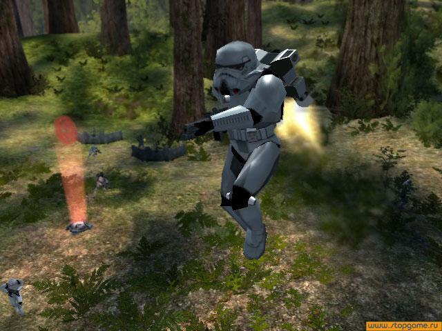 Sci-Fi клон Battlefield 1942. Нам представляется возможность поучаствовать во всех значительных битвах вселенной Star Wars (а их было не мало). 16 уровней на 10-ти планетах, 24 типа бойцов поделенных на четыре фракции (повстанци, Империя, клоны Республики и дройды Торговой федерации), 15 видов транспротных средств и поддержка сетевой игры до 64 человек, всё это вместе с именем известной вселенной дает неплохие шансы на успех проекта.