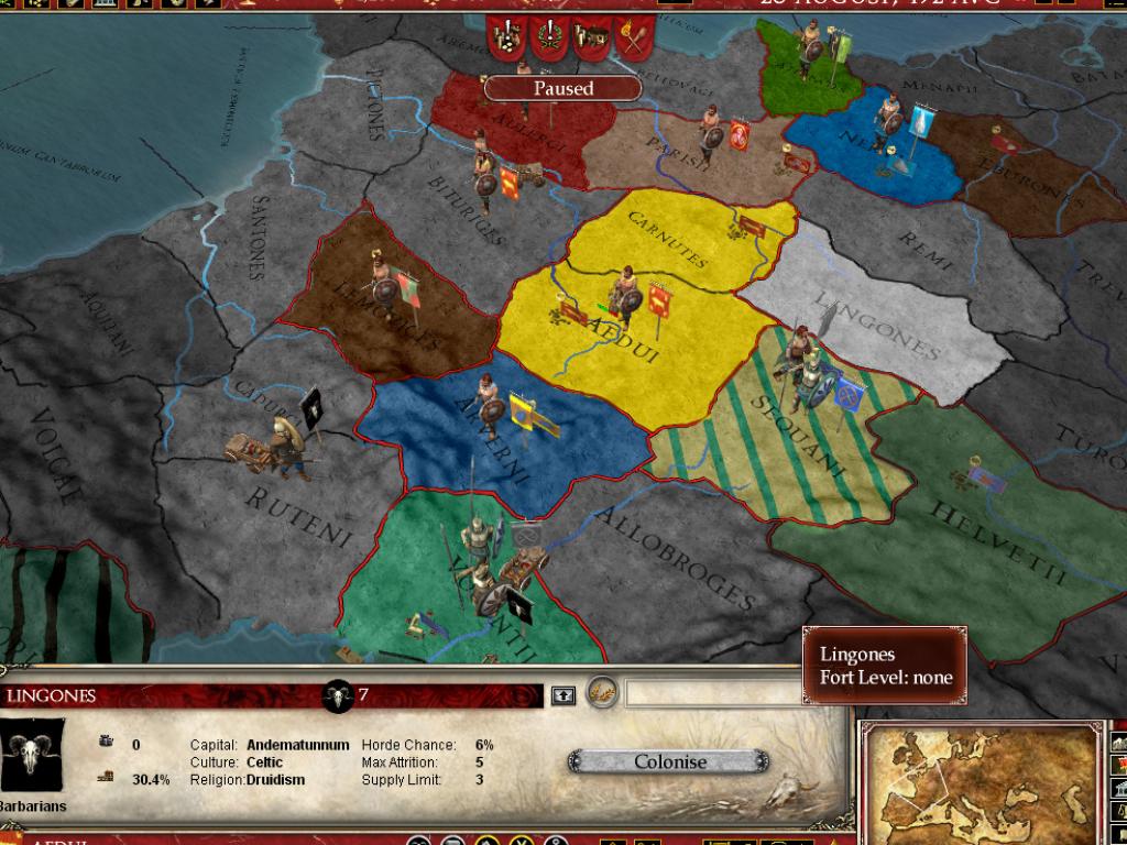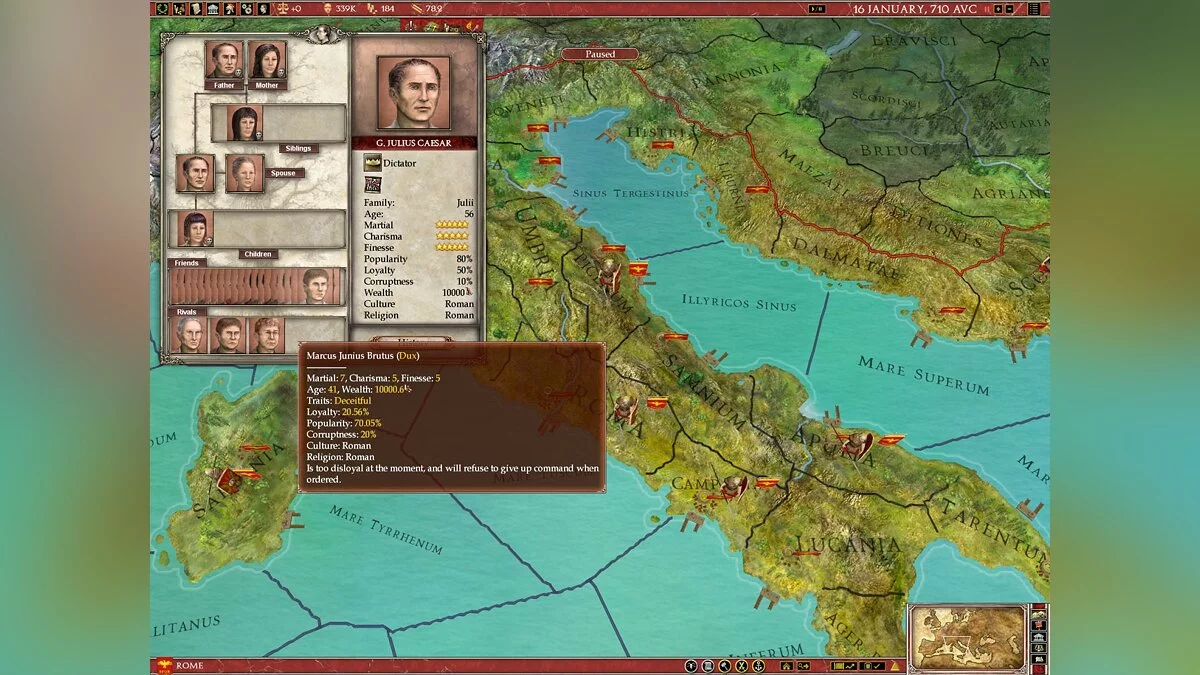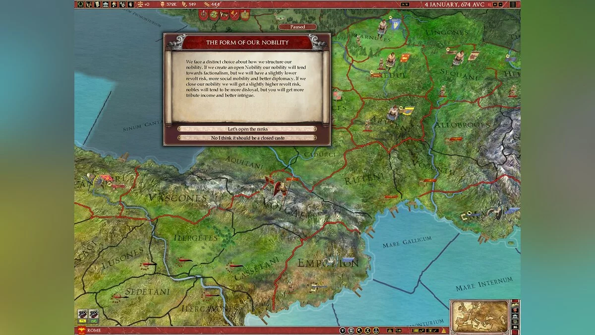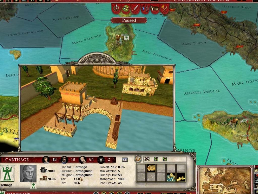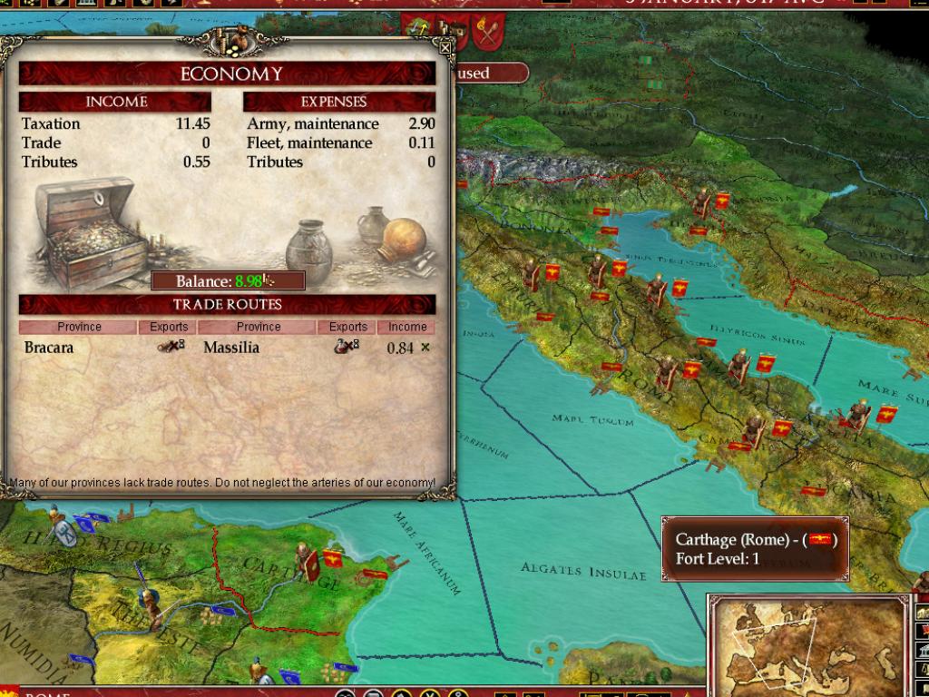 В Europa Universalis: Rome вы не просто управляете страной, вы становитесь ее душой и мозгом одновременно. Выберите одну из более чем 50 фракций — от могущественного Рима и коварного Карфагена до множества других народов, каждый со своей уникальной культурой и амбициями. Ваша задача? Расширять границы, укреплять экономику, плести интриги и следить, чтобы ваши граждане не устроили бунт из-за нехватки хлеба или цирковых представлений. Система управления ресурсами и населением здесь продумана до мелочей: в каждом регионе есть своя "биржа труда", где можно найти толкового министра или харизматичного посла, который не продаст вас за мешок сестерциев при первой же возможности. Это как Tinder для государственных служащих, только вместо лайков — доверие и эффективность.